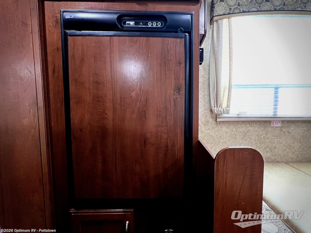 Along the opposite side of the expandable you will find a dinette and a refrigerator with overhead storage.