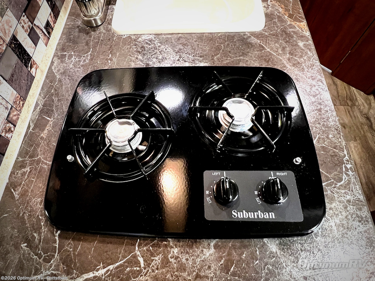 As you enter this expandable, to the right is a kitchen sink, two burner range, bench sofa, and overhead cabinets.