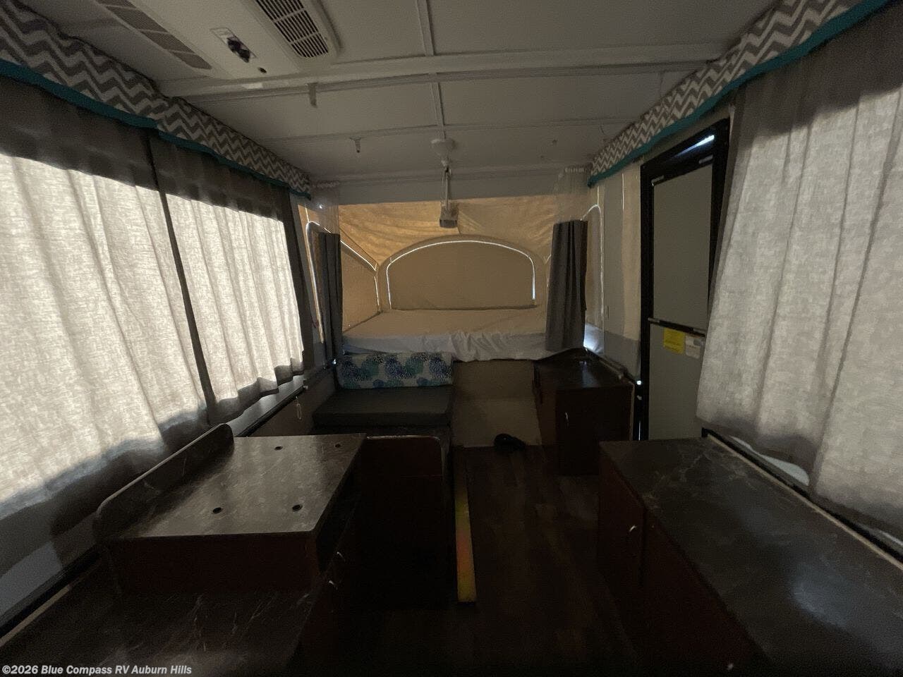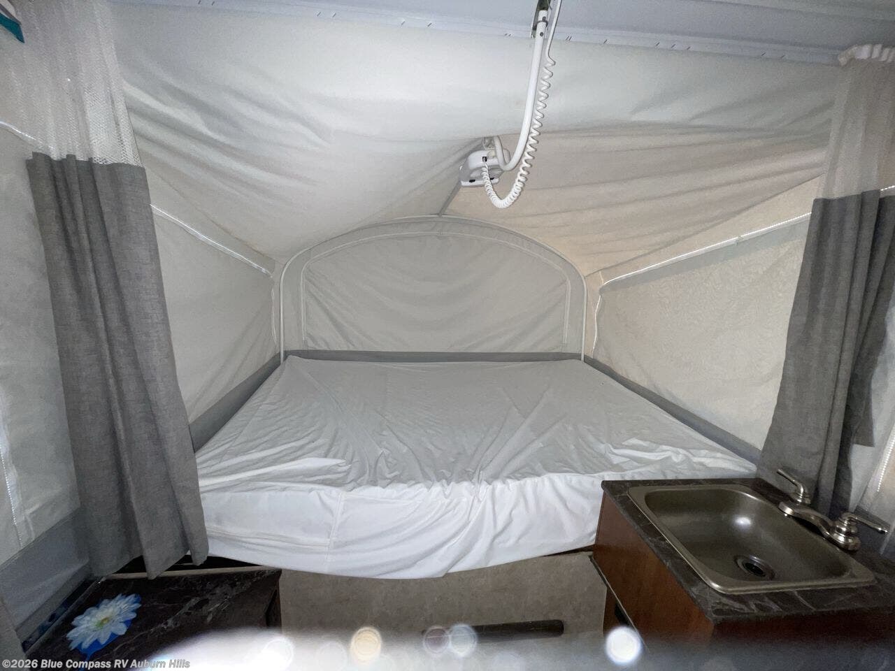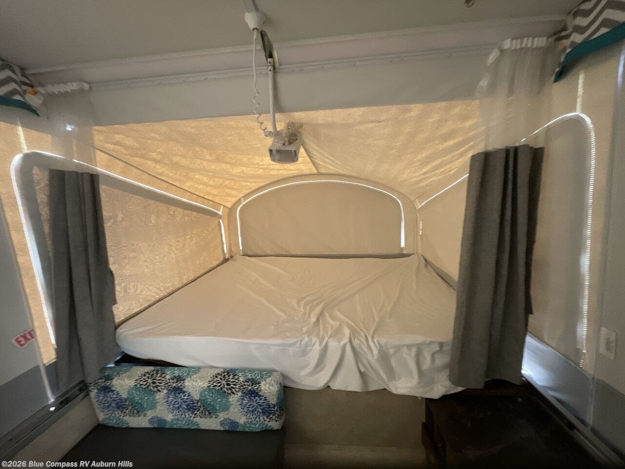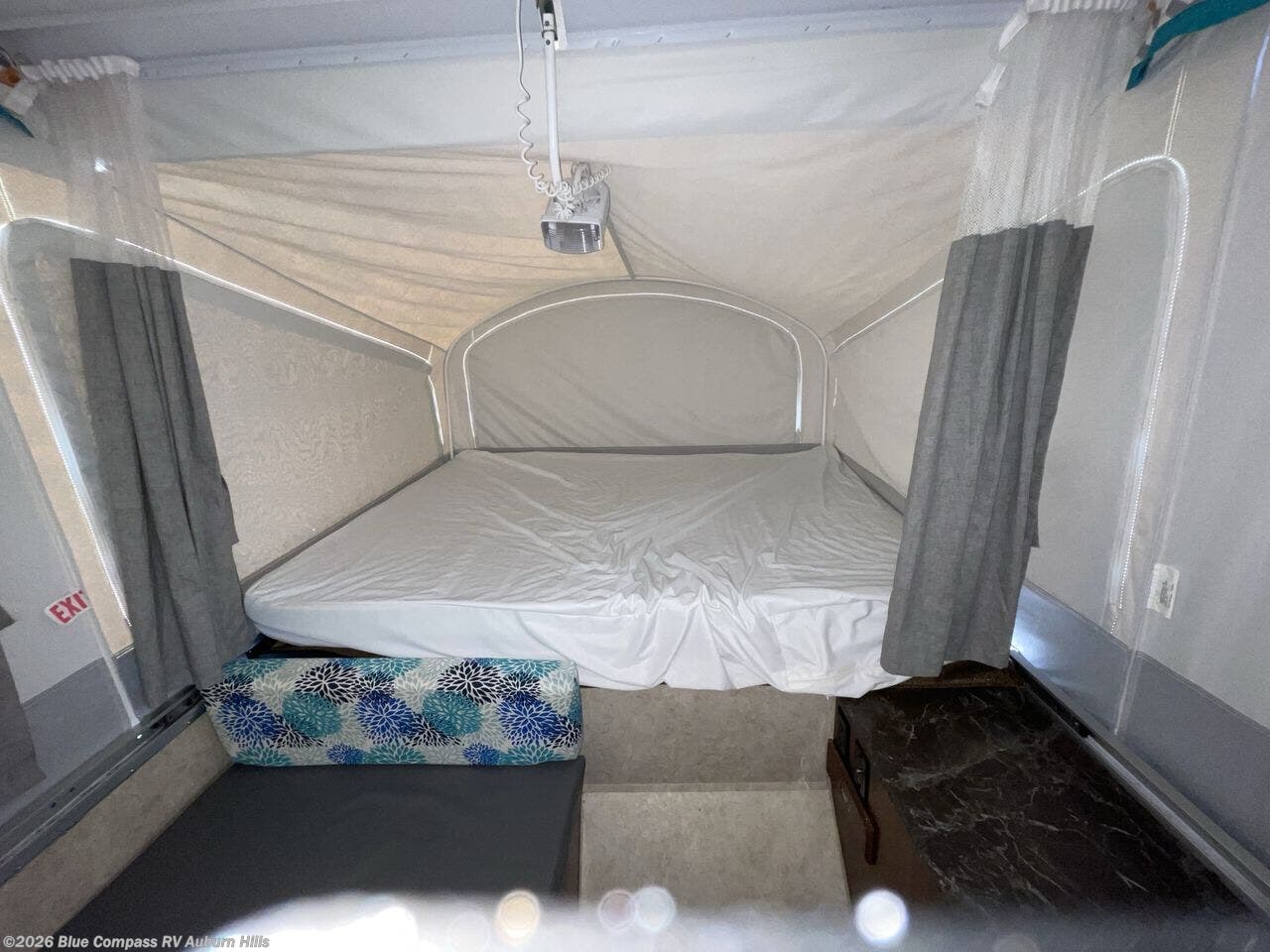 This Jay Series Sport 10SD folding pop-up camper by Jayco offers a rear full tent bed and a front queen tent bed.