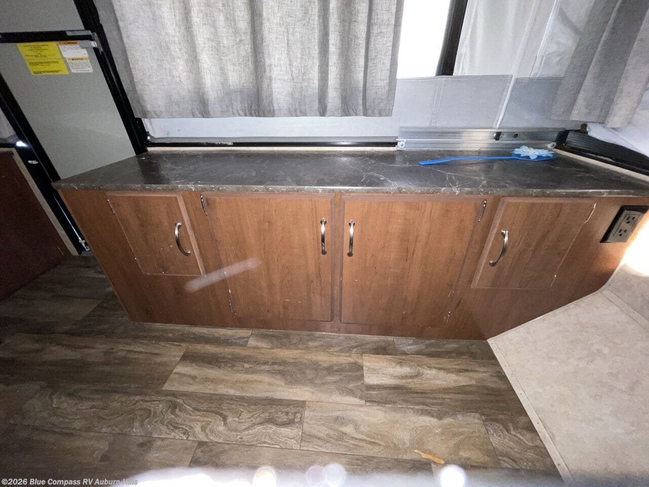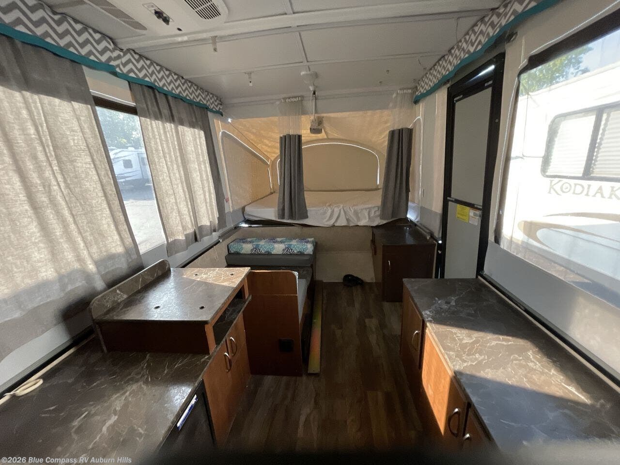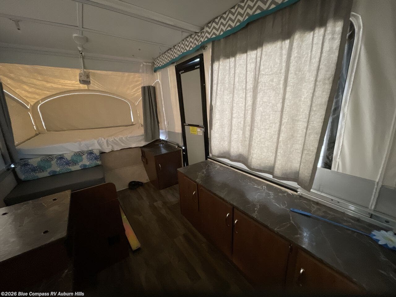 As you enter the camper, to the left there is a large storage cabinet. To the right of the entrance you will find a second storage cabinet. The opposite side of the camper offers a dinette, two burner range, and sink.