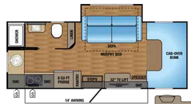 The Melbourne 24M is a rear kitchen/bath floorplan with a single roadside slide-out. With accommodations for up to five passengers, the 24M will sleep four.
