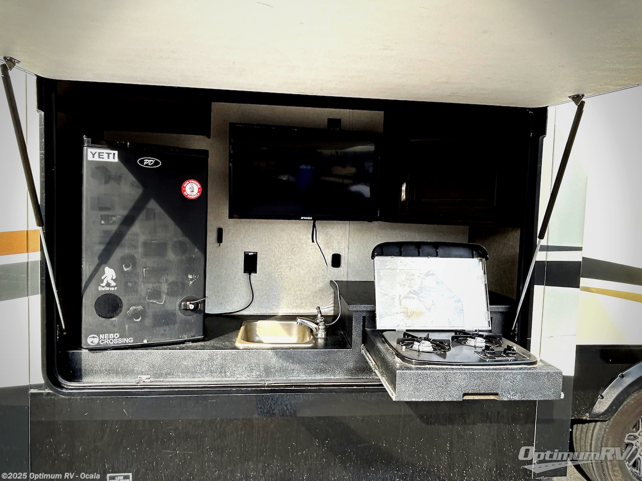 As you enter you will see an entertainment center with TV along the interior wall with storage. Adjacent you will find a slide out bi-fold sofa and booth dinette. You may even decide to choose the optional table and chairs in place of the dinette.