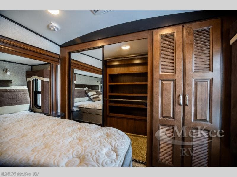 At the end of the hall enter the front bedroom where you can rest comfortably on a king bed slide out. There is a chest of drawers opposite with TV above, and a walk-in closet for all of your hanging clothes. You will also love the additional storage closet where you can add a washer and dryer if you choose.