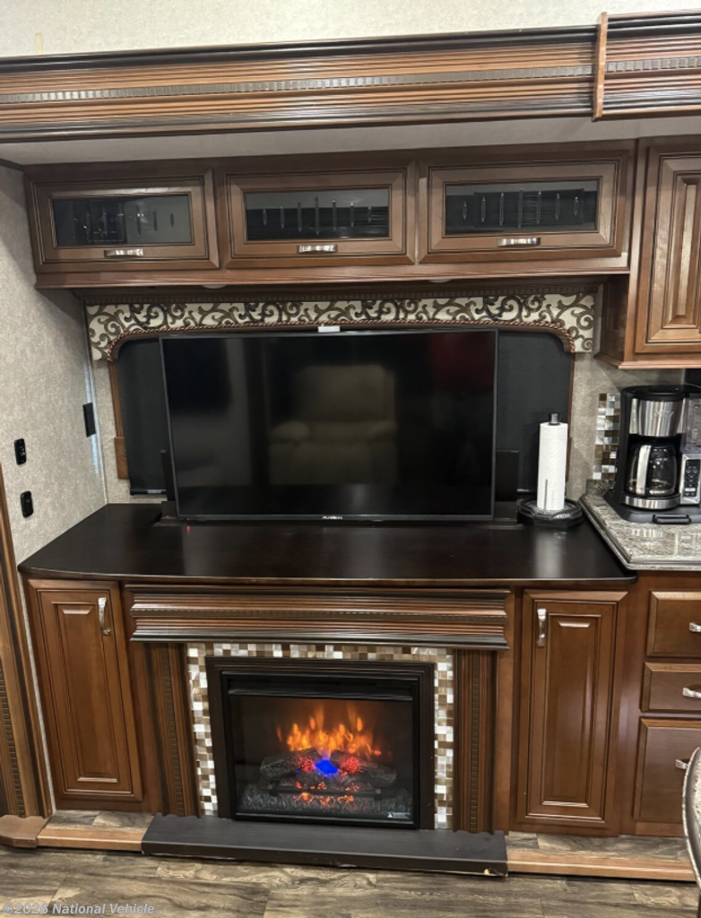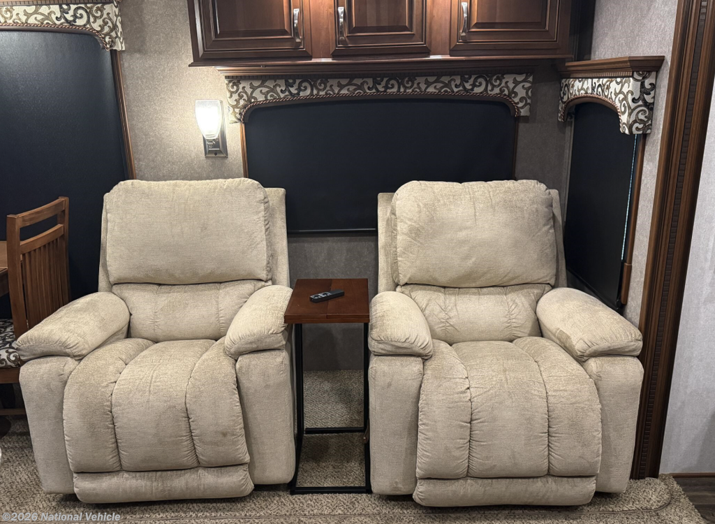 Inside, the spacious triple-slide floorplan creates a true residential feel. The rear den/living area has been beautifully upgraded, replacing the original loveseat and sofa with premium La-Z-Boy recliners and a reclining sofa for unmatched comfort. Surrounding the den is extensive custom cabinetry, providing an impressive amount of storage while adding to the upscale residential feel of the space. A cozy electric fireplace and large TV make this a perfect place to relax after a day of travel.