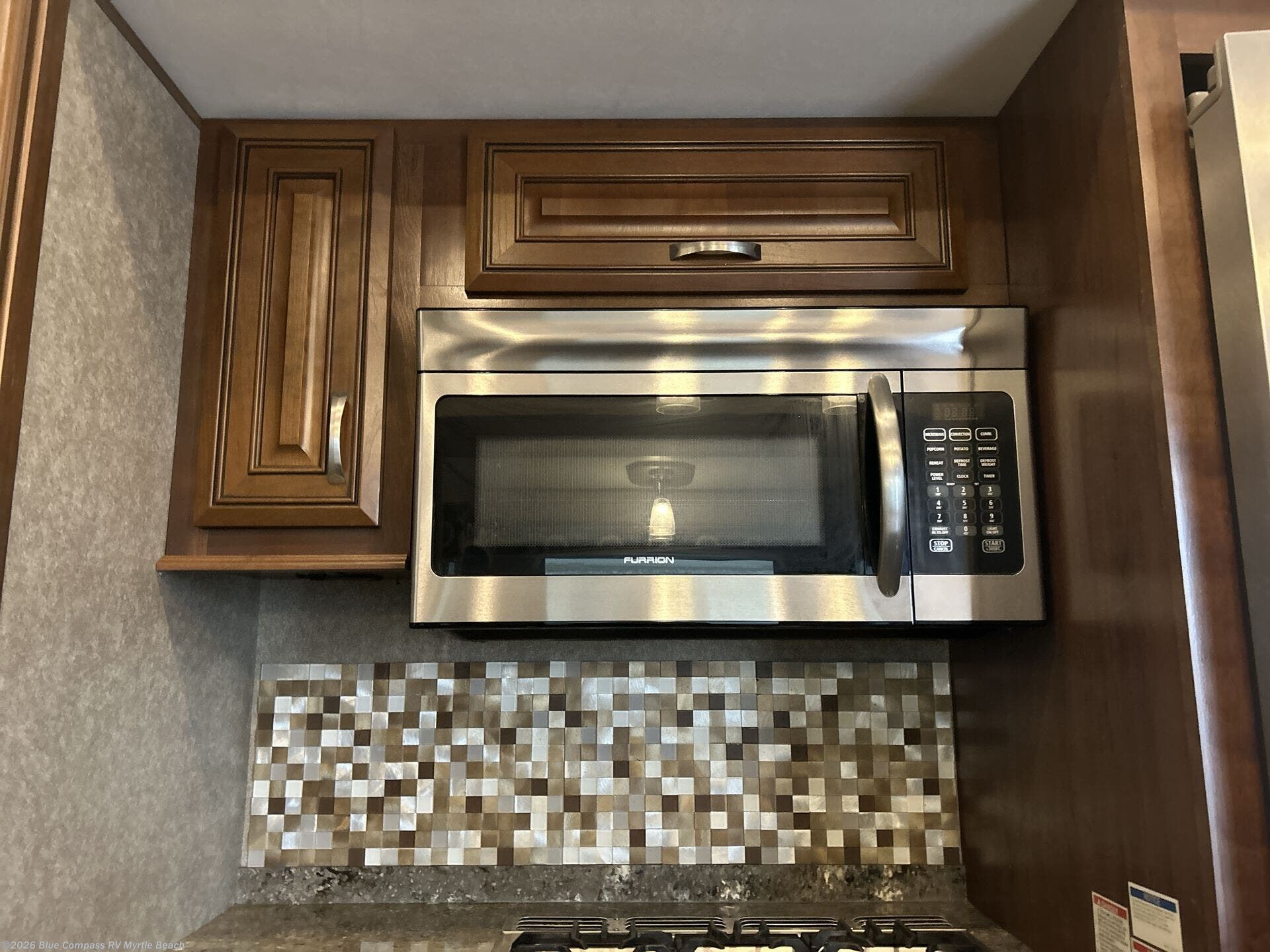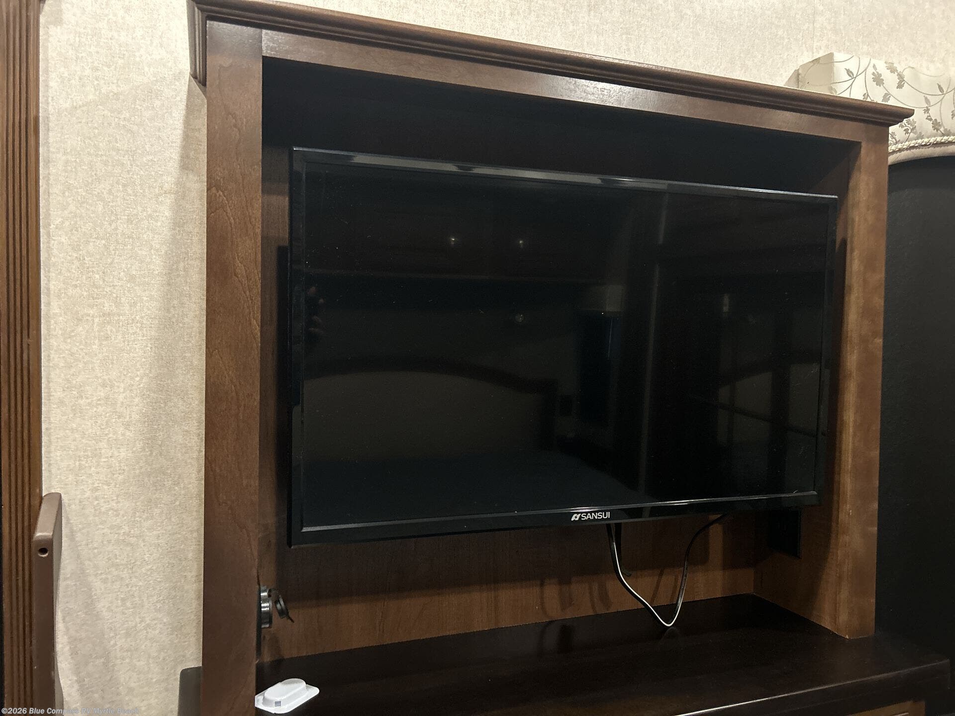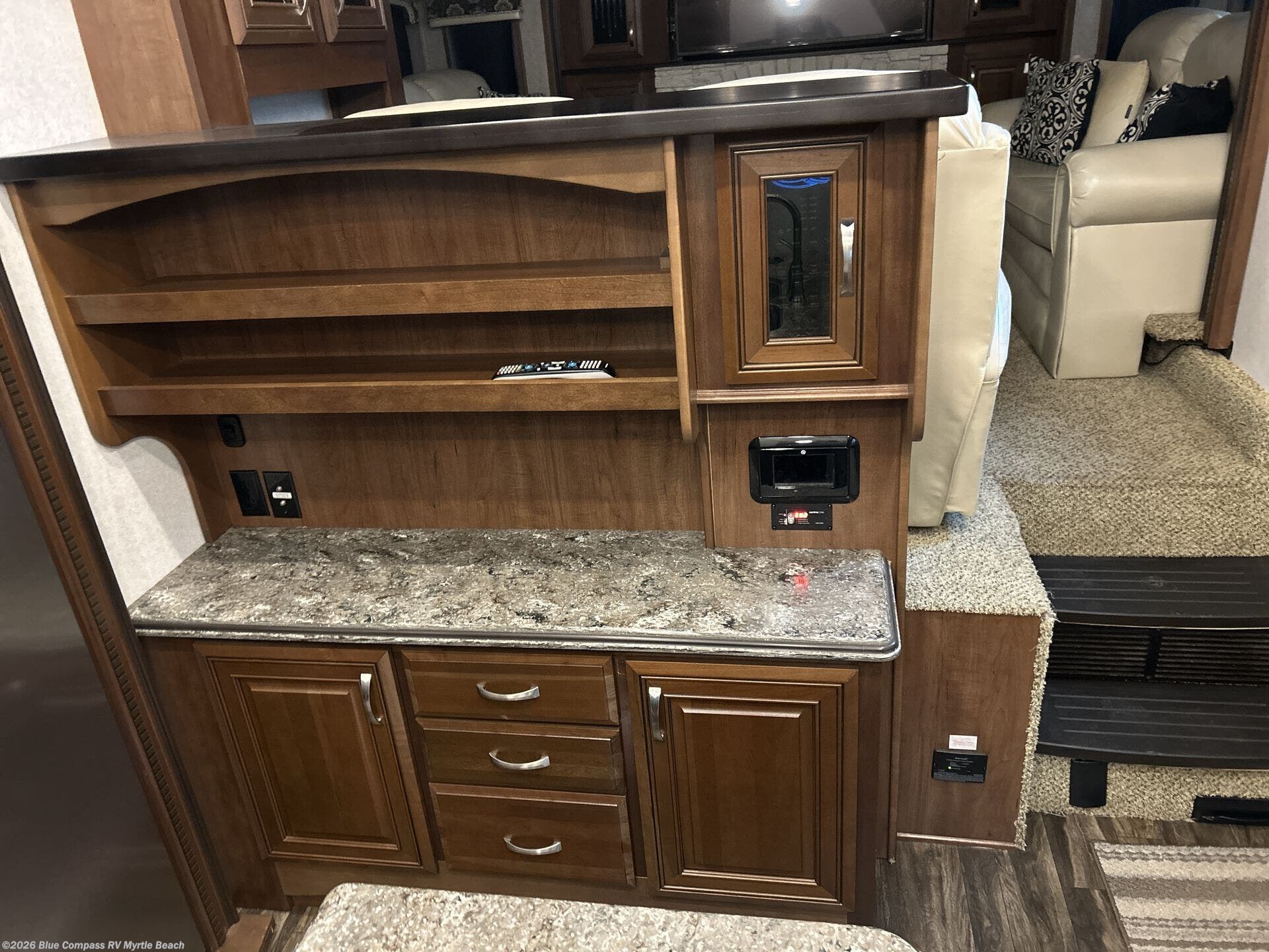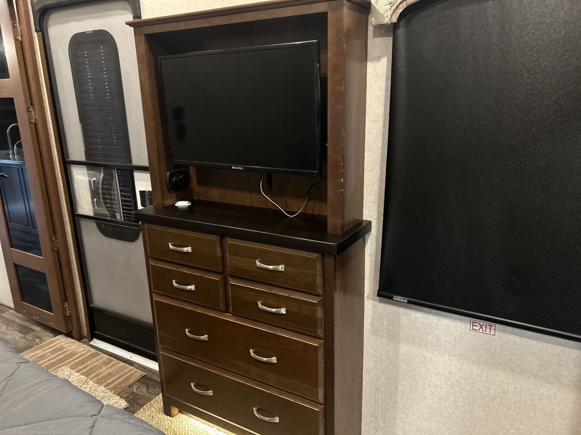 In the rear bedroom there is a king bed slide with shelves and overhead cabinets or you can choose an optional queen with chest storage on either side, a walk-in closet, and a chest with a TV above the chest. In the corner of the room you will find that it has been prepped for a washer and dryer. The second entrance/exit to the fifth wheel is in the bedroom.