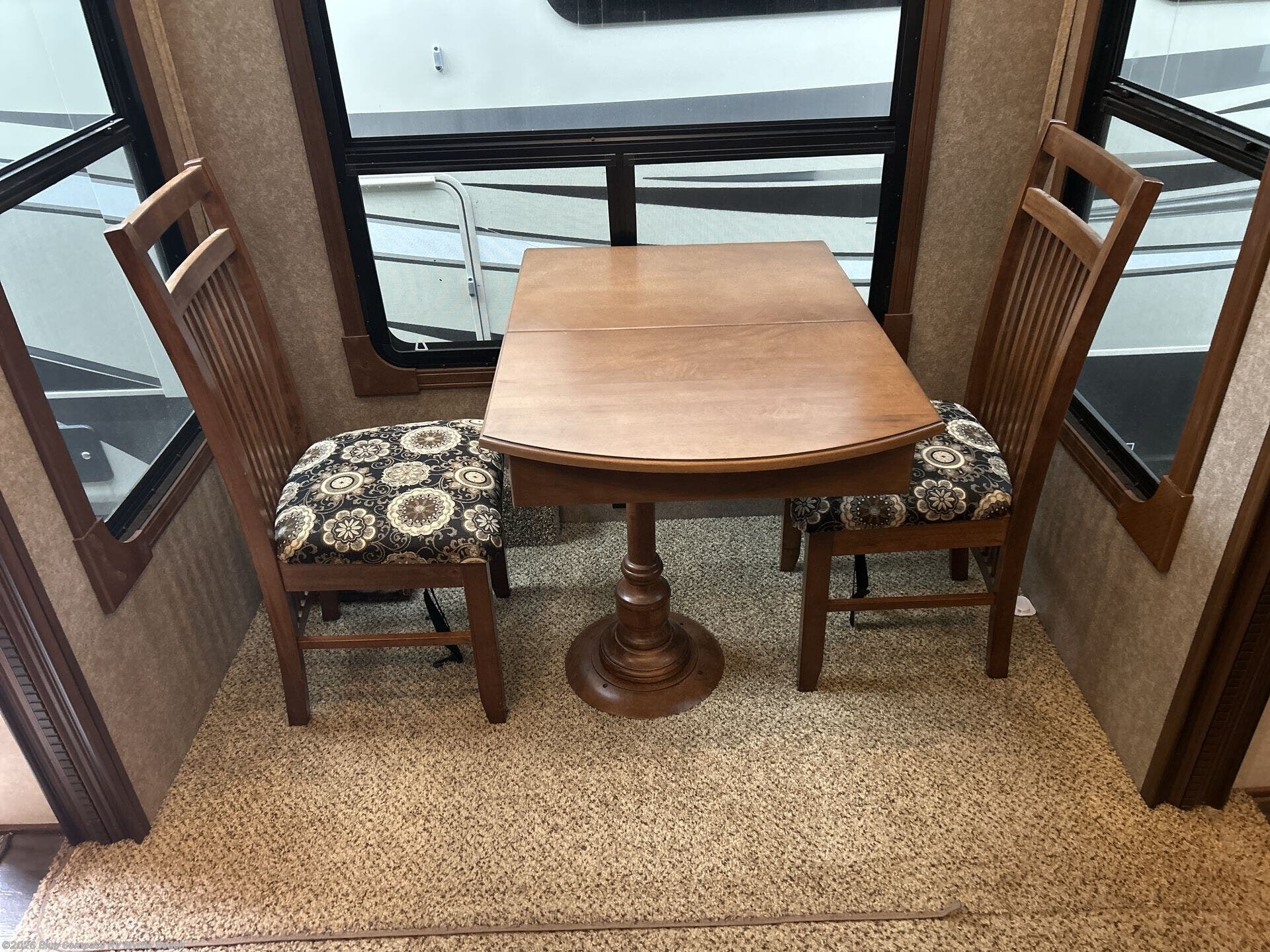 As you enter the main entrance, to the left there is a slide out with a free-standing table and chairs. Straight ahead is a bench, storage, and overhead cabinets.