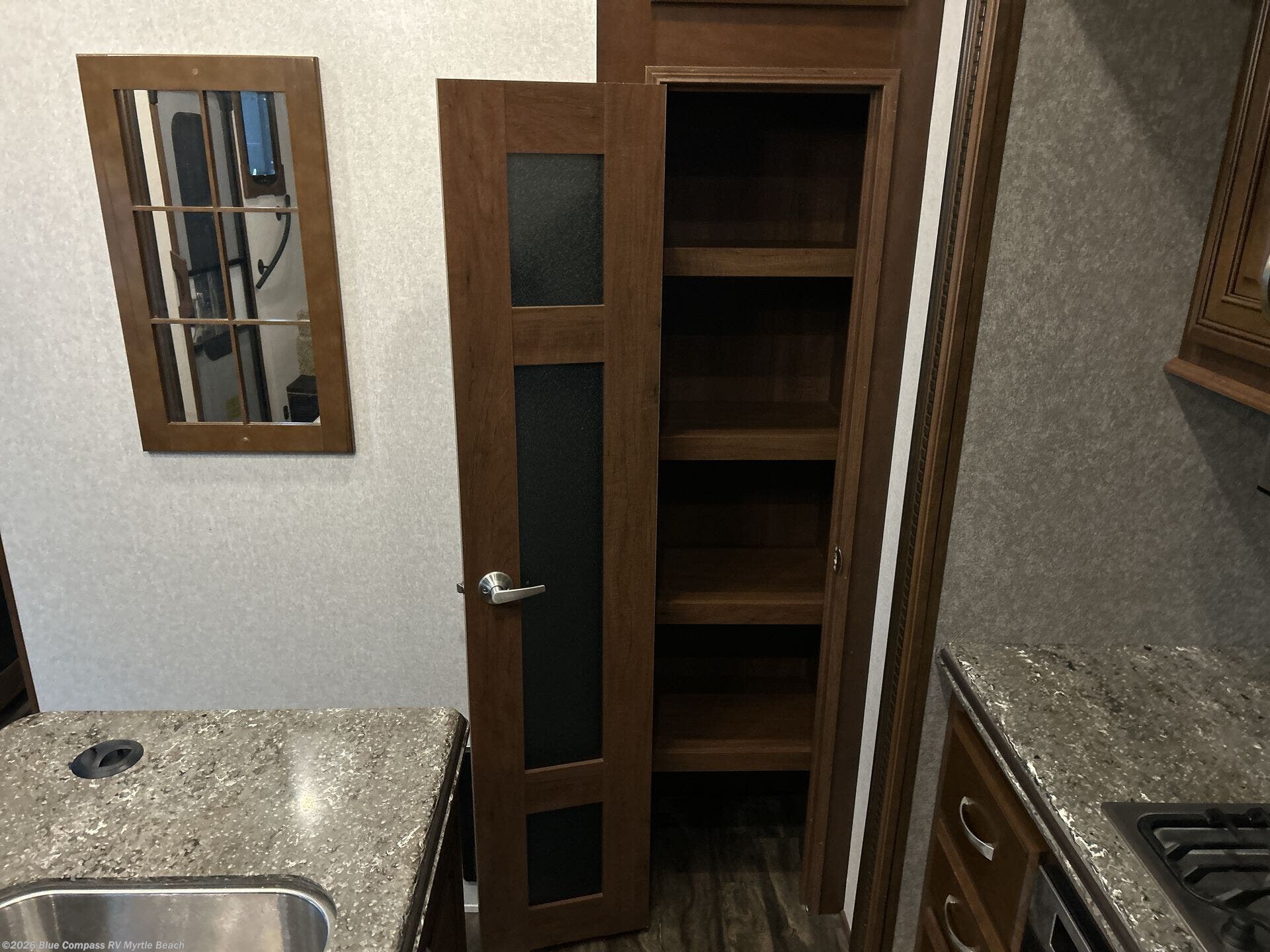 The opposite side of the kitchen has a slide out with a three burner range, microwave, and a residential refrigerator, or you can choose an optional 18 cu. ft. refrigerator. Next to the slide you will find a pantry which is ideal for storing your dry goods. The kitchen island provides extra counter space and a double kitchen sink.