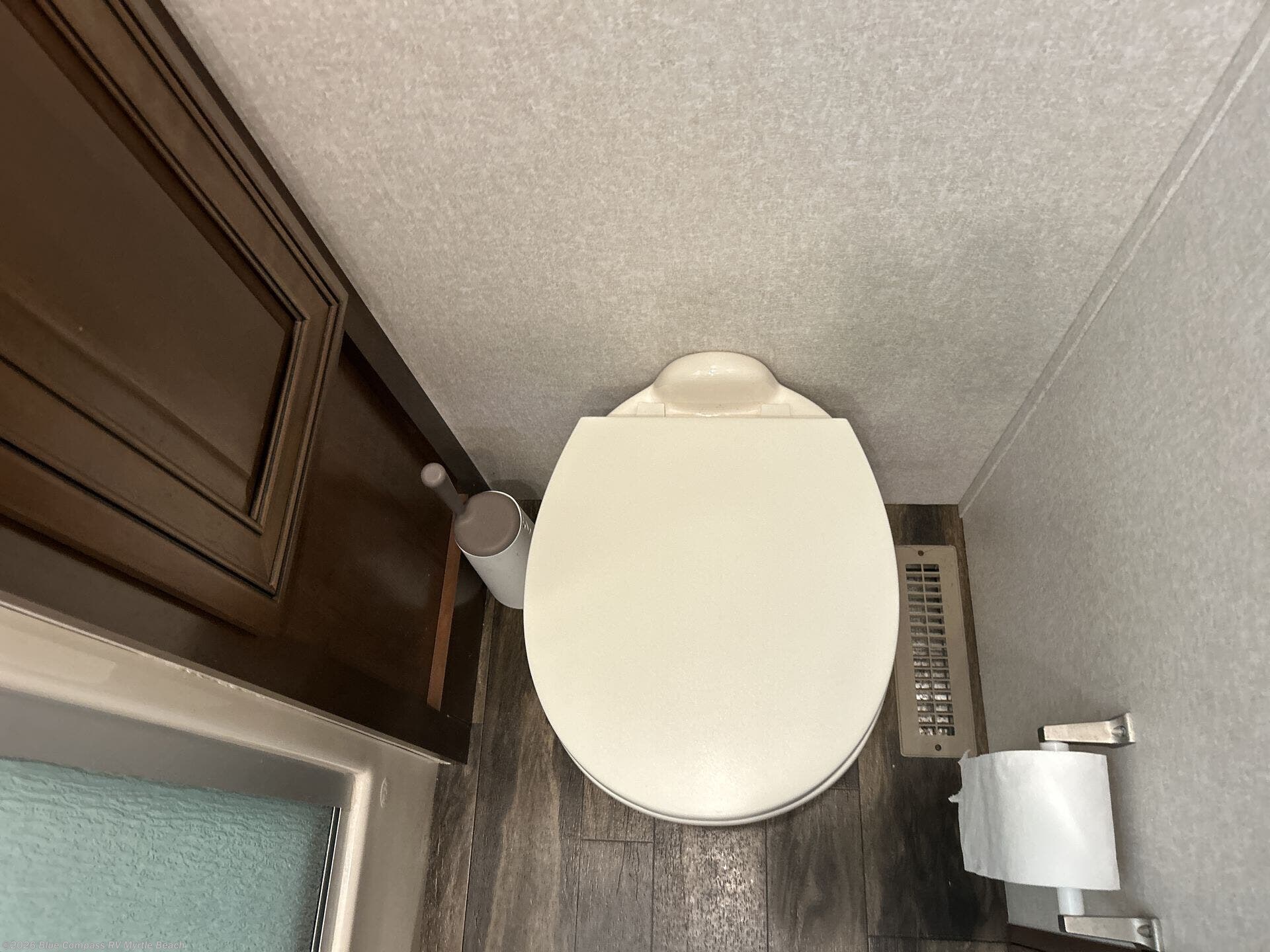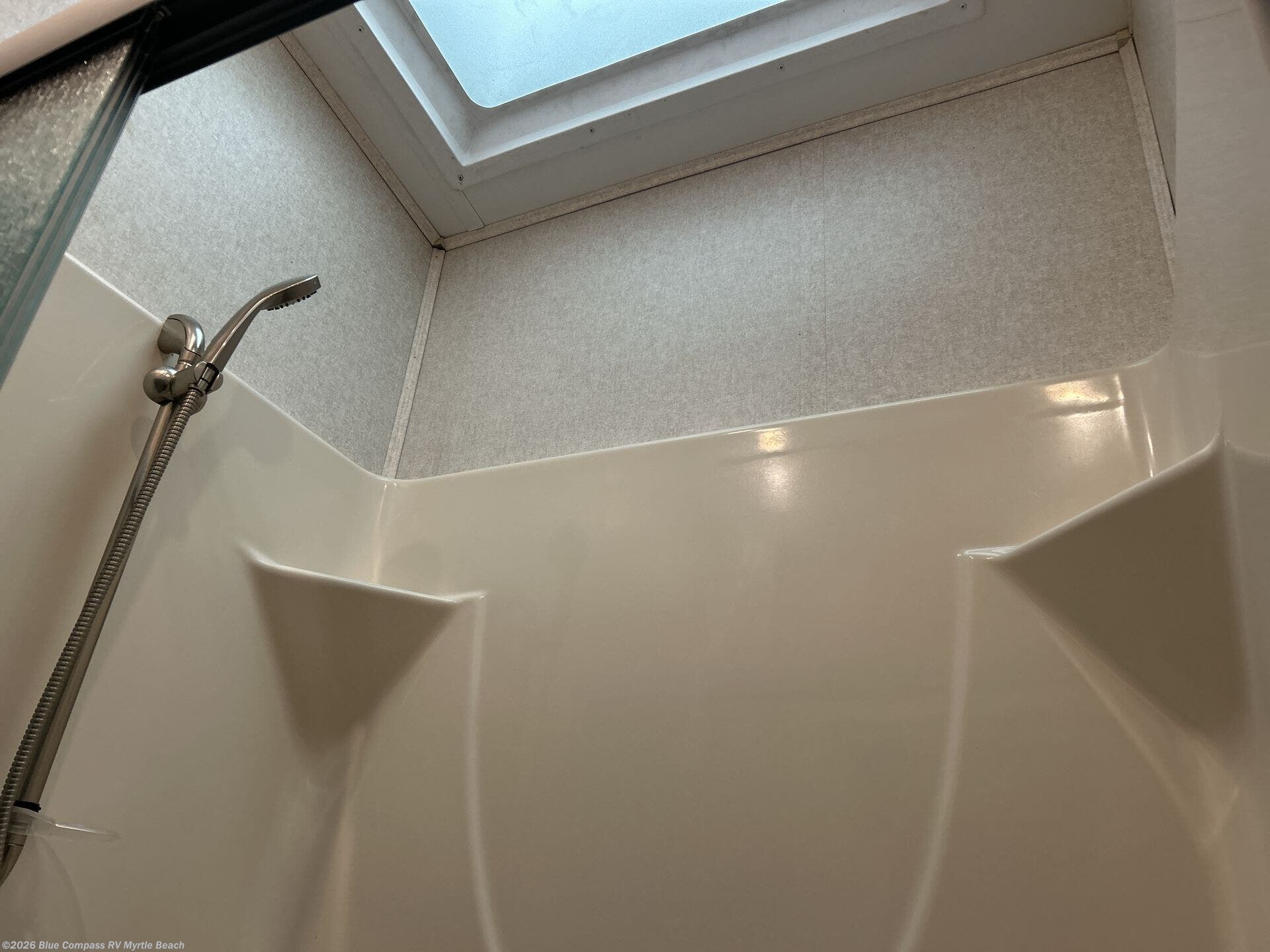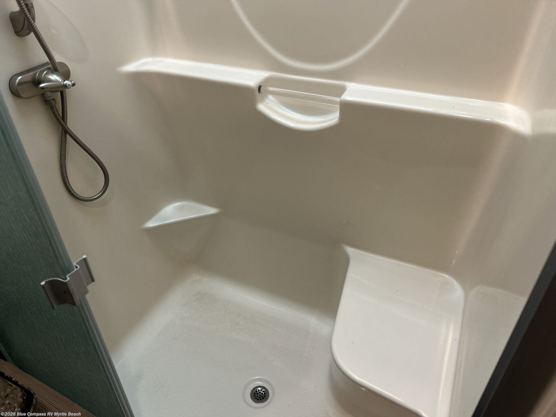 Heading towards the rear, the bathroom is before the bedroom. There is a shower with a seat, sink, medicine cabinet, linen storage, and a toilet.