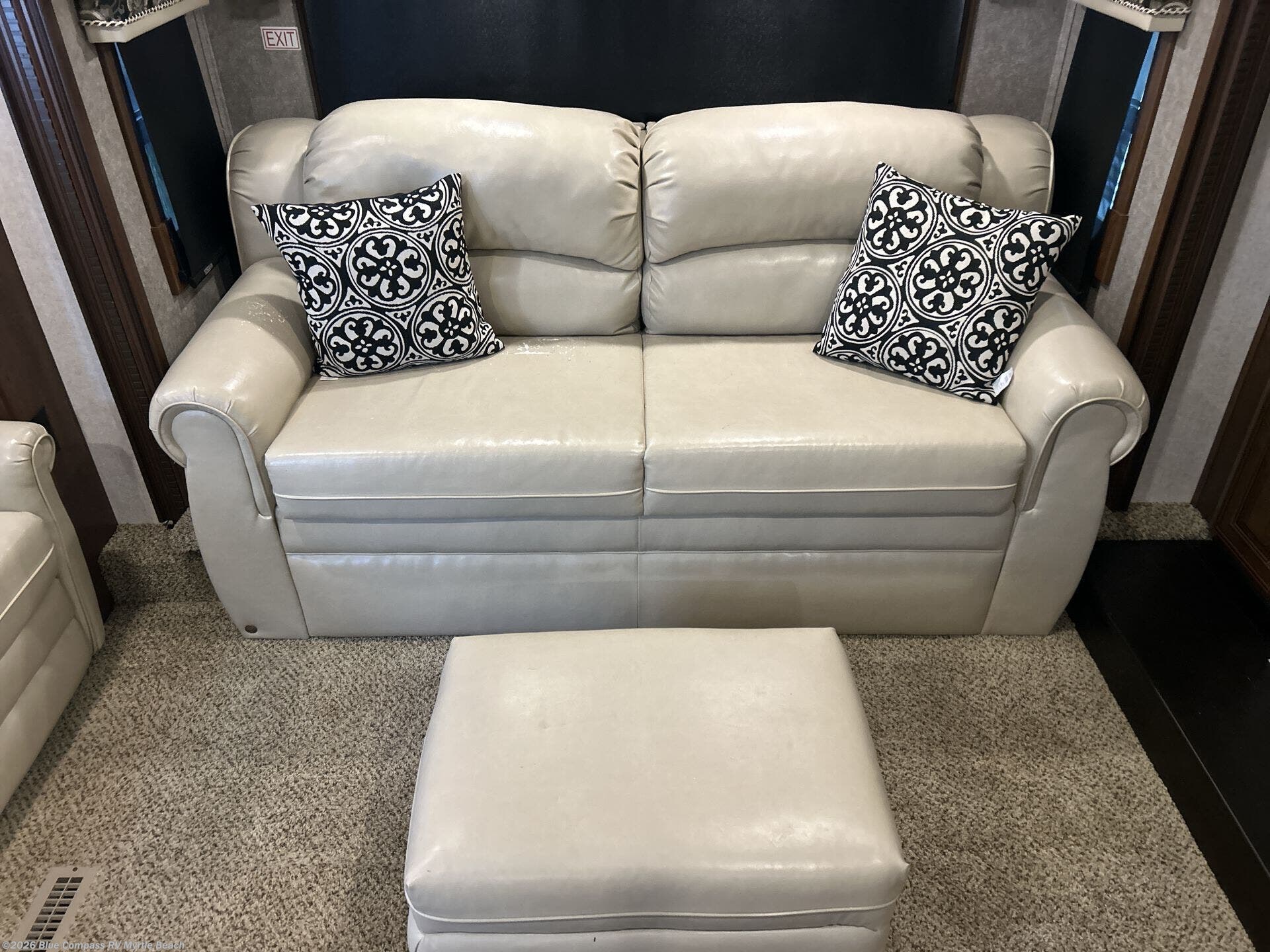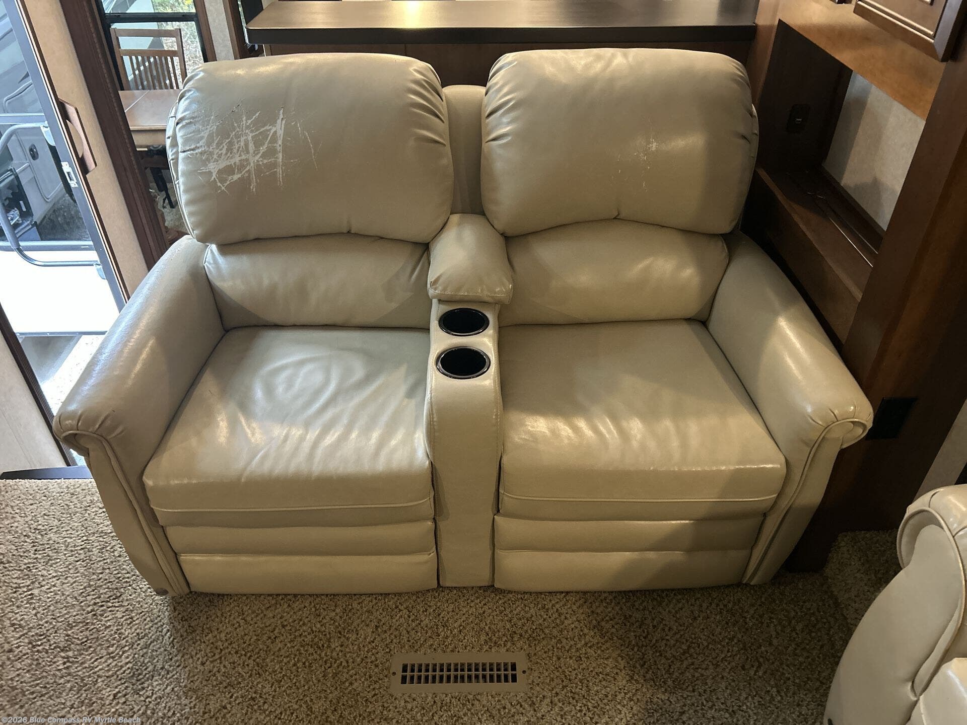 Stepping up the stairs you will find the front living area which seats at least eight people plus plenty of floor space for more family and friends! There are two theater seats along the interior wall, a slide out tri-fold hide-a-bed sofa with ottoman, a second slide with a bi-fold hide-a-bed sofa, and a full wall entertainment center with a TV and Ledgestone surround fireplace and cabinets. This space will become the main hangout during the big games or rainy days.