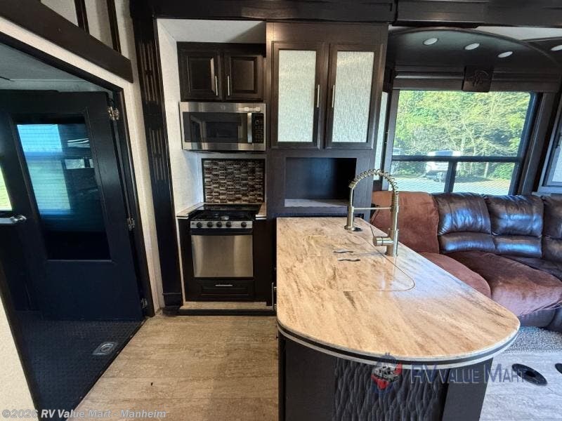 The main living area has dual slides which help to open up the fifth wheel. The first slide has a refrigerator, and a TV lift. On the opposite side find a sofa with folding backrest, counter with double kitchen sink, three burner range, microwave, and overhead cabinets. You will also find a corner pantry where you can store your canned goods.