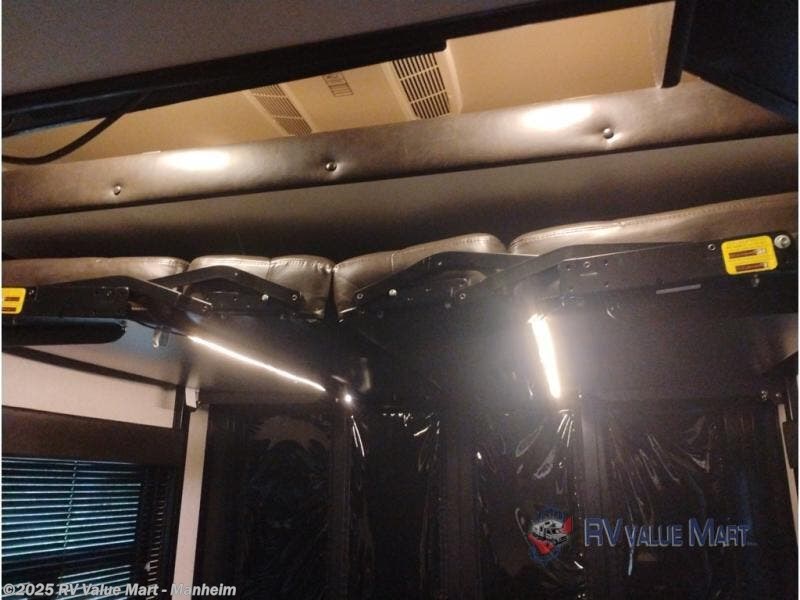 Enter the cargo area through the side man door and find that there is 9'2" of cargo space along the curb side and 11'8" of cargo space along the road side. Enjoy meals around the dual sofas and cargo table, and at night you can use the sofas for additional sleeping space. Above find a power queen bed that can easily be lowered. The cargo area has a TV, and a half bath with a toilet, sink, and medicine cabinet.