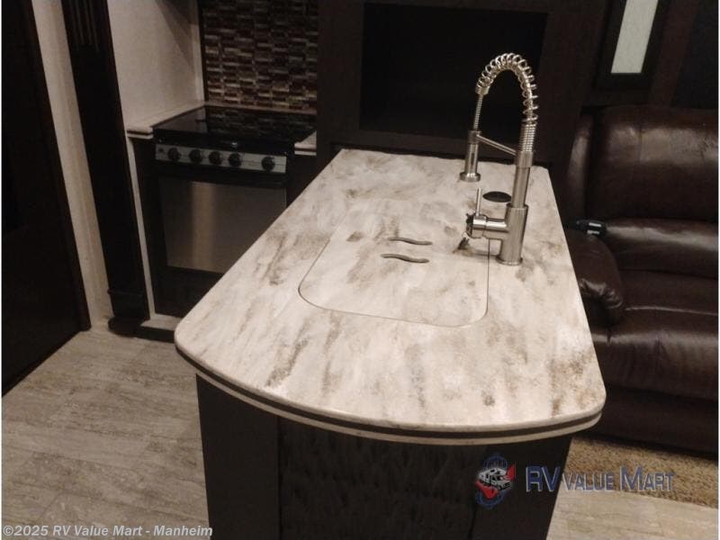 The main living area has dual slides which help to open up the fifth wheel. The first slide has a refrigerator, and a TV lift. On the opposite side find a sofa with folding backrest, counter with double kitchen sink, three burner range, microwave, and overhead cabinets. You will also find a corner pantry where you can store your canned goods.