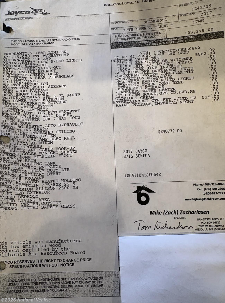 Request More Info on this 2017 Jayco Seneca 37TS Offered for sale by National Vehicle