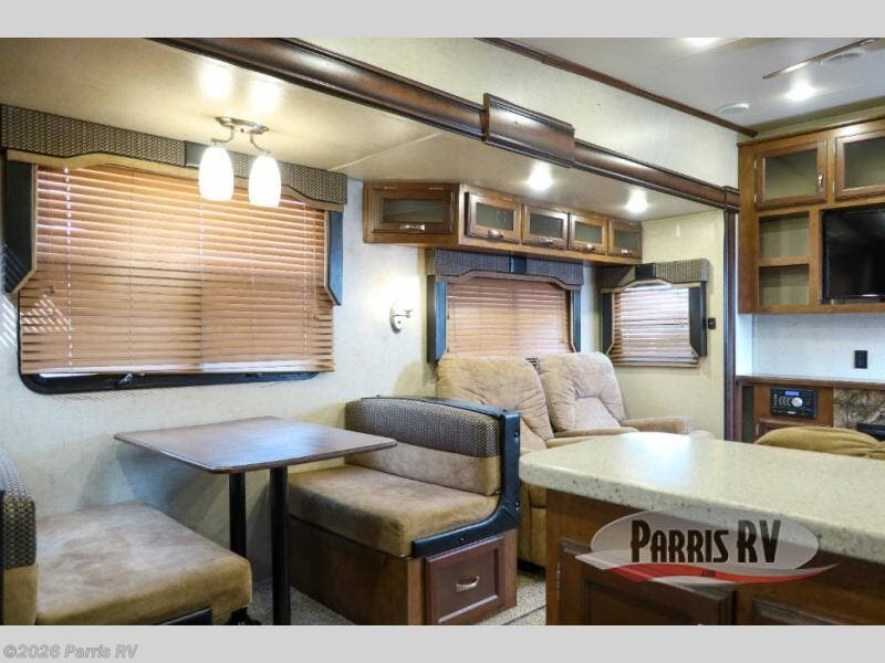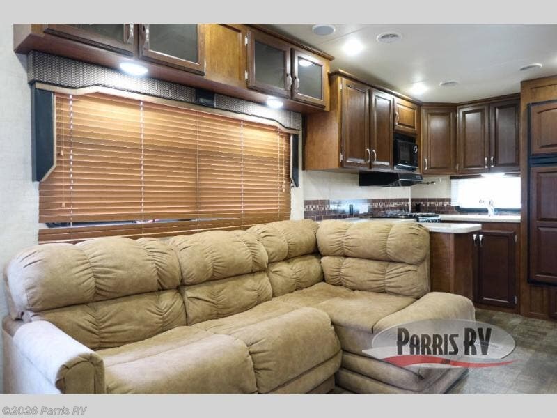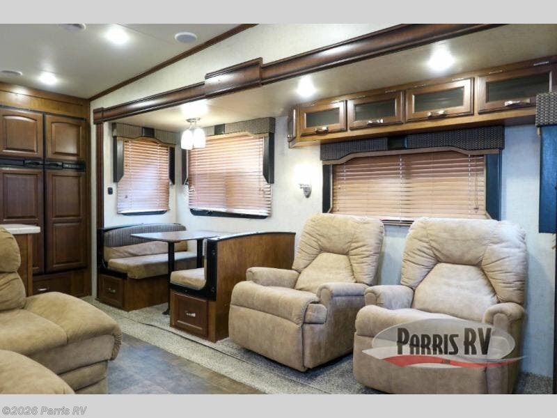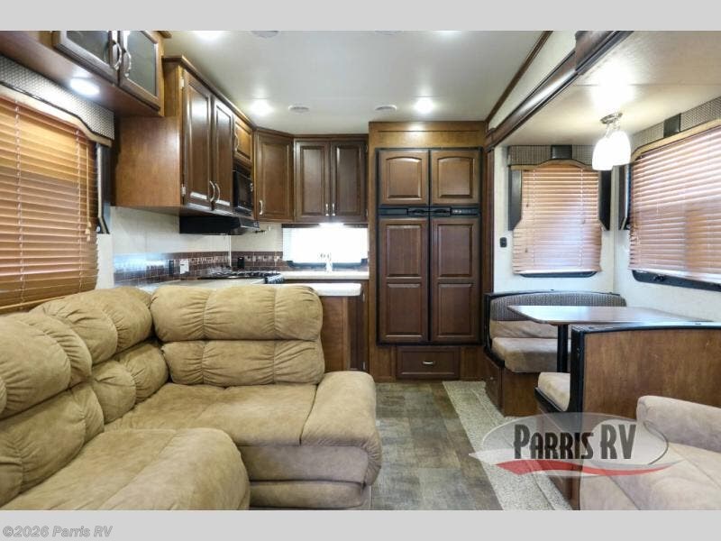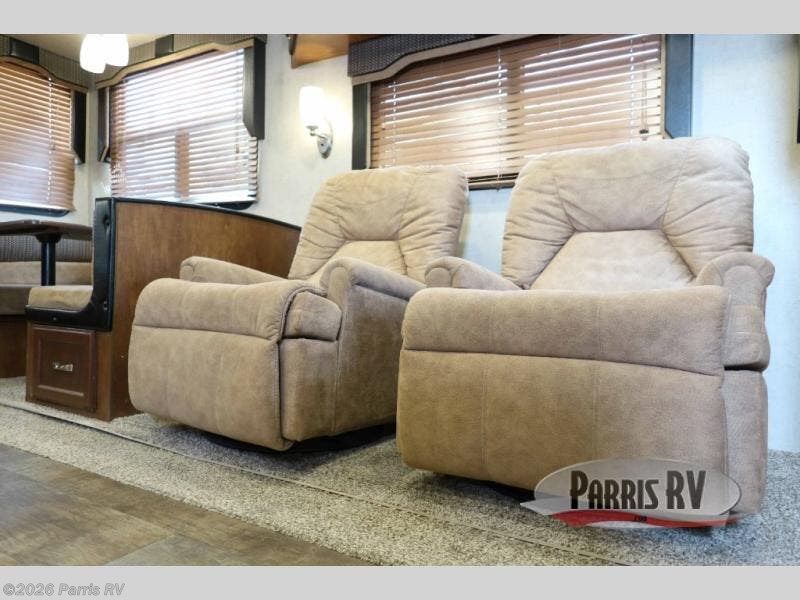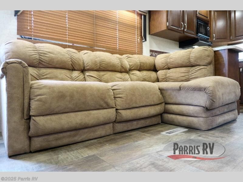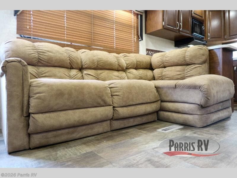 The slide in the main living area helps to open up the floor space and gives a more homey, spacious feel to the fifth wheel. Along the left side of the entrance there is an L-shaped deluxe sectional bed. On the opposite side the slide features an optional table and chairs, and two recliners. Adjacent to the slide there is a nice size entertainment center.