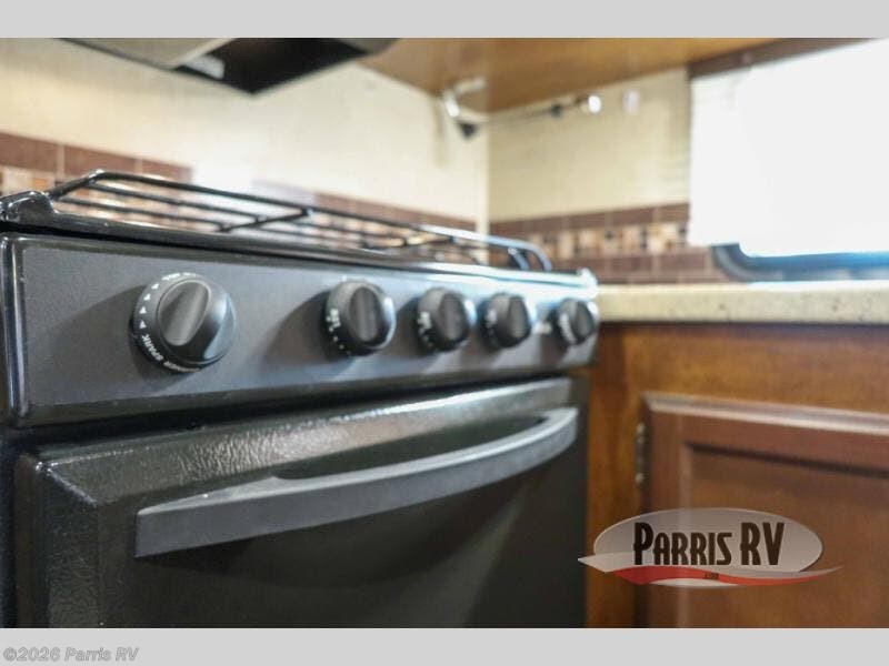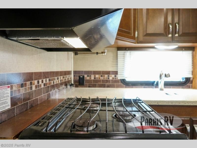 Along the rear you will find the kitchen area. There is a pantry, refrigerator, double kitchen sink, three burner range, and an L-shaped counter.