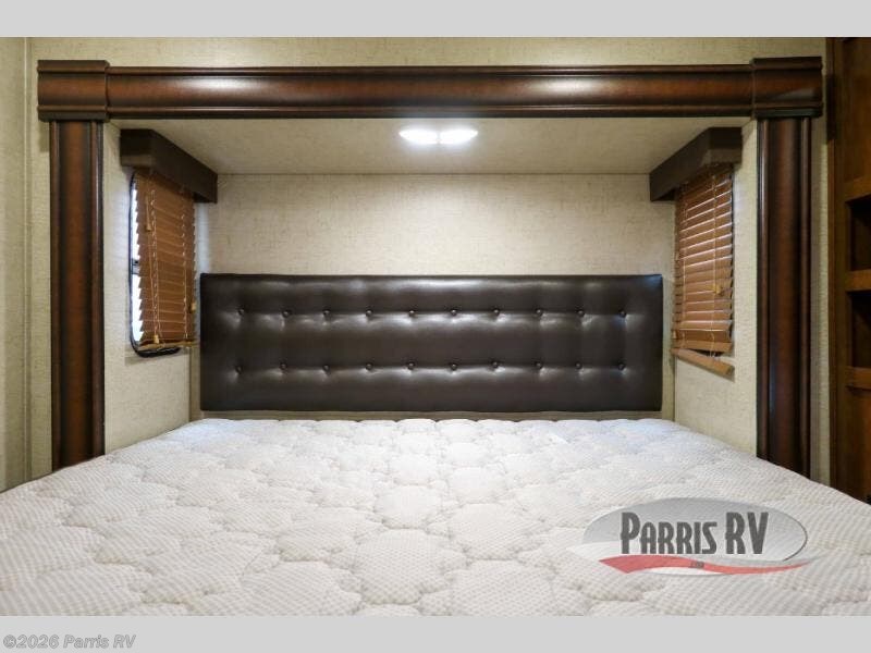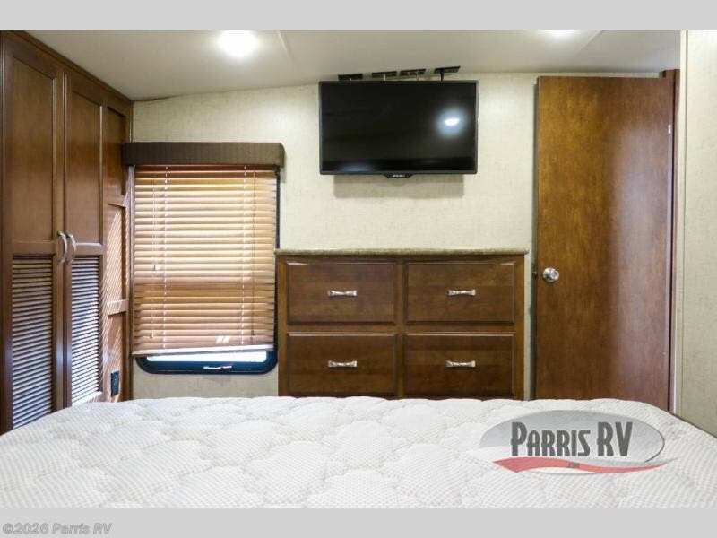 The front bedroom has a slide out with a queen bed or an optional king bed. Across from the bed there is a dresser, and along the front wall of the room you will find a large wardrobe and a washer/dryer prepped space.