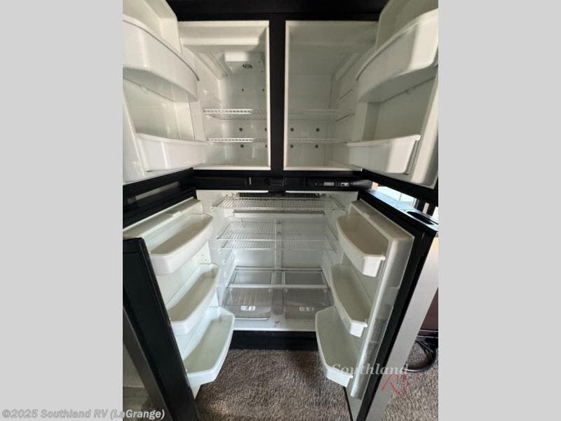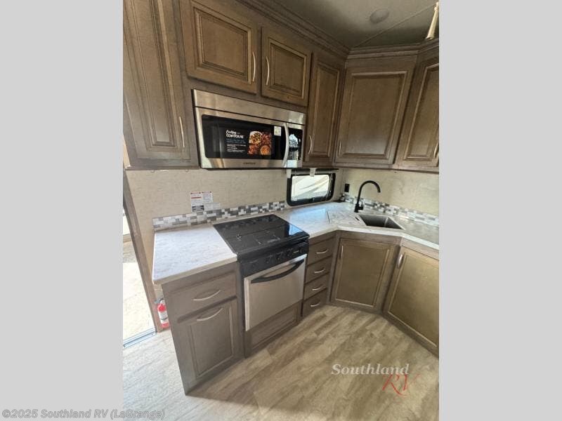 As you enter the fifth wheel, along the curb side there is a pull out trash can, three burner range, and a double kitchen sink in the corner, plus additional counter space along the interior wall. On the opposite side you will find a slide with a refrigerator and a table with chairs. You can even choose an optional 12 or 18 cu. ft. refrigerator. Adjacent to the slide there is a large countertop with charging station and a hutch.