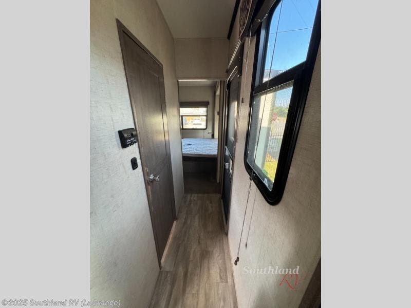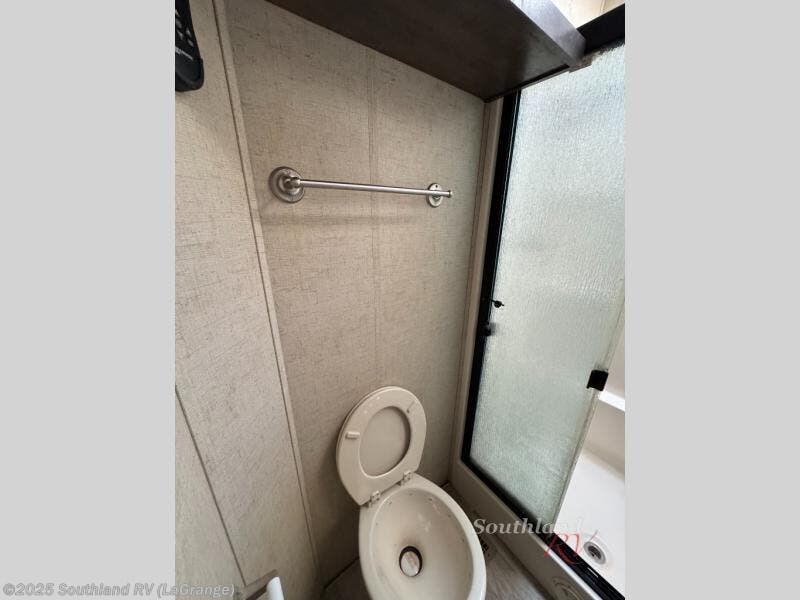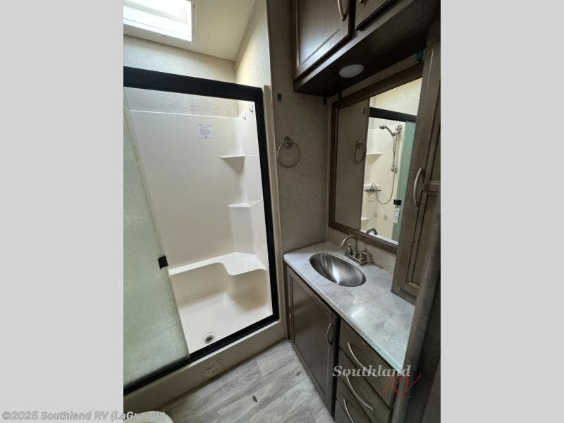 As you proceed towards the rear of the fifth wheel the bathroom is on your left. Inside the bathroom there is a toilet, a residential shower with seat, sink, and a medicine cabinet. The second entry into the fifth wheel is across from the bath along the road side wall.