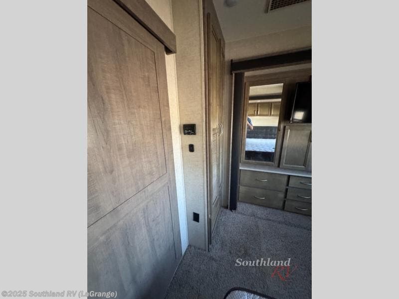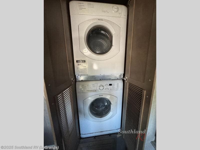 In the rear bedroom you will find a road side slide with a king bed or you can choose an optional queen bed. Across from the bed there is a slide with a wardrobe and TV. The bedroom is also washer/dryer prepped for your convenience.