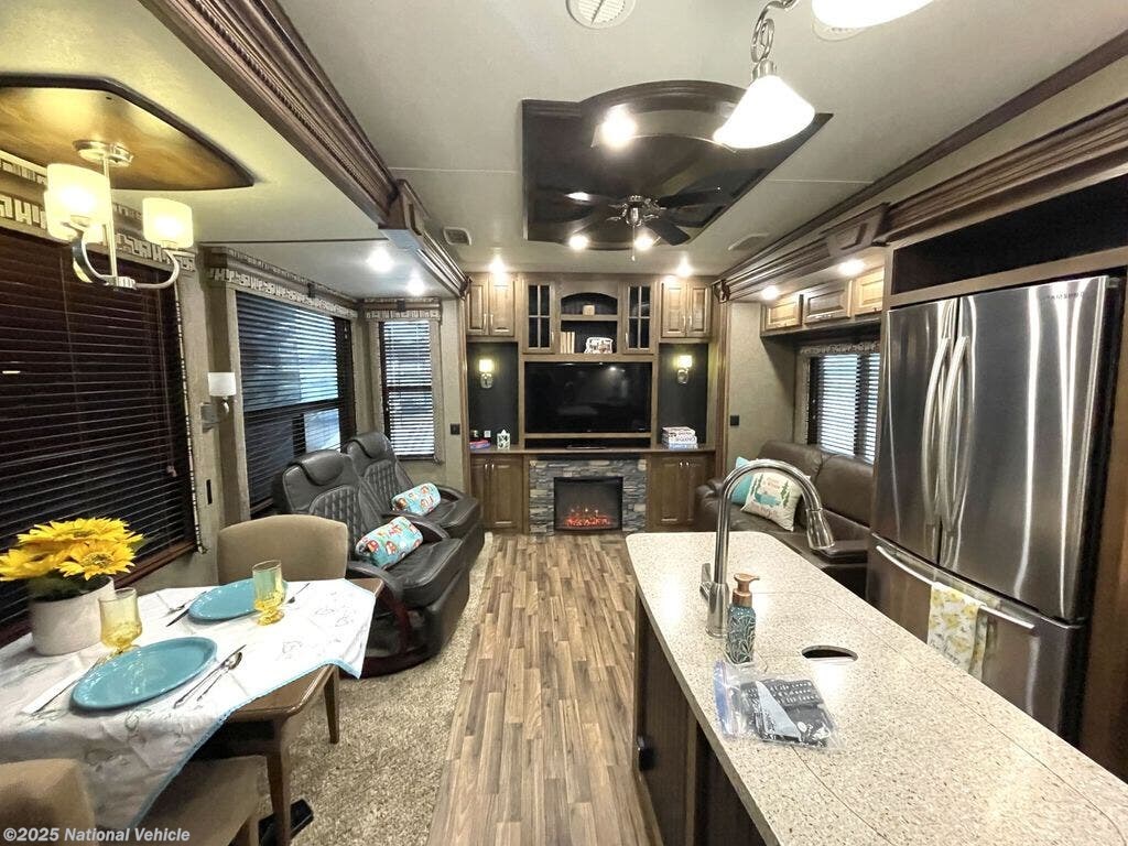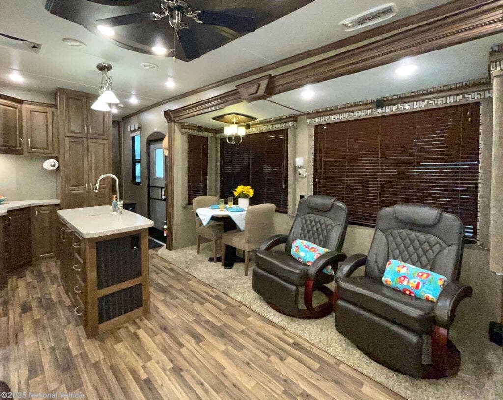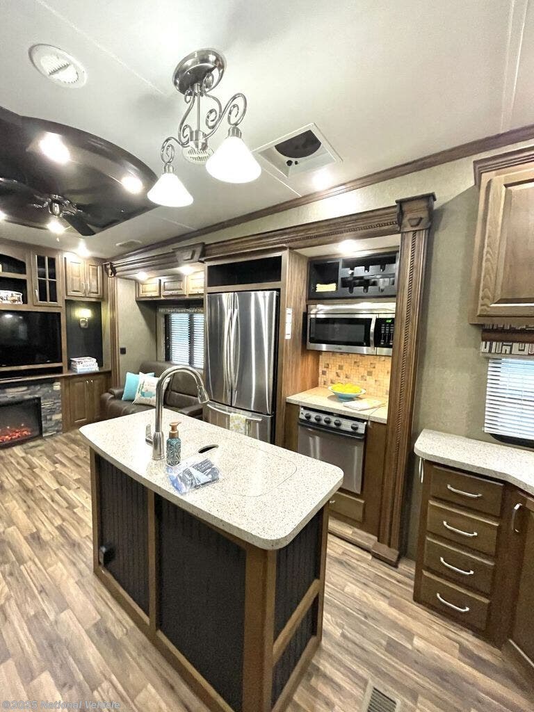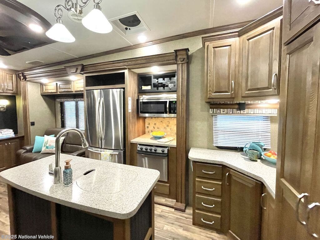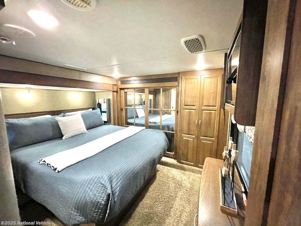 Original owner, lightly used, and always stored covered, this pre-Covid luxury 5 th wheel is quality built and has been meticulously maintained. It is ready to camp with new tires, batteries, brakes, and Jensen In-Command System as well as a recently serviced 5500 Onan generator. Immaculately clean, feel the spaciousness in this open floor plan. Opposing slides allow for a large living area, kitchen island, and 18cubic foot refrigerator. A third bedroom slide provides space for a king bed, large, full-sized, cedar-lined closet, dresser, and washer/dryer hookups. This camper is ideal for full-time and four season living.
