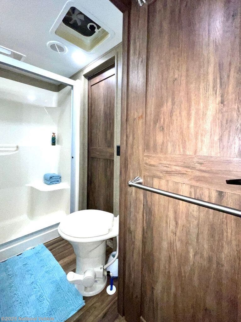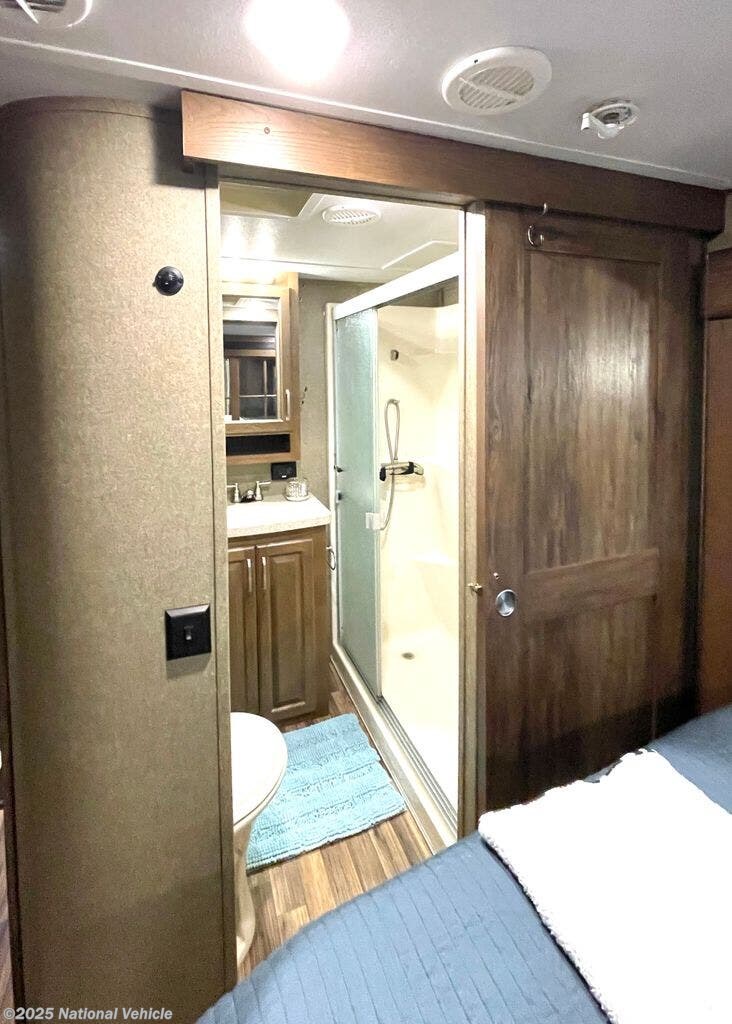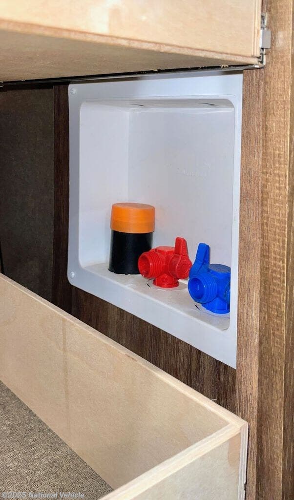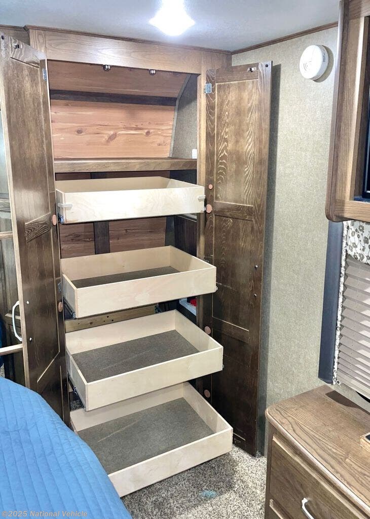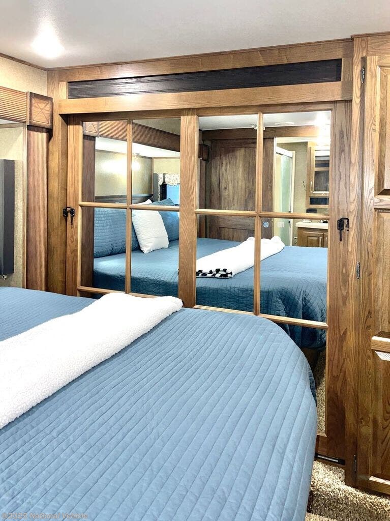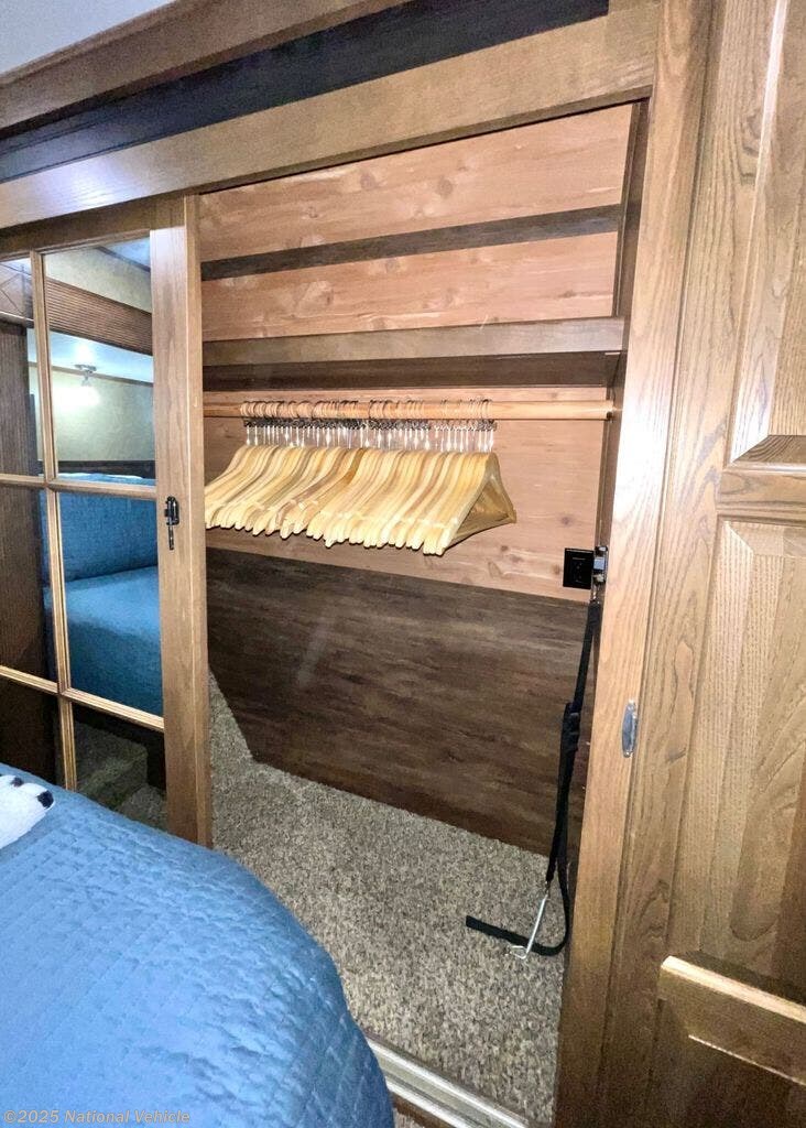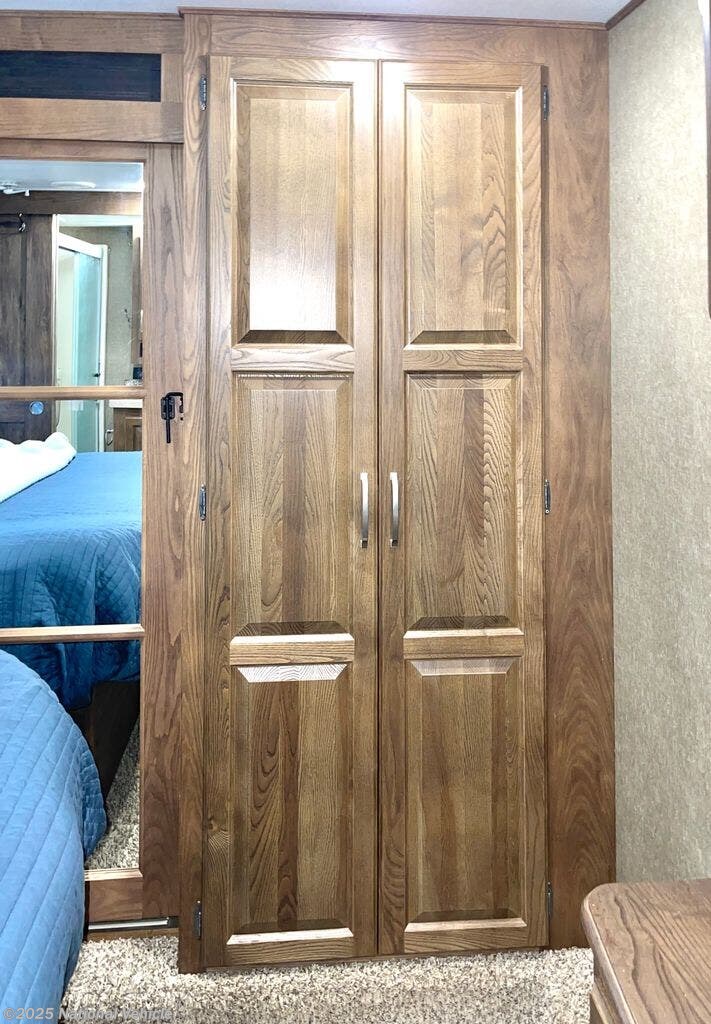 The private bedroom offers ample room and storage under the king bed, in the dresser, and the full-length cedar-lined closet. A second cabinet is prepped for washer and dryer hook-up and offers slide out wardrobe drawers.