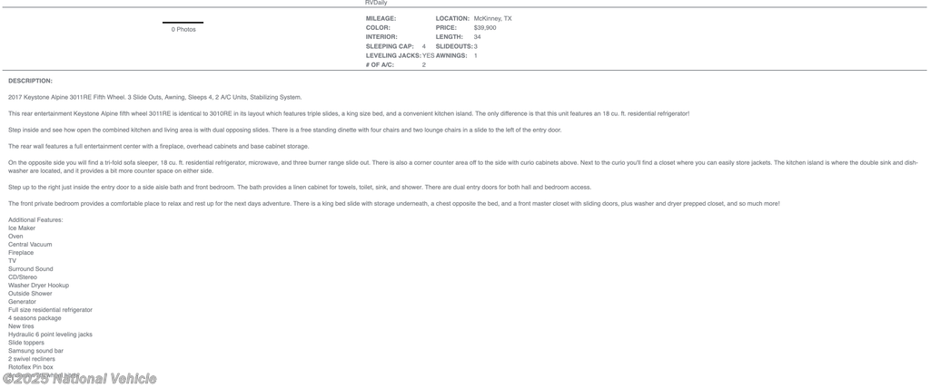 Request More Info on this 2017 Keystone Alpine 3011RE Offered for sale by National Vehicle