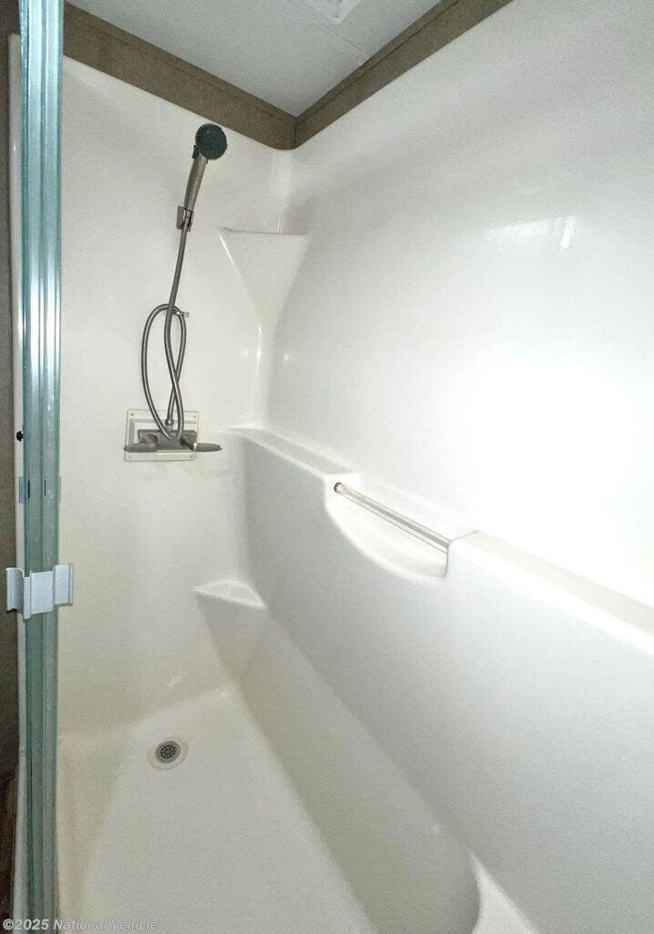 This well-planned layout has a side aisle bath with dual entry to the bedroom. The spacious shower has a unique marine three-section glass sliding door making easier entry. The linen cabinet offers plenty of extra storage.