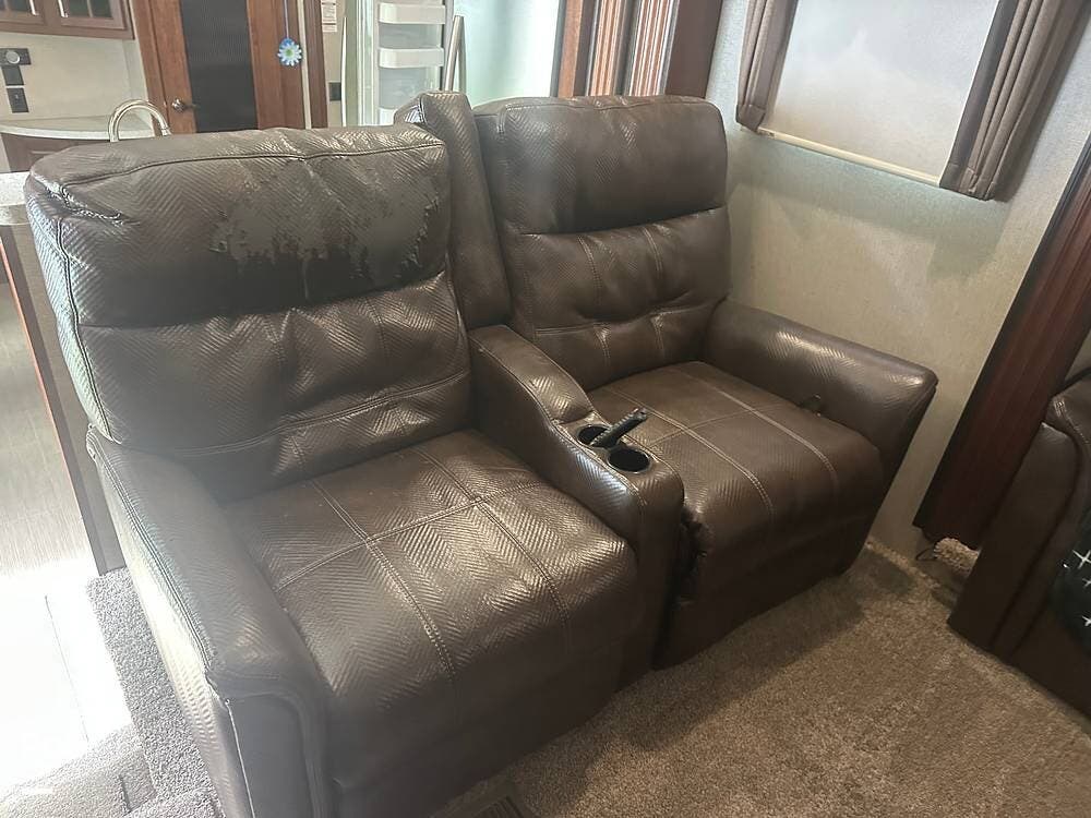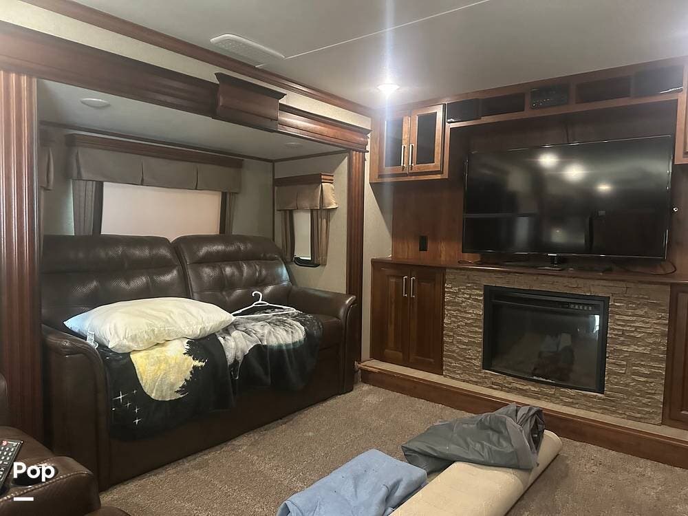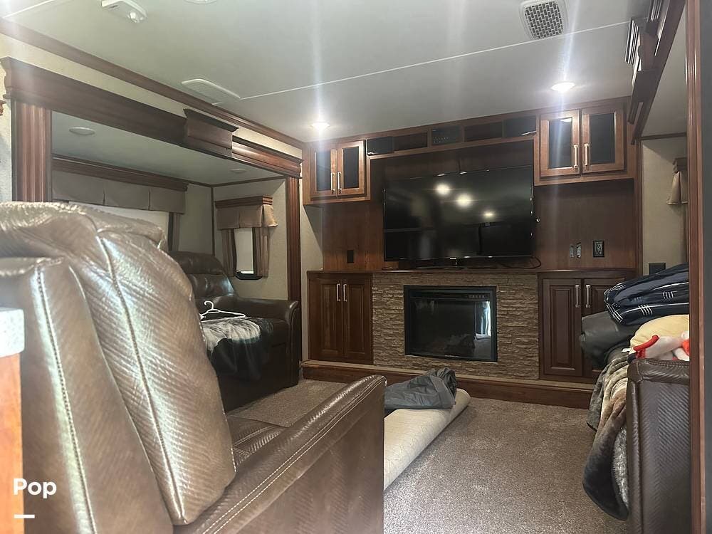 This 2017 Alpine 3661FL is a front-living fifth wheel with a spacious, elevated lounge featuring dual opposing tri-fold sofas, theater seating, and a large entertainment center with a cozy fireplace--perfect for relaxing after a day of adventure.