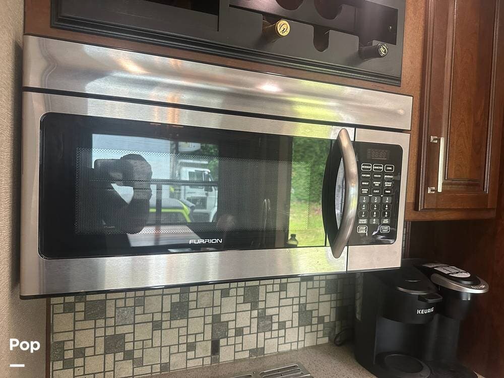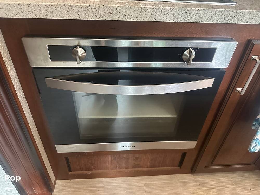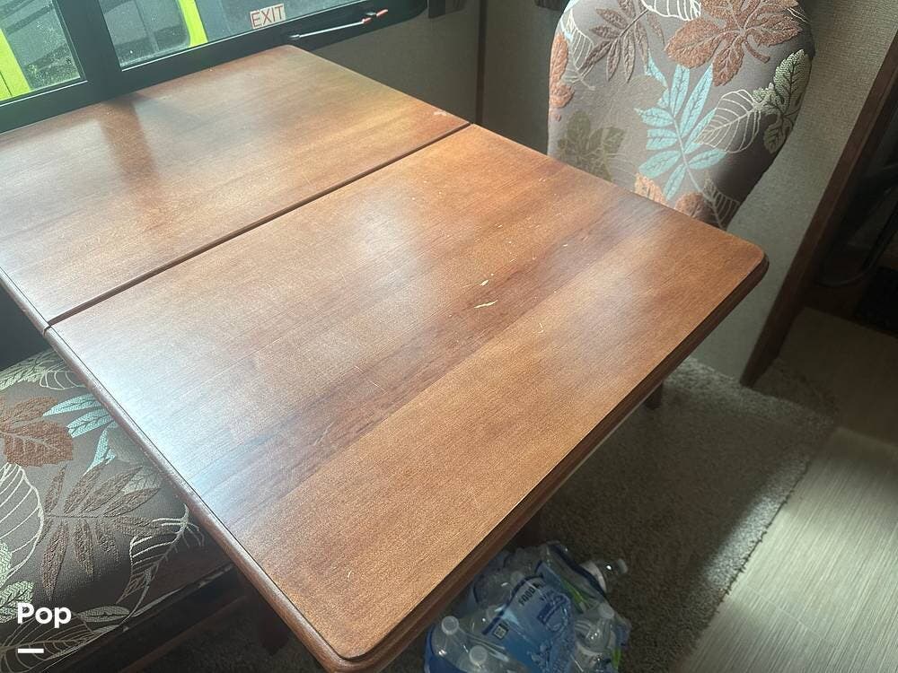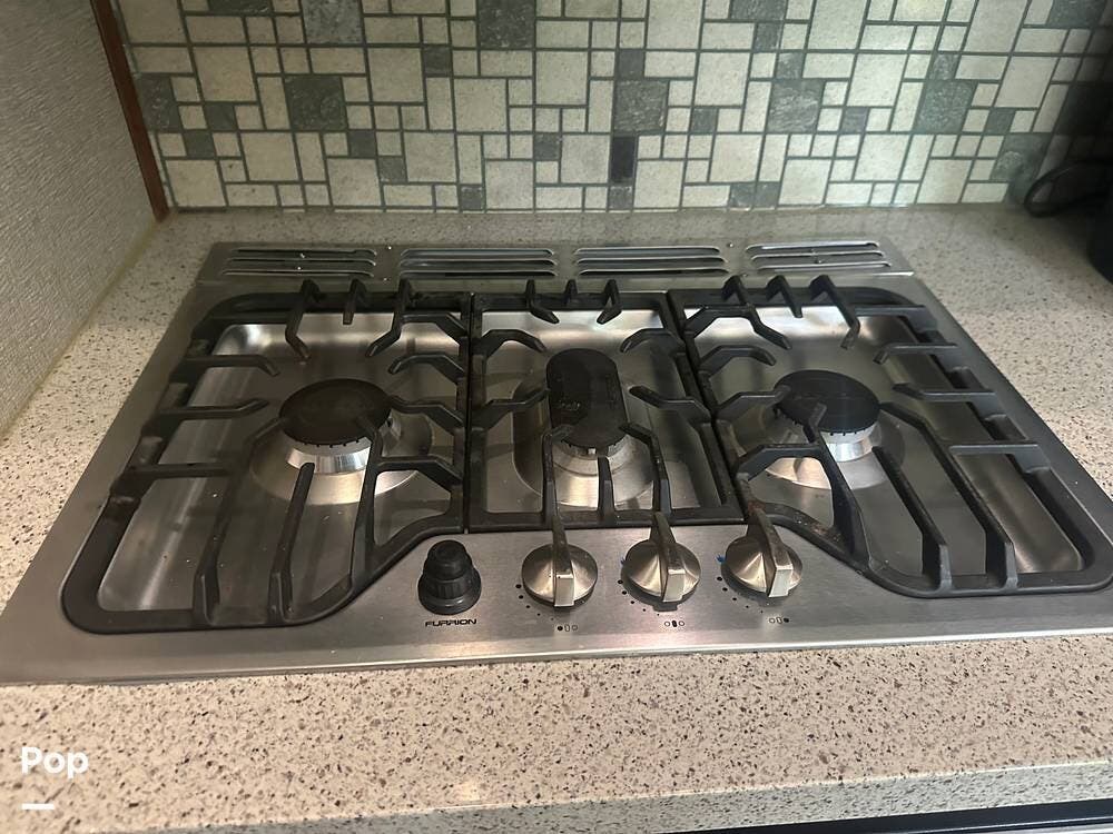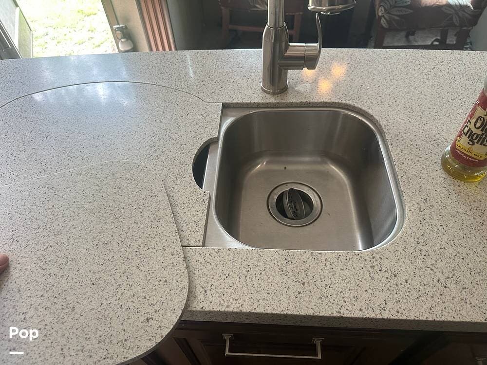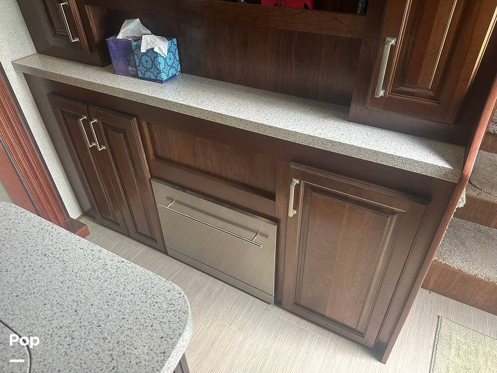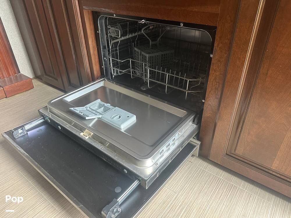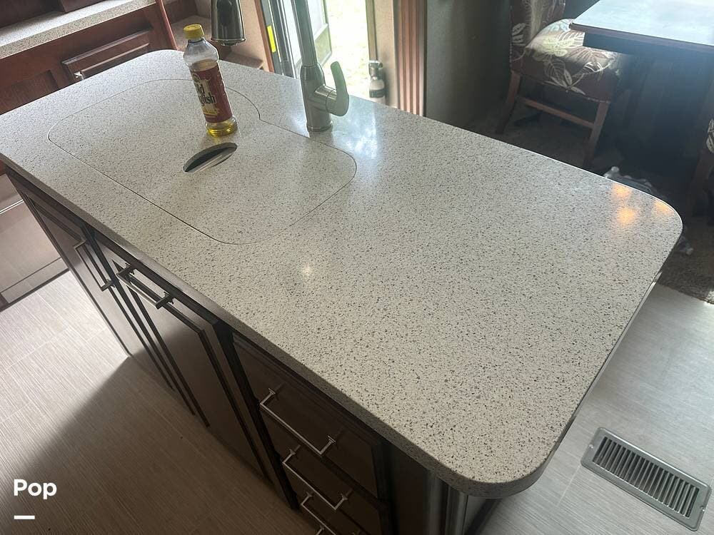 Walk down into the heart of the coach, and you'll find a kitchen that's as functional as it is stylish. It has solid-surface countertops, a residential refrigerator, generous pantry space, and a free-standing dinette for meals or game nights. The mid-coach design keeps everything within easy reach without sacrificing space.