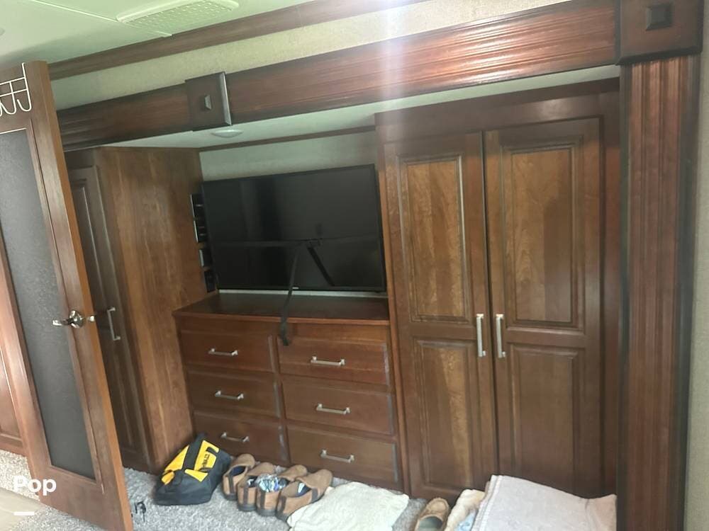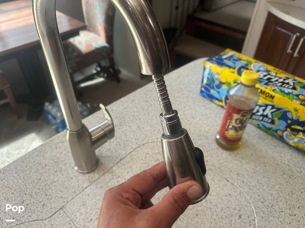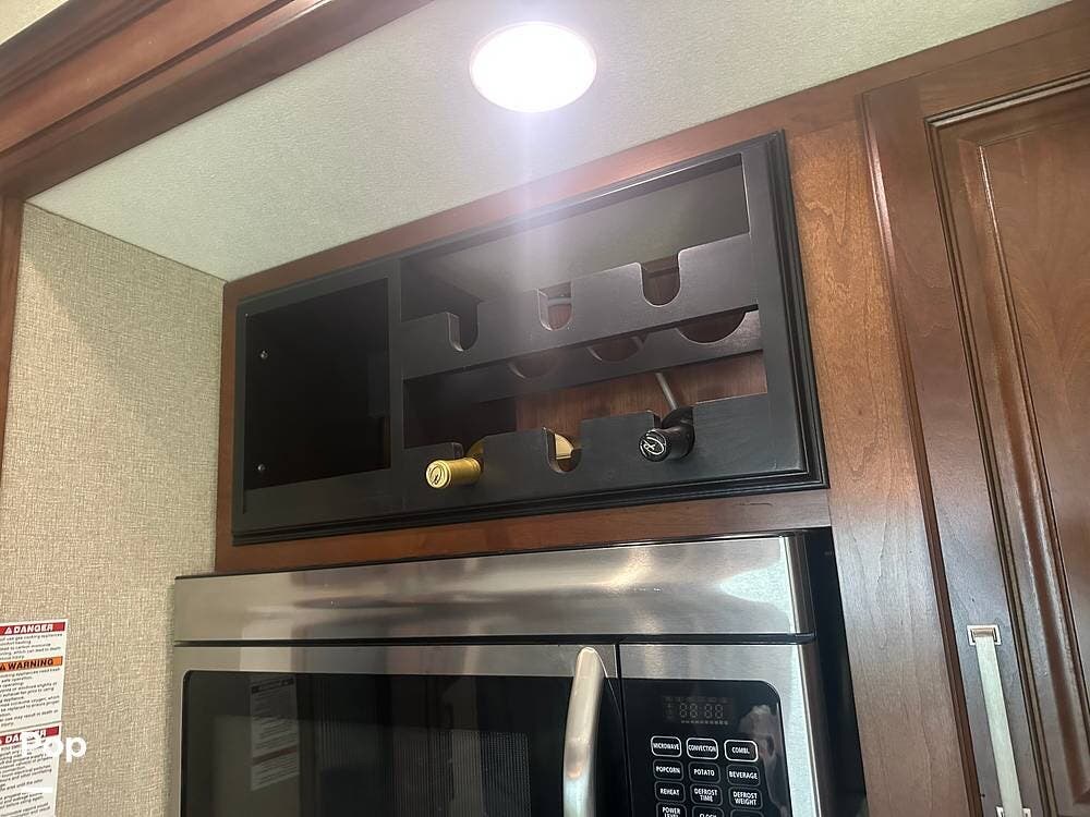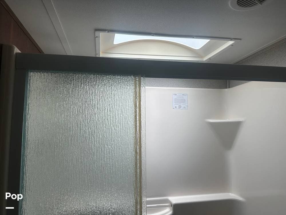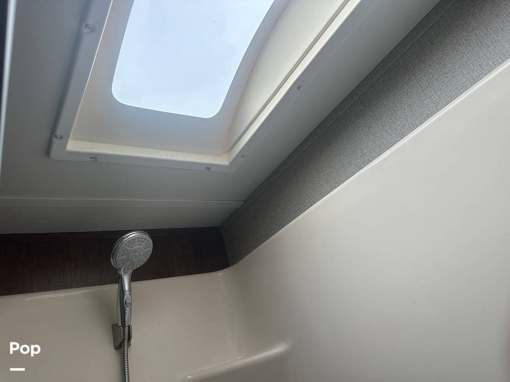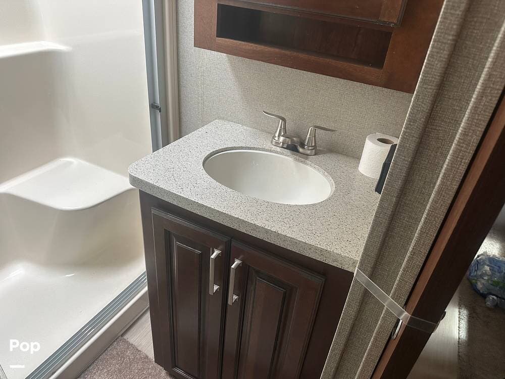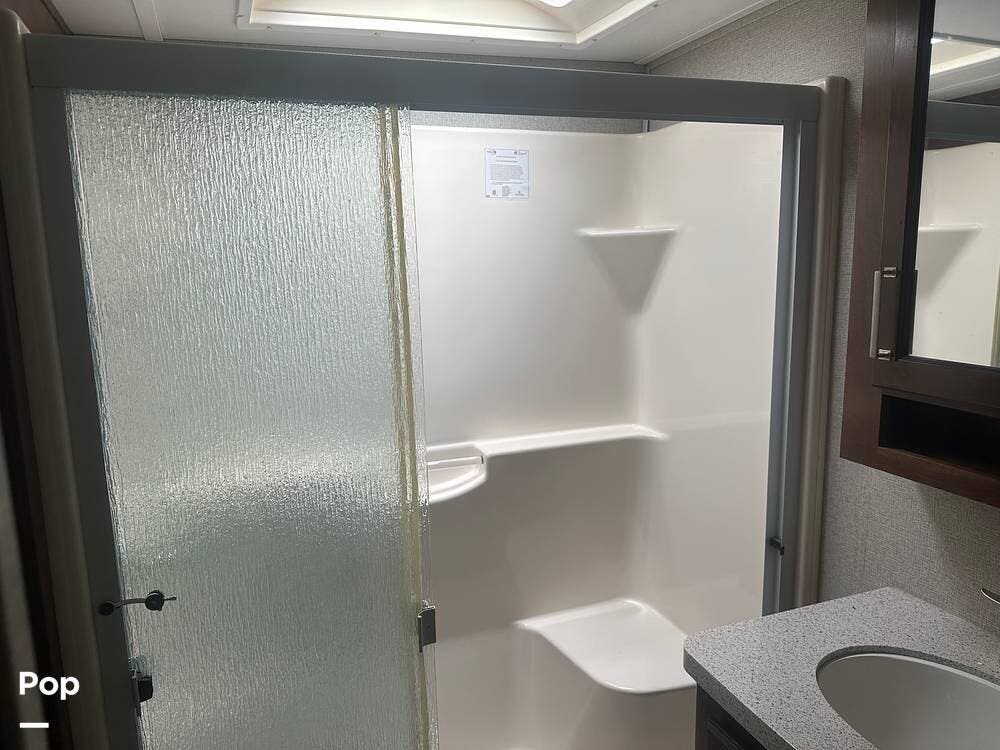 Toward the rear, the private master suite offers a king-size bed, abundant wardrobe storage, and washer/dryer hookups for convenience. The large bathroom features a walk-in shower and a skylight that brightens the space naturally. With high-end finishes, ample storage, and full-time living features, this Alpine 3661FL is ready for extended stays or spontaneous getaways.