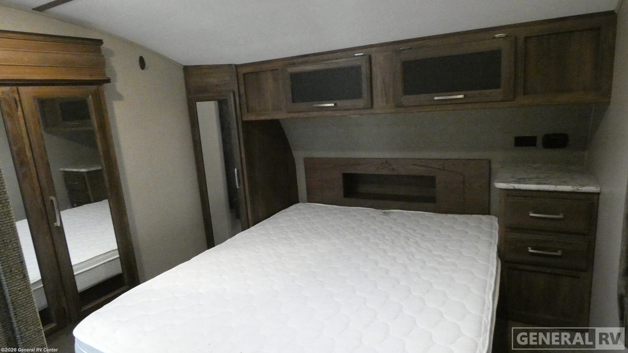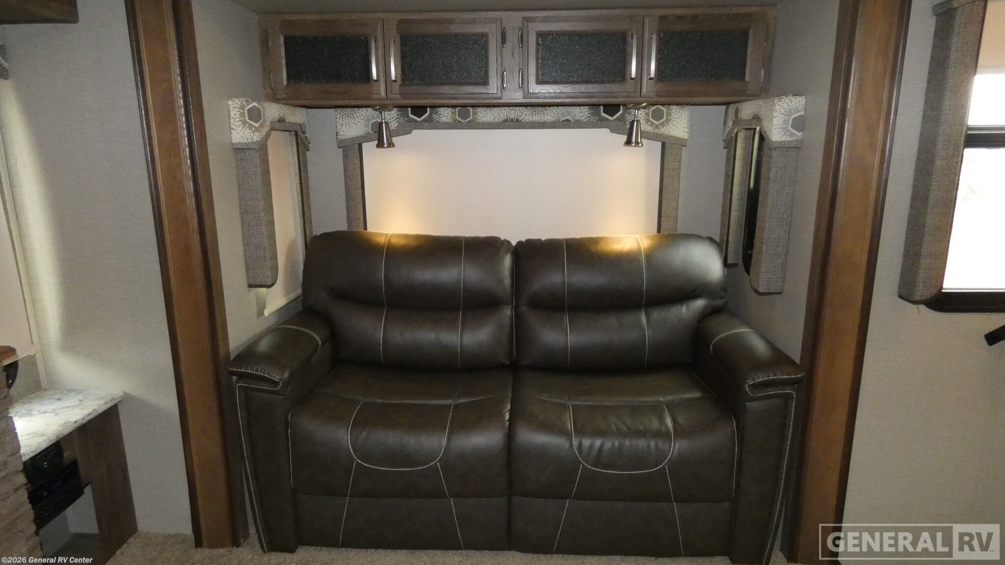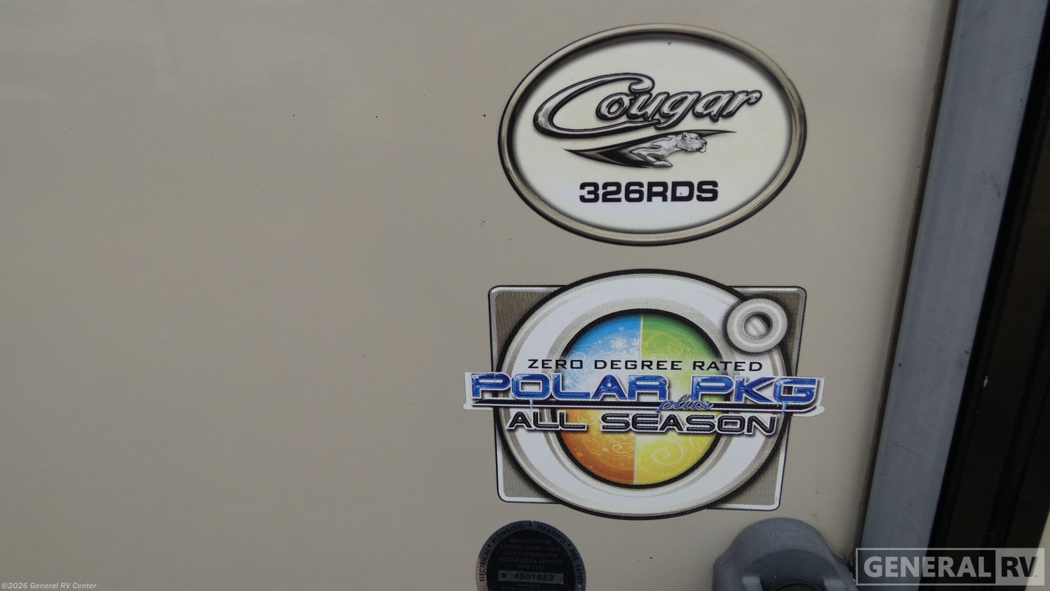 If you enjoy time away from home, you will love your time away in this Keystone Cougar 326RDS fifth wheel. This model features quad slides, a rear entertainment center, and plenty of room to entertain guests. As you enter the fifth wheel, to your left there is counter space for food prep, overhead cabinets, three burner range, and double kitchen sink. On the opposite side the road side slide has a free-standing dinette. Adjacent to the slide there is a pantry, refrigerator, and an additional pantry. Step up to the bathroom and bedroom area. The side aisle bathroom is on your left. Inside the bathroom you will find a sink, medicine cabinet, neo-angled shower, and a toilet. There is a sliding door that separates the bathroom from the bedroom. In the bedroom there is a queen bed, nightstand, wardrobe, overhead storage, and a slide with a wardrobe and linen cabinet. You can also access the linen cabinet from the bathroom. Located in the rear of this model is the living area. Here you will find dual opposing slides with tri-fold sleeper sofas and overhead cabinets. There are also theater seats with cup holders, and along the rear wall enjoy the entertainment center, and more!