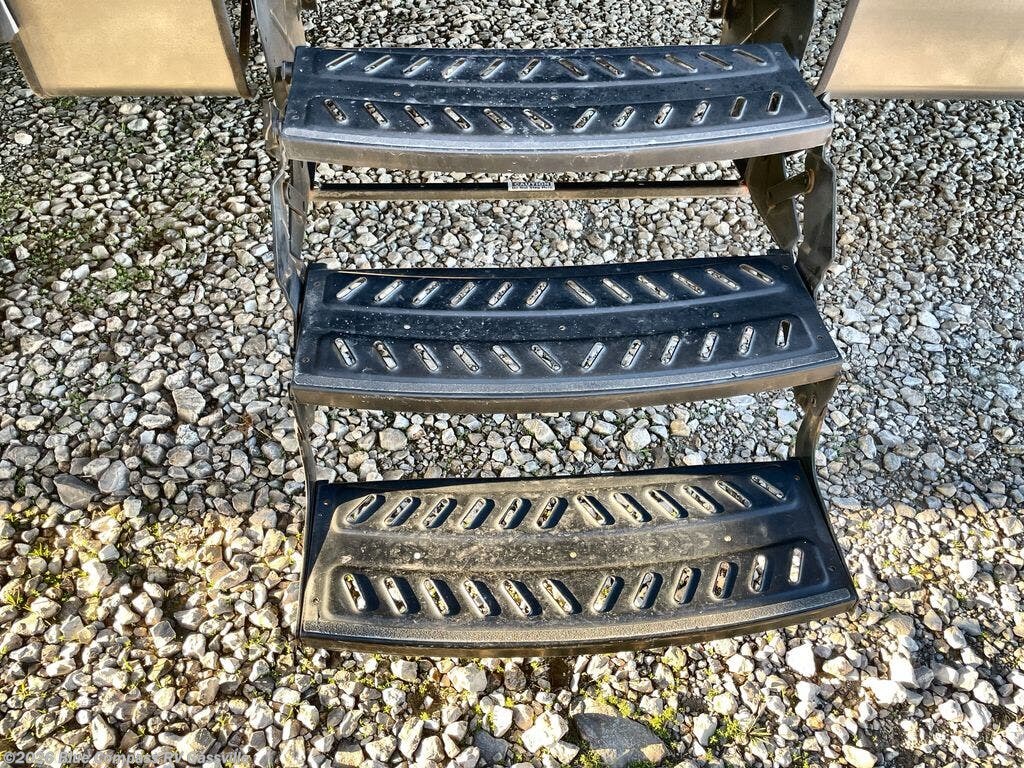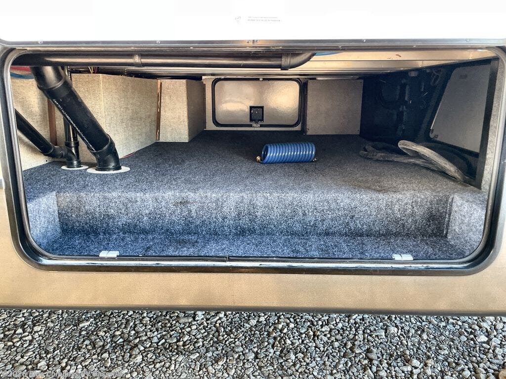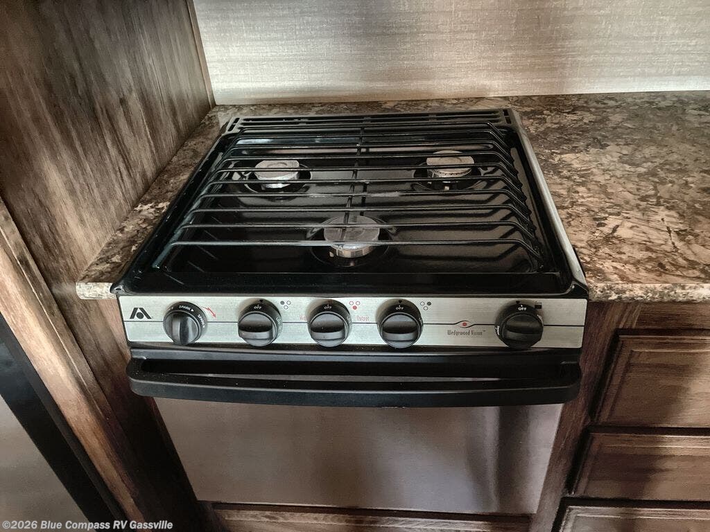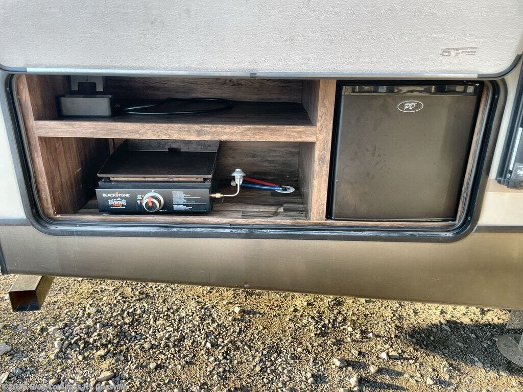 If cooking outside is what you are looking for, the pull out camp kitchen including a refrigerator, two burner cooktop, and a sink, might be your favorite place. Enjoy these standard features, plus so much more inside and out!