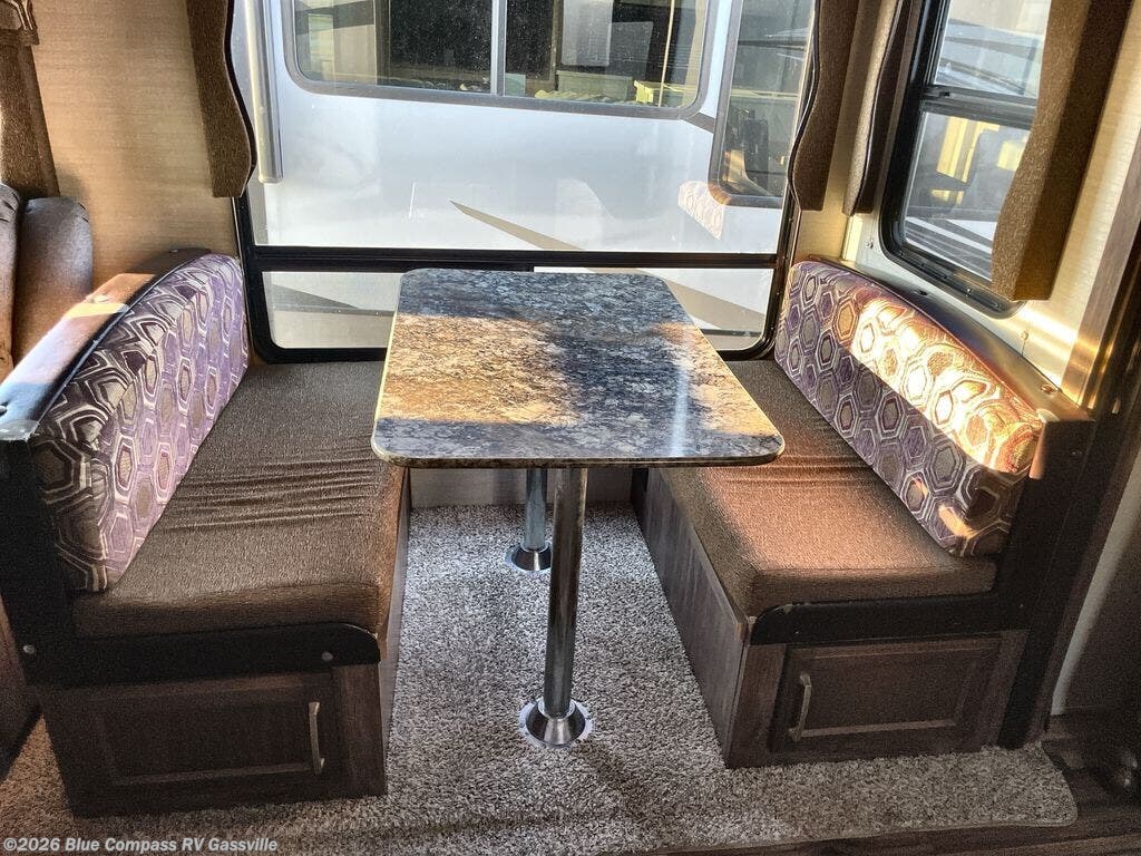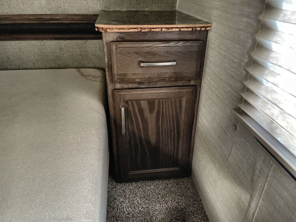 Straight in from the door find a tri-fold sleeper sofa and booth dinette slide. The sofa features overhead cabinets above for storage. There is an entertainment center near the slide that can easily be viewed from any seating in the room.