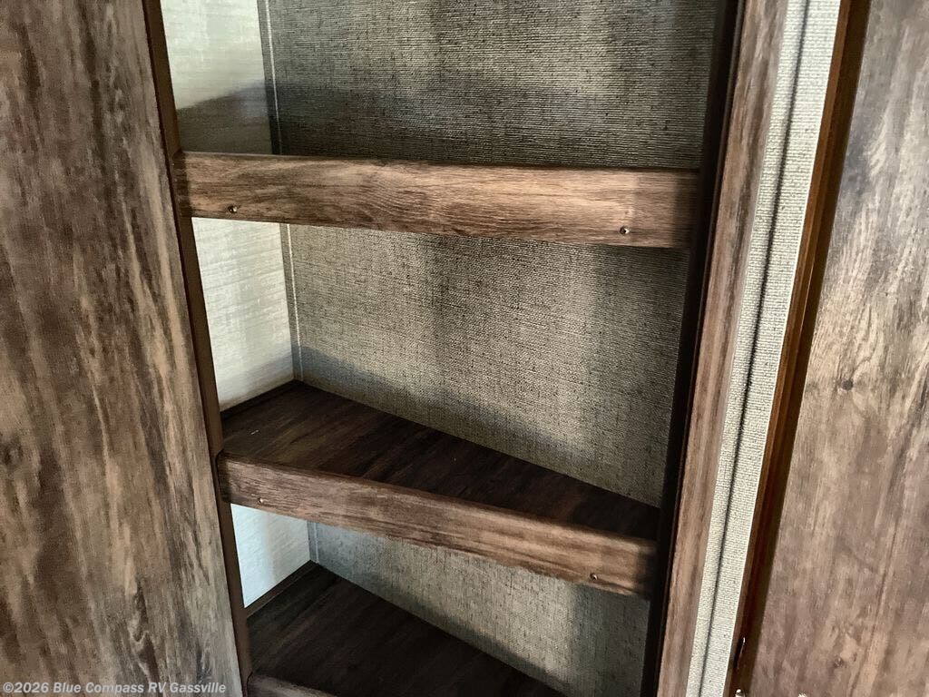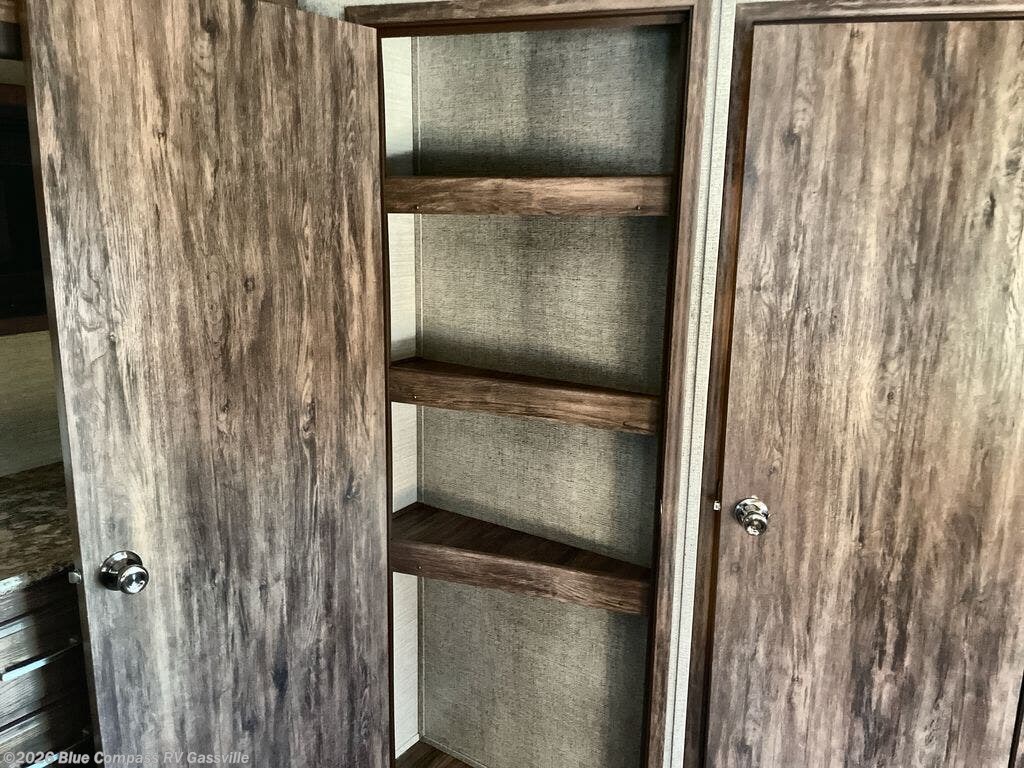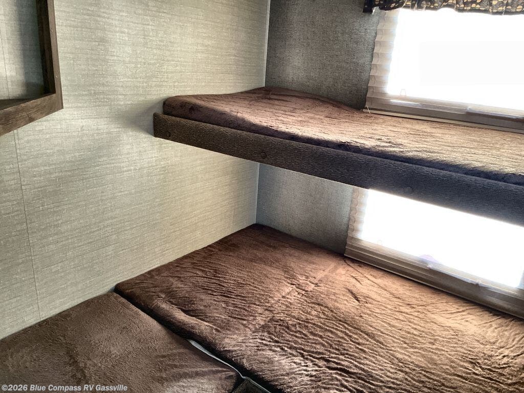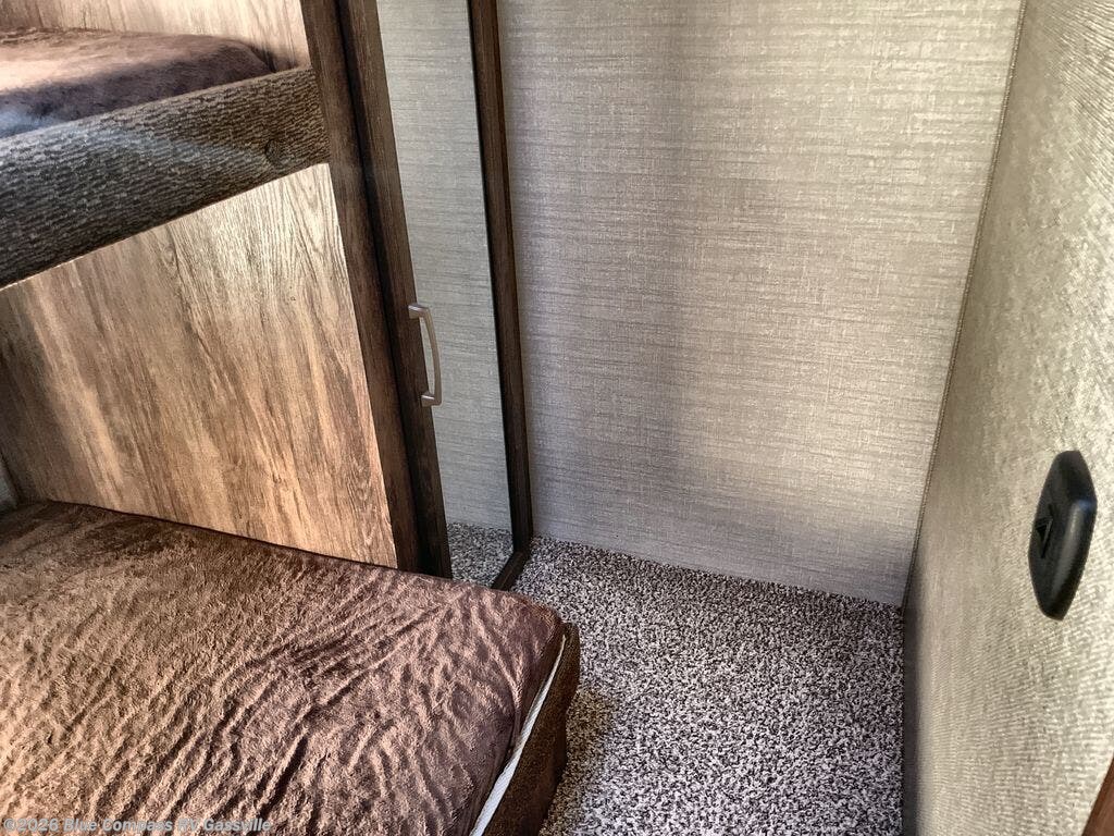 The bunkhouse is located in the rear of the fifth wheel. There are two 28" x 74" bunks along the rear wall as well as a wardrobe. There is an additional upper bunk along the curb side wall. Plus enjoy the privacy door for your own space.