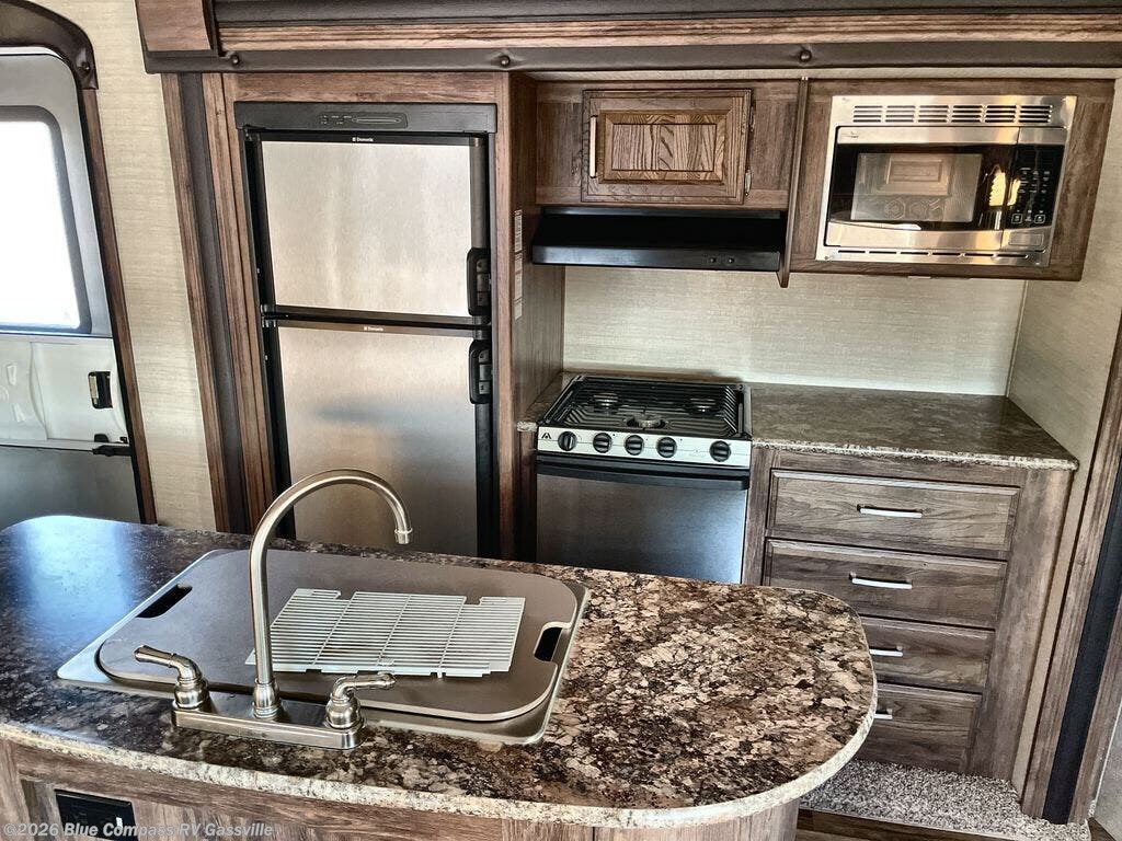 To the left of the entry door you will find the kitchen amenities. There is a refrigerator, three burner range, countertop space, and overhead cabinets within the second slide. A pantry for dry food storage is next to the slide. You will enjoy the kitchen island with a large single sink when it is time to clean up the dishes.