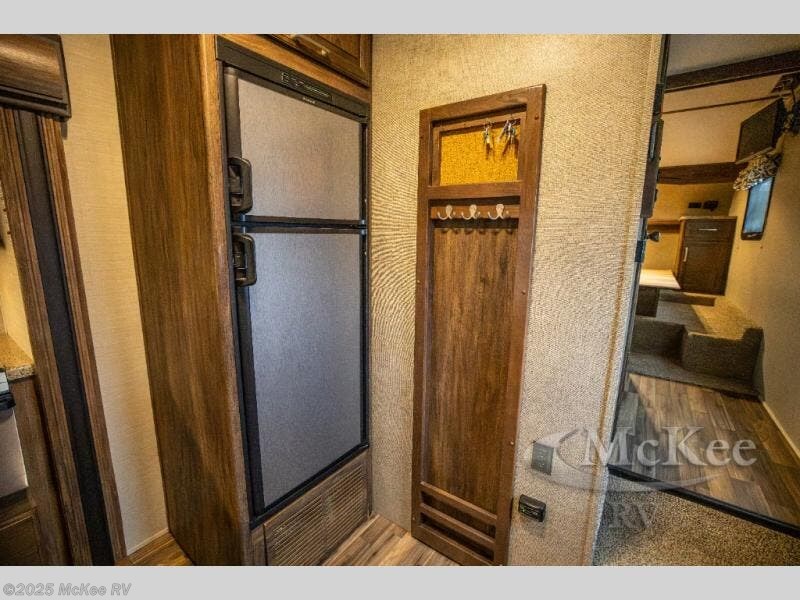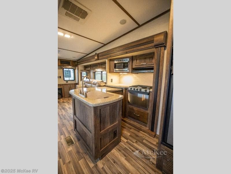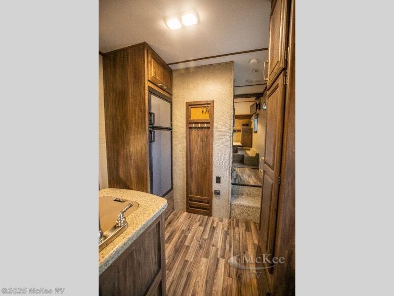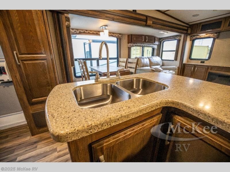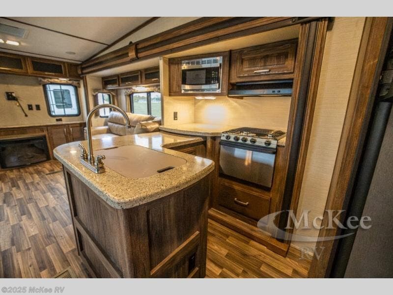 Step inside and find yourself in the kitchen where you can comfortably prepare and cook all of your favorite foods. There is a refrigerator straight ahead, a pantry to the left of the entry door, and a L-shaped counter with a double sink, and three burner range that is all part of the road side slide out. You will also find plenty of overhead cabinets for storing dishes and things as well.