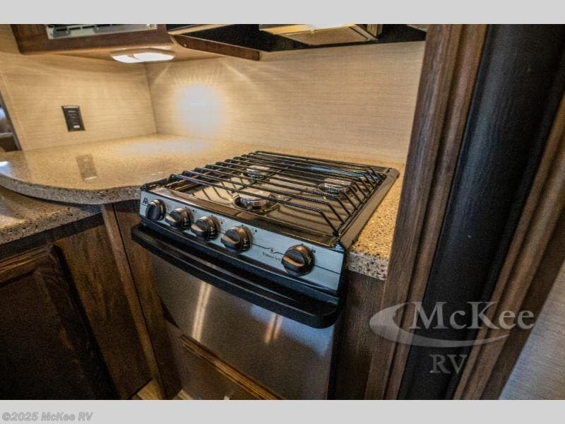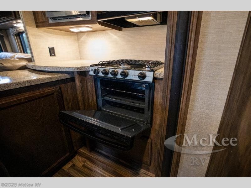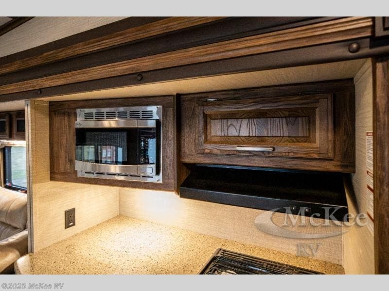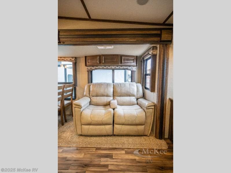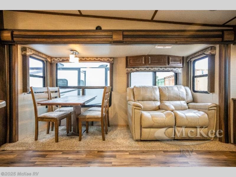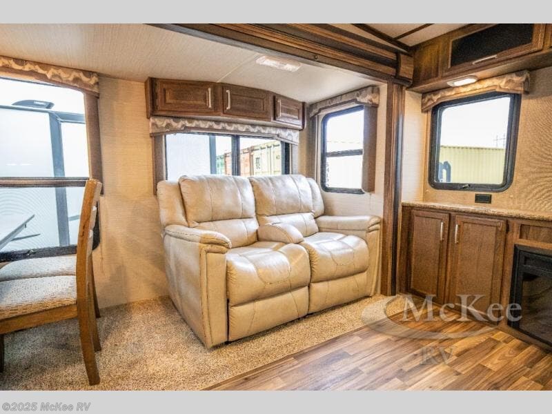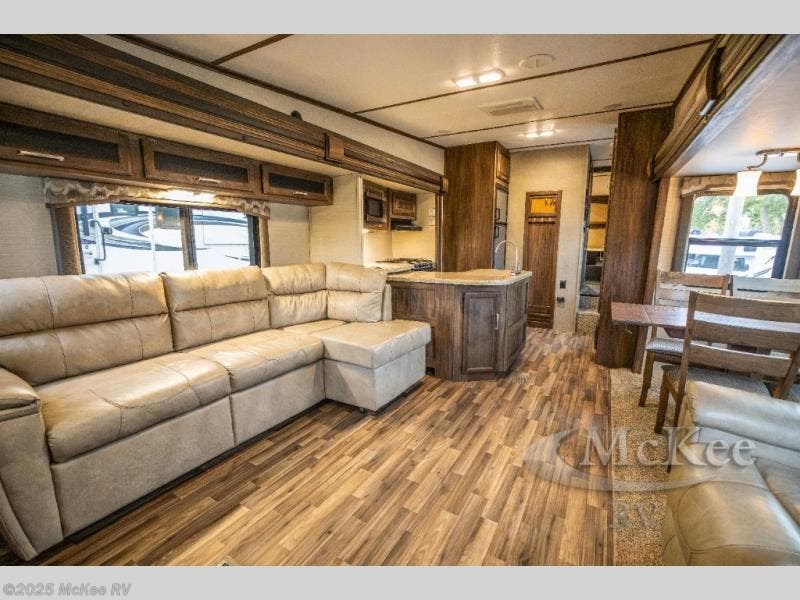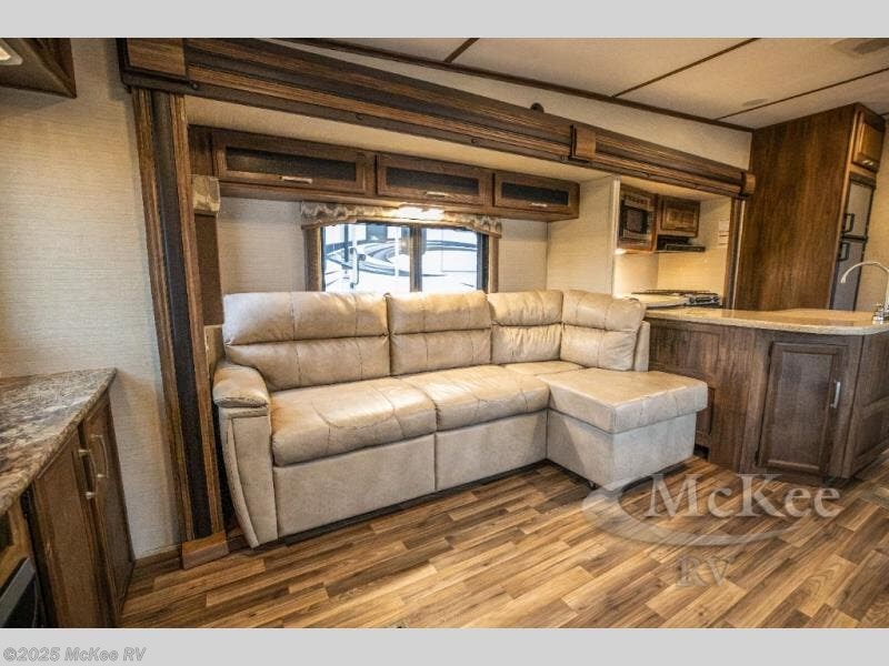 Opposite, within the kitchen amenities slide there is a L-shaped sofa with storage above. Seated here you can easily enjoy conversation with family and friends, and also enjoy watching your favorite movies or television shows on the rear entertainment center that stretches across the entire width of the unit.