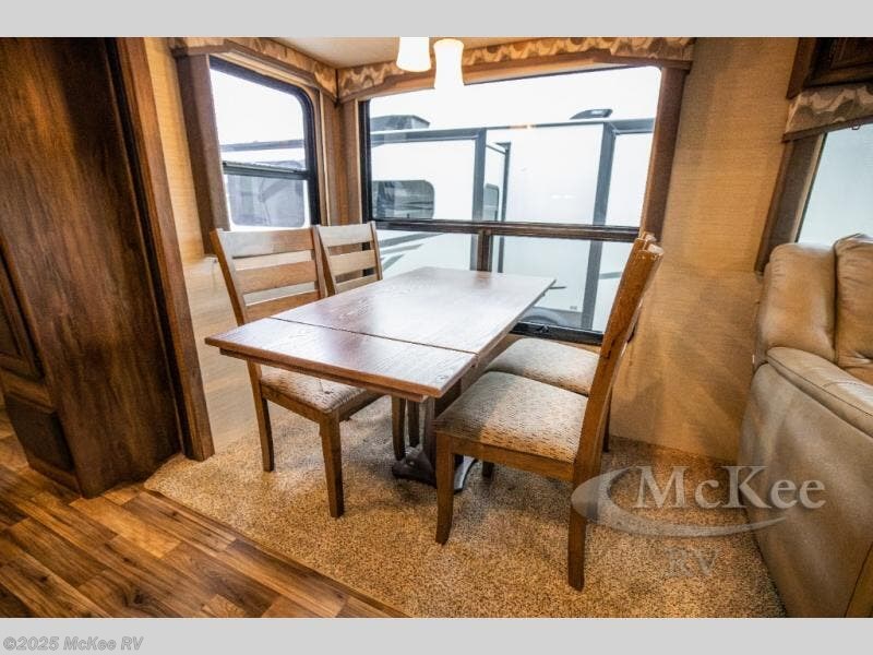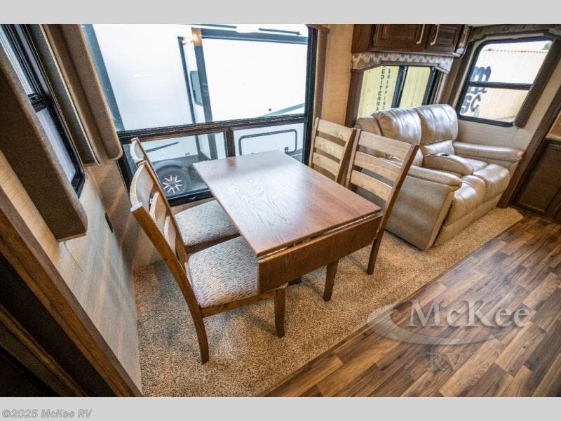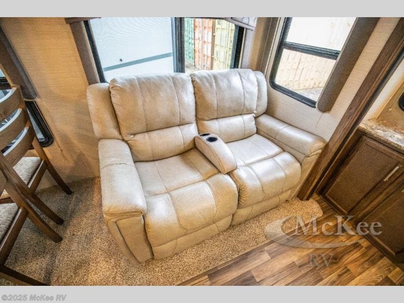To the left of the entrance just beyond the pantry find a free standing table with chairs and two recliners, or you can choose an optional booth dinette to enjoy your meals at, and optional theater seats. The slide out helps to create more floor space, with more room to move around.