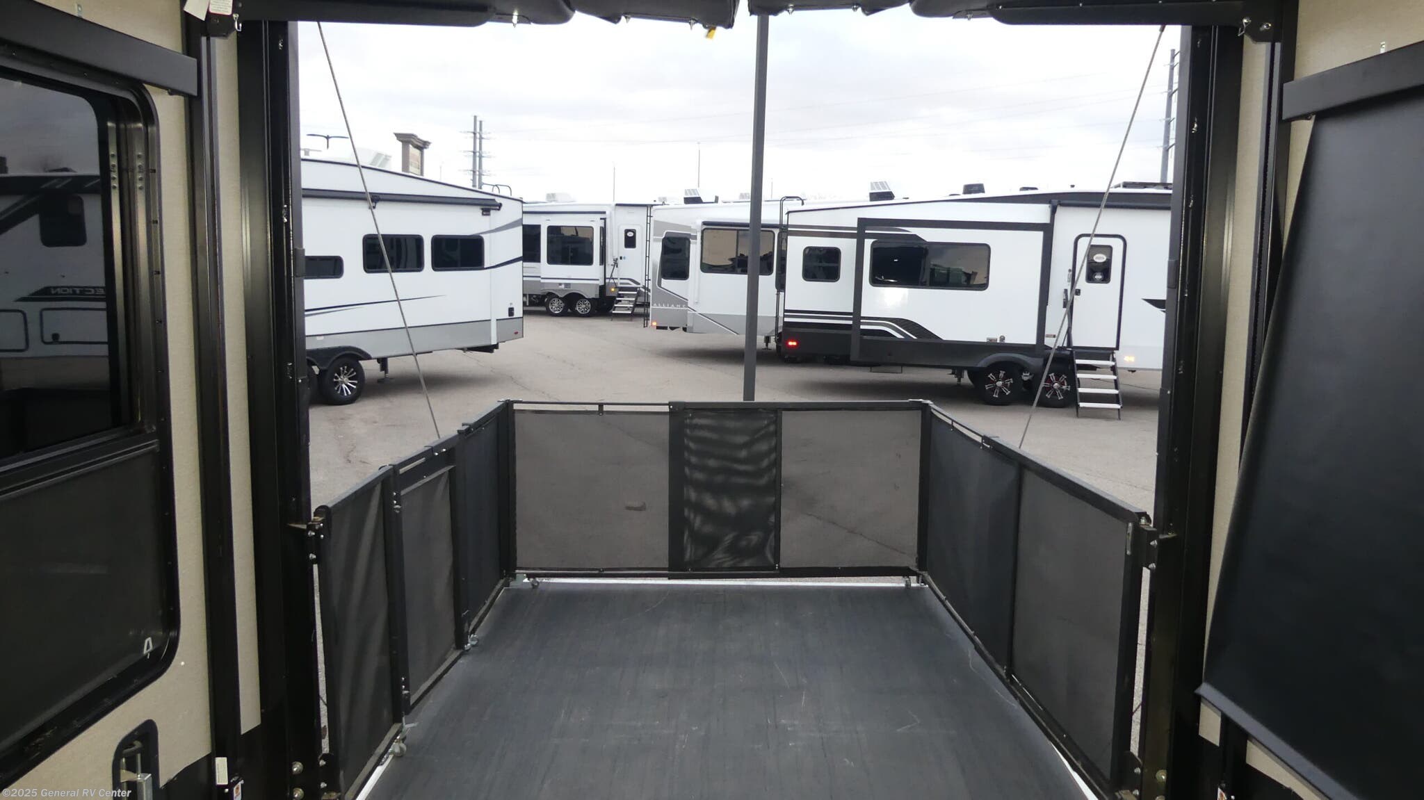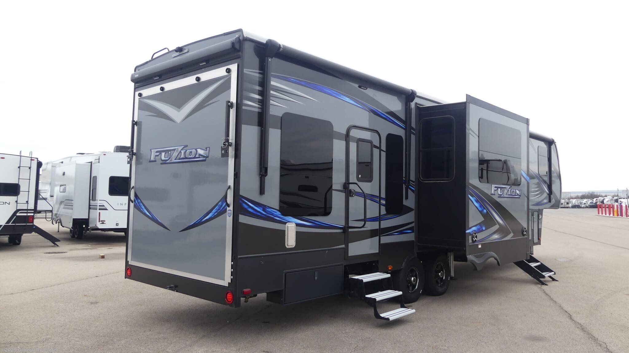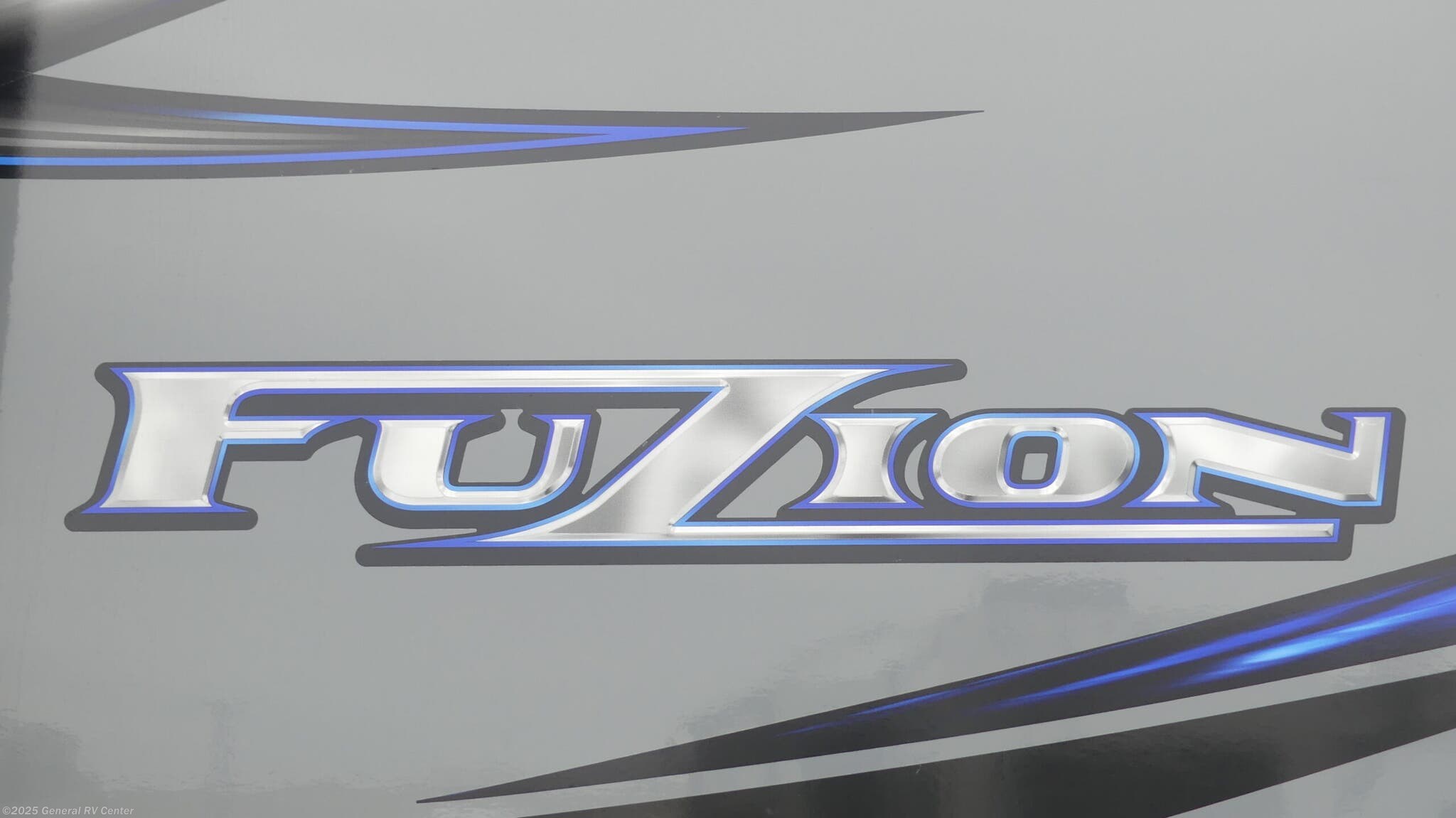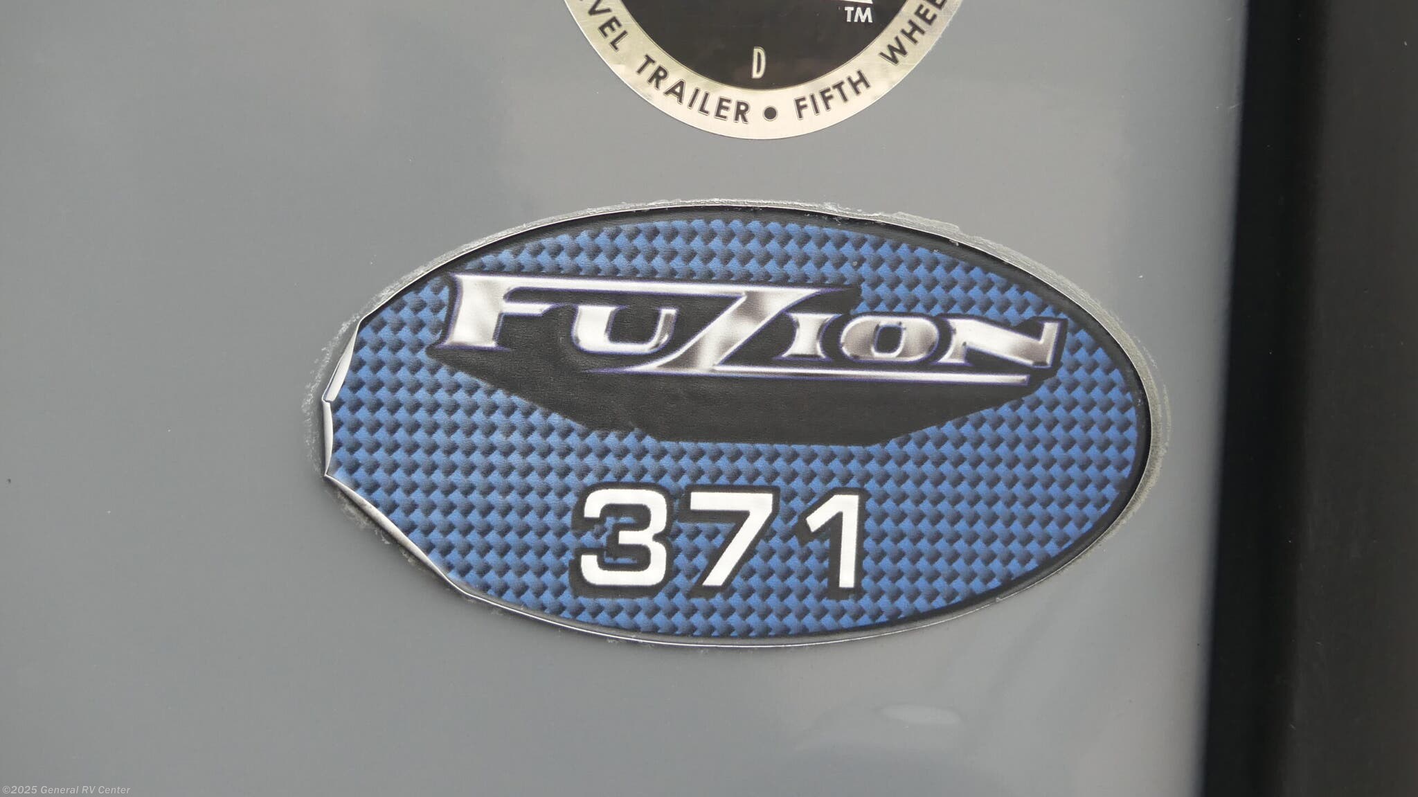 This 371 Keystone Fuzion toy hauler fifth wheel is exactly what you need for a comfortable and convenient get-a-way to the playground of your choice. That's right, pack up the big toys and head to the trails, dunes, or lakeside retreat! This unit features an 11' garage space with plenty of room for toys and a few extra friends too. Loading and unloading is a cinch with the 8' garage door. Once you are at your destination and the toys are removed the garage becomes a part of the living space with dual opposing sofas and a top queen bed that lowers from the ceiling for more sleeping space inside. There is also a loft area towards the front of the garage space that the kids will surely love. Enjoy the convenience of a half bath in the cargo, a 40" LED TV, overhead cabinets, and washer and dryer prep also. Through the door in the cargo or using the second entry door from outside you can enter the main living space with a combined kitchen and living room including two slides. The curb side slide has a large sofa. A LED TV, entertainment center, and fireplace are on the outer angled wall of the cargo half bath. The opposite slide features an 18 cu. ft. gas/electric RV refrigerator and three burner range. Next to the slide, you will find an l-shaped counter with double kitchen sink and plenty of overhead cabinets and counter area for food prep. There is also a pantry next to the refrigerator. Head up the steps to the front bed and bath. The side aisle bath features a residential shower, toilet and vanity with sink, plus a linen cabinet. The front bedroom provides a comfortable residential queen bed or choose an optional Fuzion king. There is storage on either side of the bed plus overhead cabinets too. You are sure to enjoy the flat screen TV mounted on the wall opposite the bed. You will find plenty of additional storage with a slide out wardrobe that includes drawers for more camping clothes. A 30 gallon fuel tank outside will keep everyone on the move, and there is plenty of exterior storage and dual awnings along the door side, plus so much more!