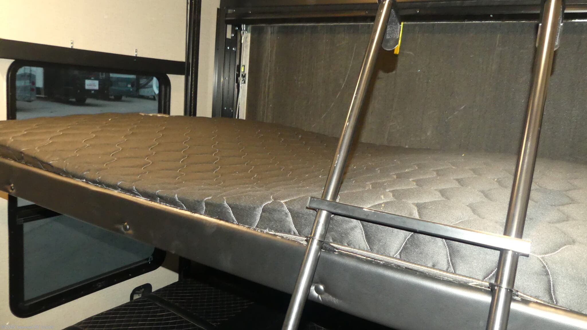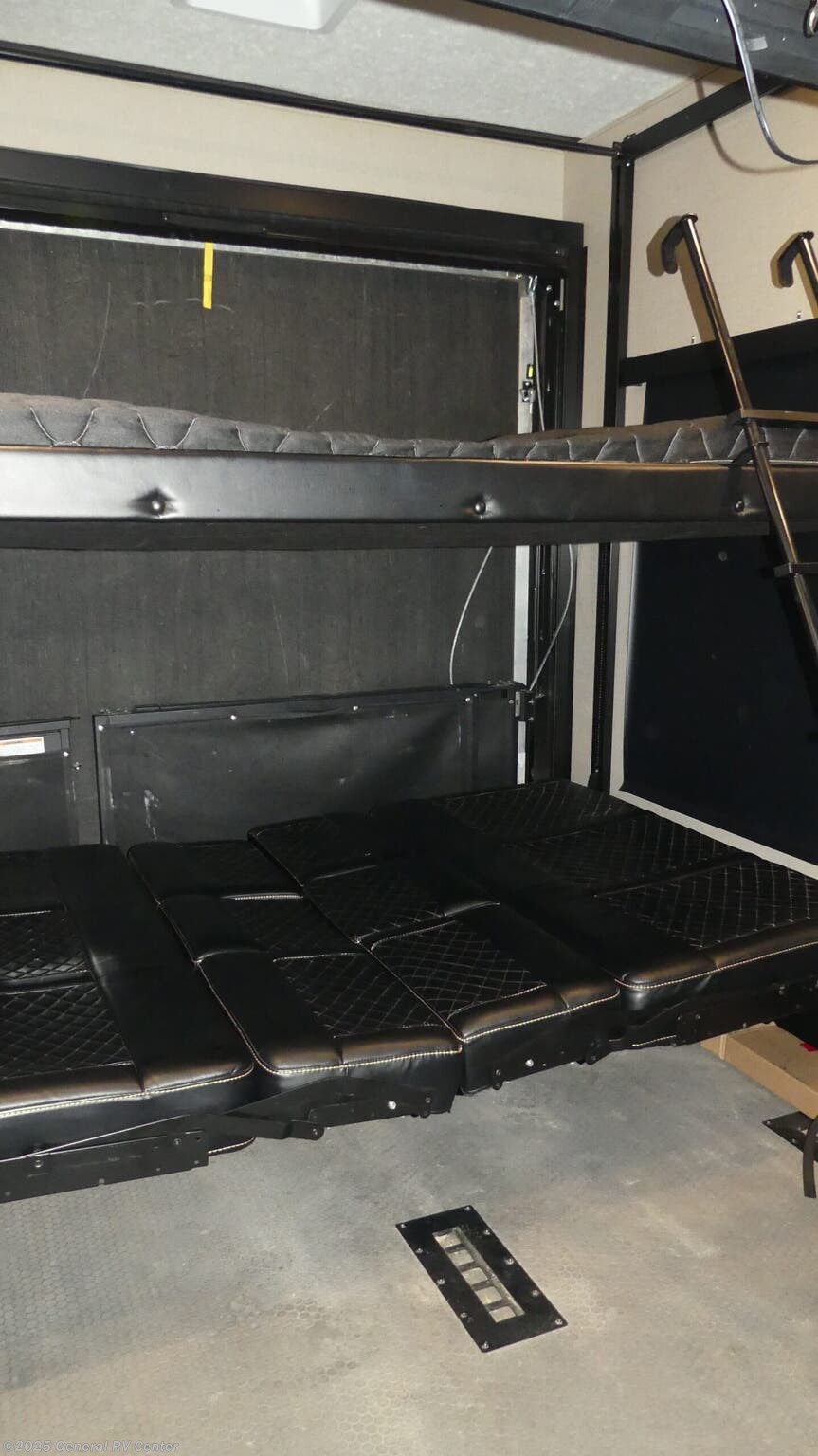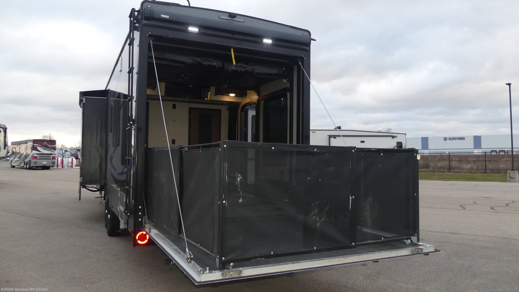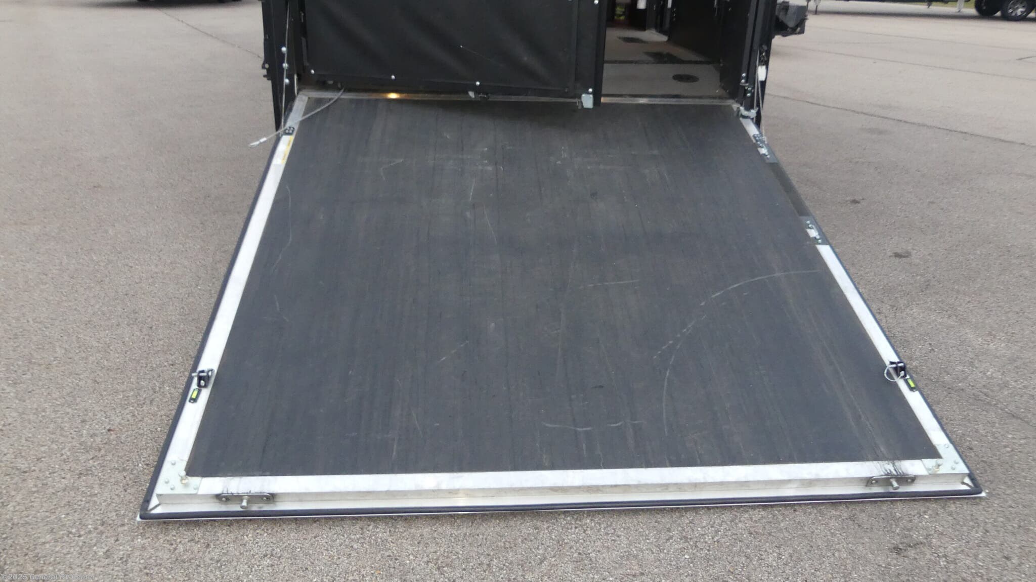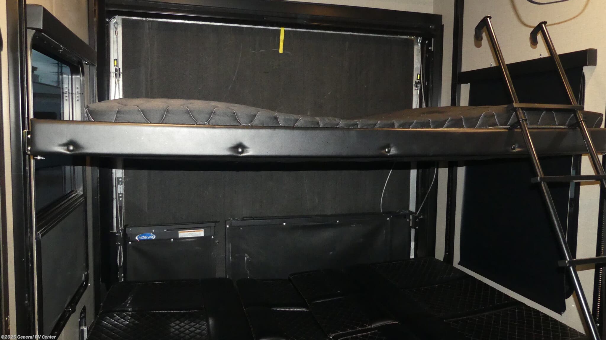 This 371 Keystone Fuzion toy hauler fifth wheel is exactly what you need for a comfortable and convenient get-a-way to the playground of your choice. That's right, pack up the big toys and head to the trails, dunes, or lakeside retreat! This unit features an 11' garage space with plenty of room for toys and a few extra friends too. Loading and unloading is a cinch with the 8' garage door. Once you are at your destination and the toys are removed the garage becomes a part of the living space with dual opposing sofas and a top queen bed that lowers from the ceiling for more sleeping space inside. There is also a loft area towards the front of the garage space that the kids will surely love. Enjoy the convenience of a half bath in the cargo, a 40" LED TV, overhead cabinets, and washer and dryer prep also. Through the door in the cargo or using the second entry door from outside you can enter the main living space with a combined kitchen and living room including two slides. The curb side slide has a large sofa. A LED TV, entertainment center, and fireplace are on the outer angled wall of the cargo half bath. The opposite slide features an 18 cu. ft. gas/electric RV refrigerator and three burner range. Next to the slide, you will find an l-shaped counter with double kitchen sink and plenty of overhead cabinets and counter area for food prep. There is also a pantry next to the refrigerator. Head up the steps to the front bed and bath. The side aisle bath features a residential shower, toilet and vanity with sink, plus a linen cabinet. The front bedroom provides a comfortable residential queen bed or choose an optional Fuzion king. There is storage on either side of the bed plus overhead cabinets too. You are sure to enjoy the flat screen TV mounted on the wall opposite the bed. You will find plenty of additional storage with a slide out wardrobe that includes drawers for more camping clothes. A 30 gallon fuel tank outside will keep everyone on the move, and there is plenty of exterior storage and dual awnings along the door side, plus so much more!