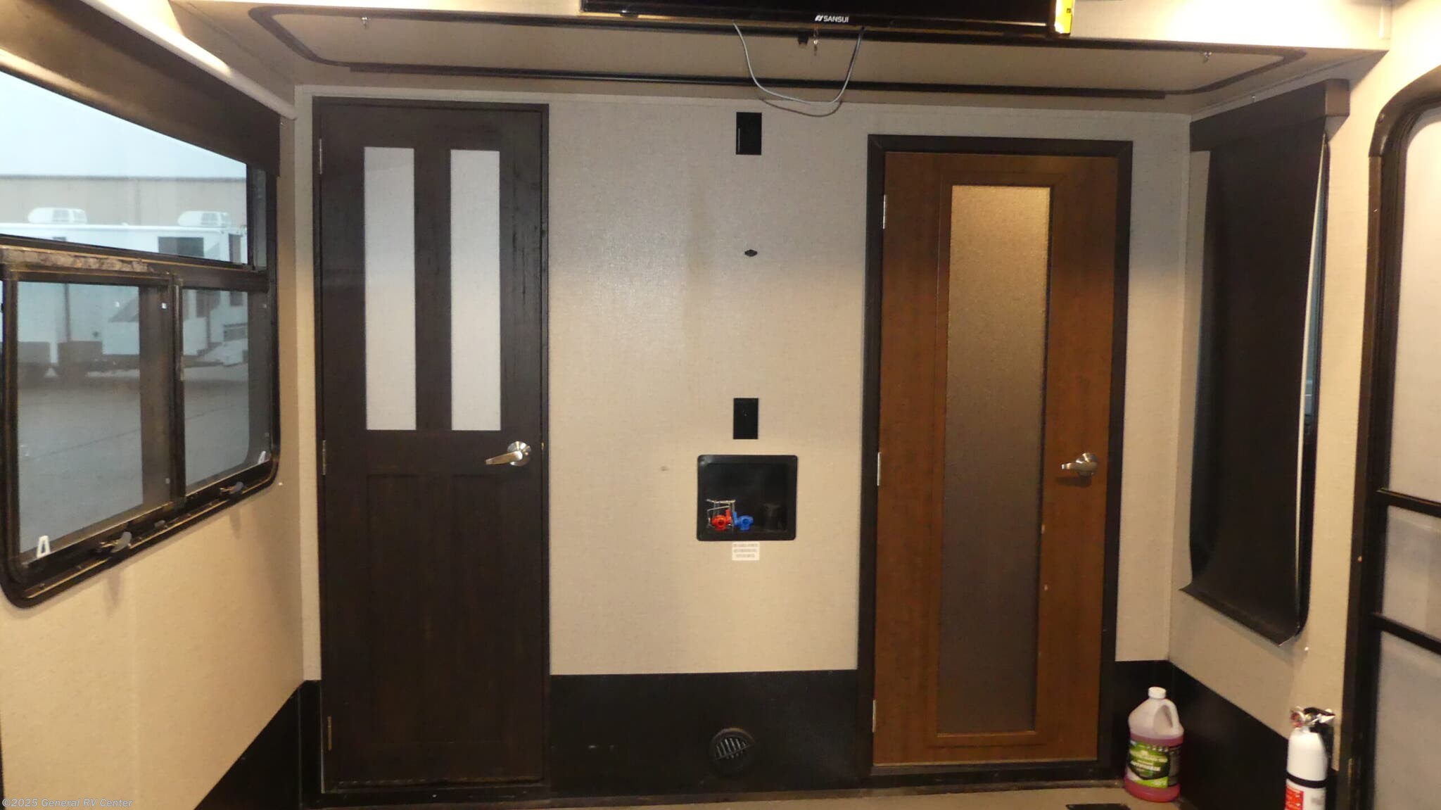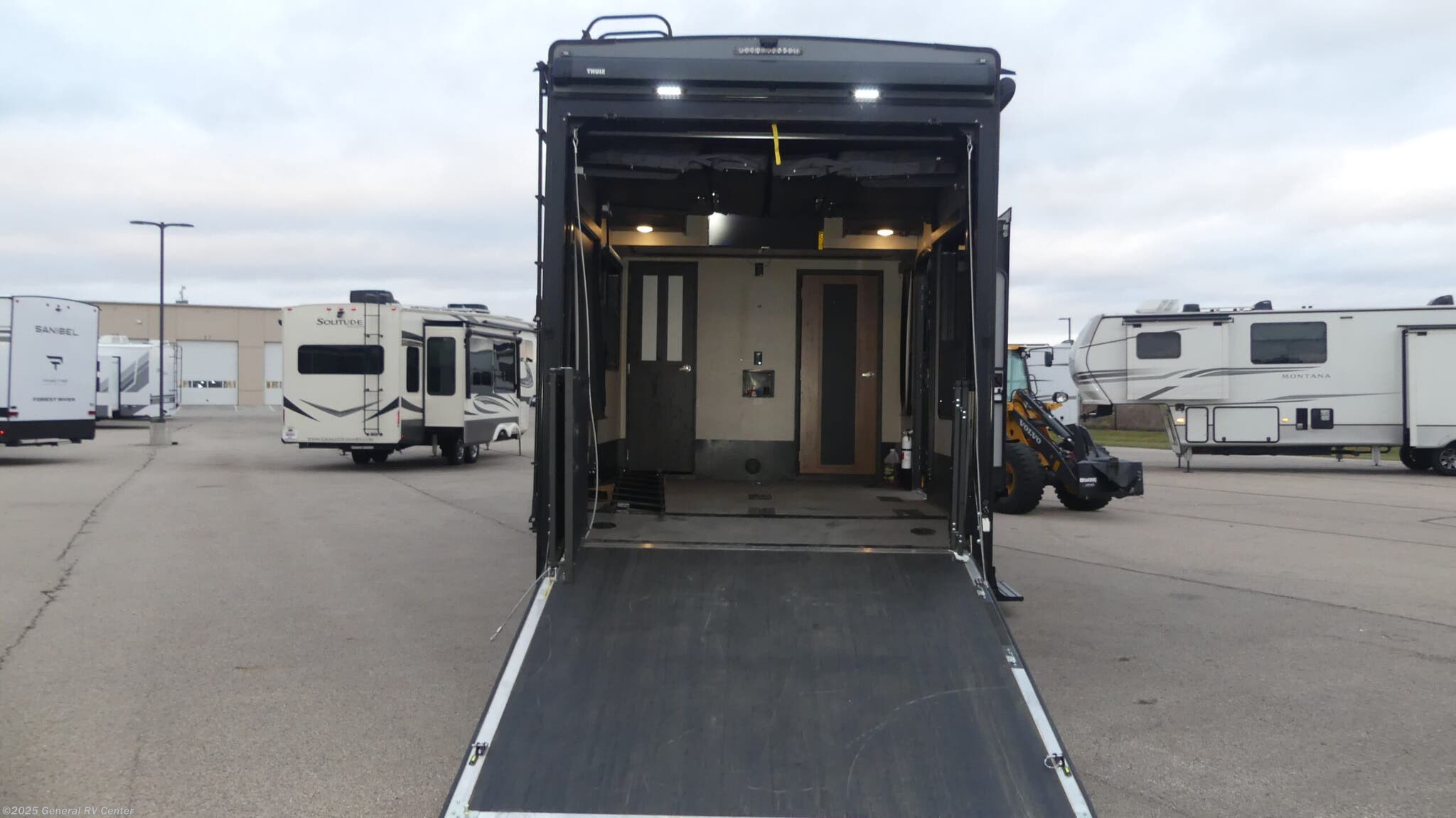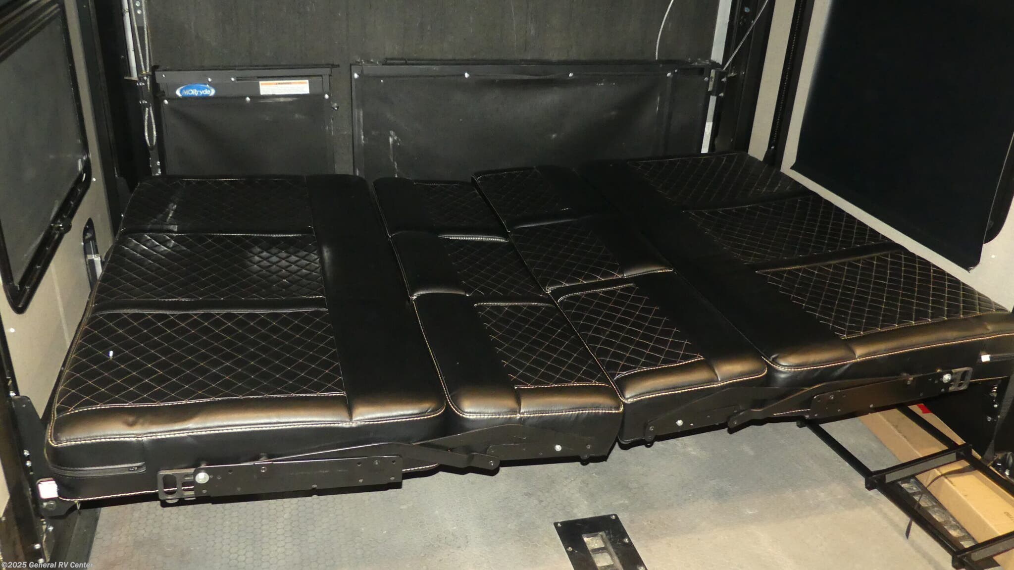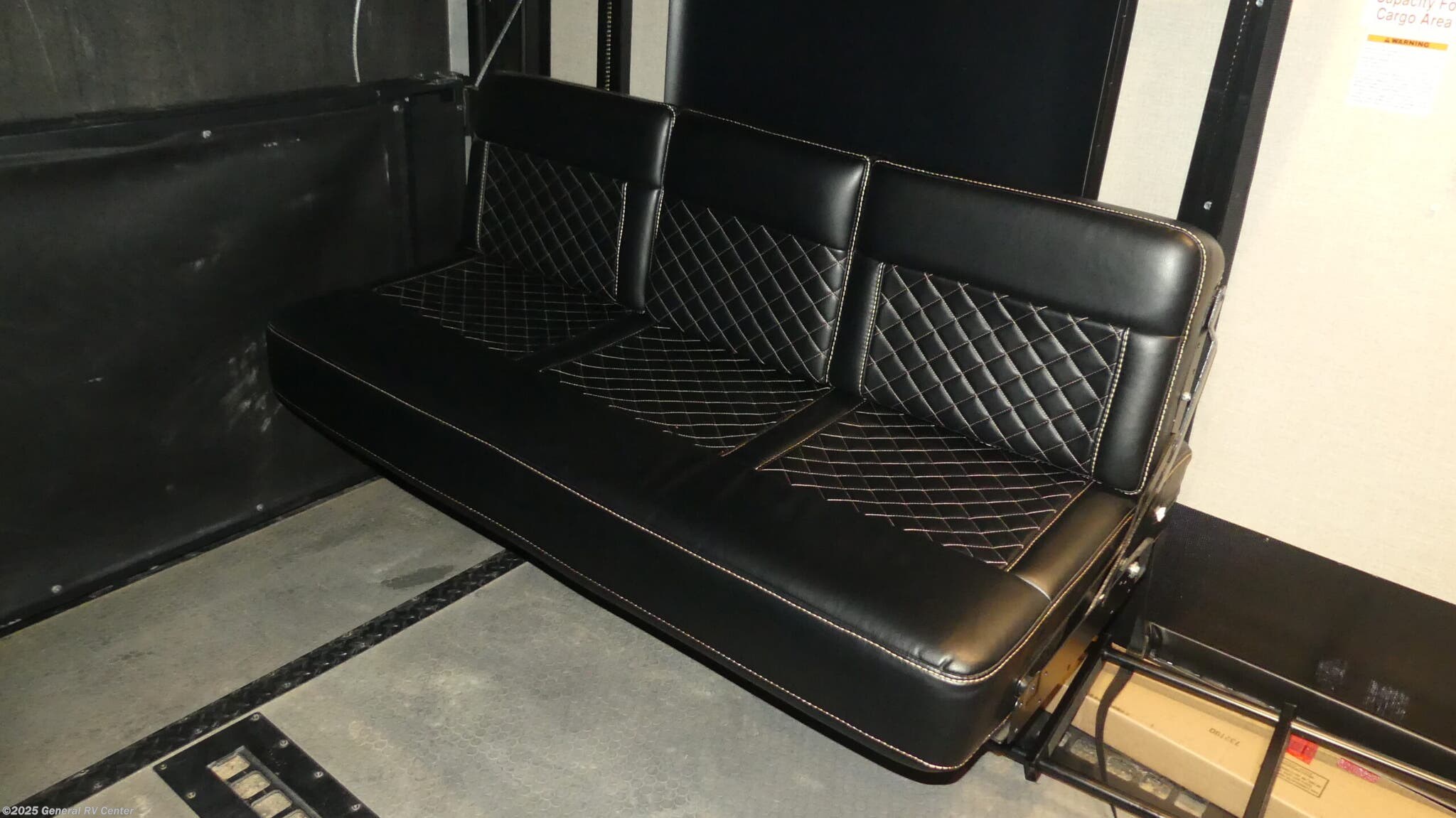 This 371 Keystone Fuzion toy hauler fifth wheel is exactly what you need for a comfortable and convenient get-a-way to the playground of your choice. That's right, pack up the big toys and head to the trails, dunes, or lakeside retreat! This unit features an 11' garage space with plenty of room for toys and a few extra friends too. Loading and unloading is a cinch with the 8' garage door. Once you are at your destination and the toys are removed the garage becomes a part of the living space with dual opposing sofas and a top queen bed that lowers from the ceiling for more sleeping space inside. There is also a loft area towards the front of the garage space that the kids will surely love. Enjoy the convenience of a half bath in the cargo, a 40" LED TV, overhead cabinets, and washer and dryer prep also. Through the door in the cargo or using the second entry door from outside you can enter the main living space with a combined kitchen and living room including two slides. The curb side slide has a large sofa. A LED TV, entertainment center, and fireplace are on the outer angled wall of the cargo half bath. The opposite slide features an 18 cu. ft. gas/electric RV refrigerator and three burner range. Next to the slide, you will find an l-shaped counter with double kitchen sink and plenty of overhead cabinets and counter area for food prep. There is also a pantry next to the refrigerator. Head up the steps to the front bed and bath. The side aisle bath features a residential shower, toilet and vanity with sink, plus a linen cabinet. The front bedroom provides a comfortable residential queen bed or choose an optional Fuzion king. There is storage on either side of the bed plus overhead cabinets too. You are sure to enjoy the flat screen TV mounted on the wall opposite the bed. You will find plenty of additional storage with a slide out wardrobe that includes drawers for more camping clothes. A 30 gallon fuel tank outside will keep everyone on the move, and there is plenty of exterior storage and dual awnings along the door side, plus so much more!