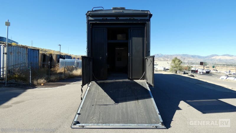 With this Fuzion toy hauler fifth wheel in tow you can be assured of a great time when you arrive at your destination. This model 423 features triple slides, one and a half baths, a loft, and a 12'6" garage for your favorite ride on toys! You will love the 8' rear ramp garage door for ease of loading your off-road toys. You will find in this garage area plenty of overhead cabinets for your gear, and a drop down top queen bed with dual opposing sofas in the rear cargo space for added sleeping and seating once things are unloaded at camp. There is also a loft in front, a space prepped for a washer and dryer if you choose to add, and a 40" LED TV. A convenient half bath is an added bonus so you can keep all the dirt and grime out of the main living quarters. Enter the living space through the interior garage door, or through the centrally located side entry closest to the front. Here you will find a wide open space that contains the kitchen and living room. There is a slide out 18 cu. ft. gas/electric RV refrigerator or choose an optional residential refrigerator and three burner range, plus a counter peninsula off the outer angled 1/2 bath wall that also features an LED TV. You will also find a pantry for your non-perishables, and overhead cabinets for ample storage for your dishes and things. The opposite side of the main living space features a slide out sofa, and there is also a smaller sofa along the interior wall with storage overhead. Head up the steps in front to the right of the main door to a front master bedroom and bath. The bath is first on your left at the top of the steps and features a residential shower, toilet, and vanity with sink. There is a door in the hall, plus a second door that slides and leads you into the front master bedroom where you have immediate access to the wardrobe slide from inside the bath. The master bedroom is spacious thanks to the large slide out wardrobe and drawers. You will easily be able to get a great night's rest on the residential queen bed. There is also storage overhead, and beside the bed, plus so much more!