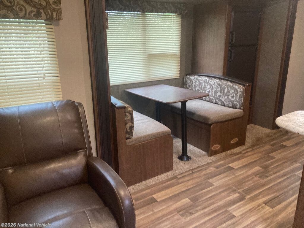 Inside, the 252LHS features a smart rear living floorplan with a large slide-out that opens up the main living area. The comfortable lounge chairs provide a relaxing space to unwind, while the booth dinette offers a great place to dine, work, or convert into additional sleeping space. Large windows throughout the rear living area bring in natural light, creating a bright and welcoming atmosphere.