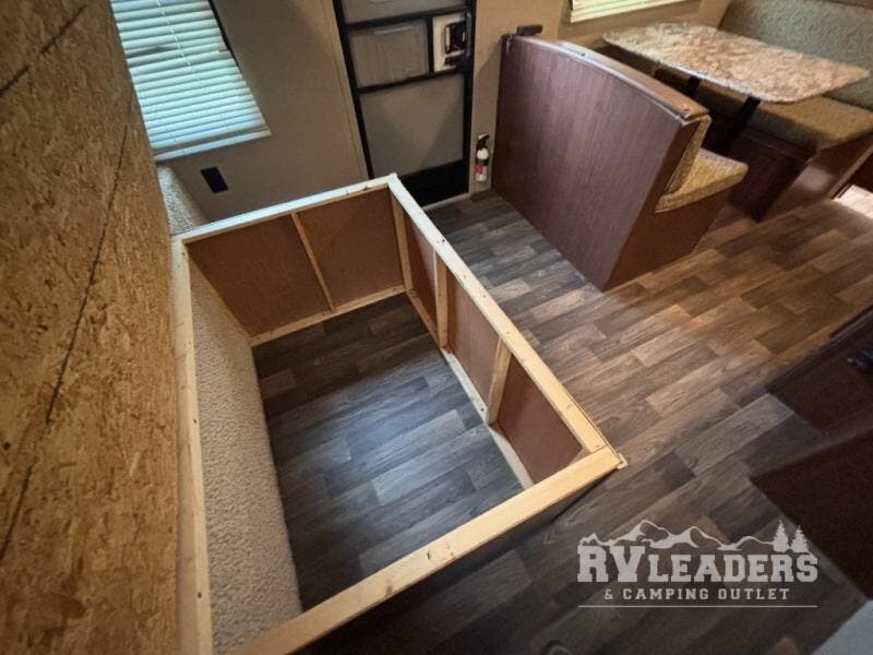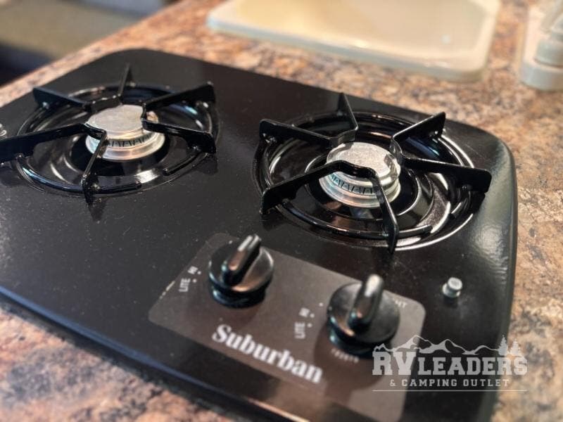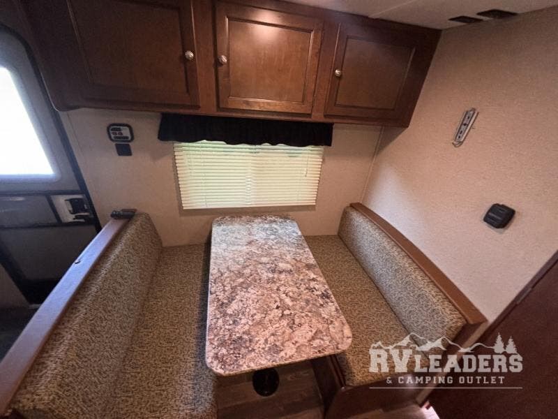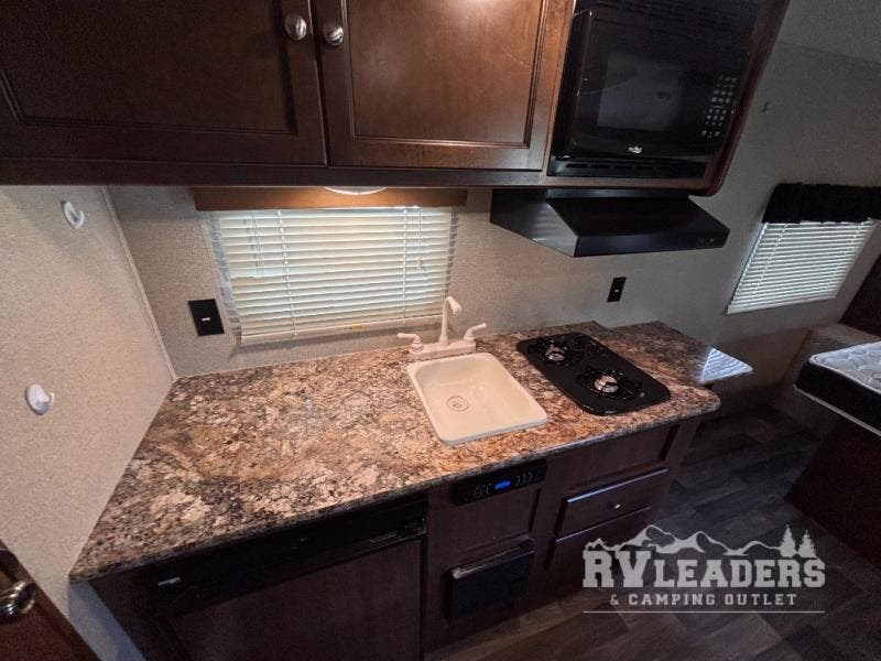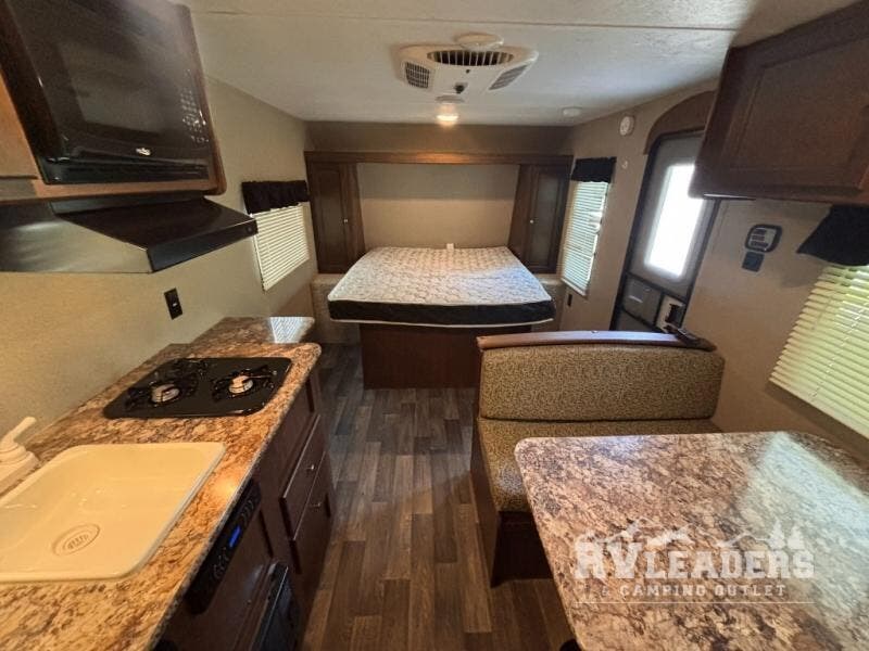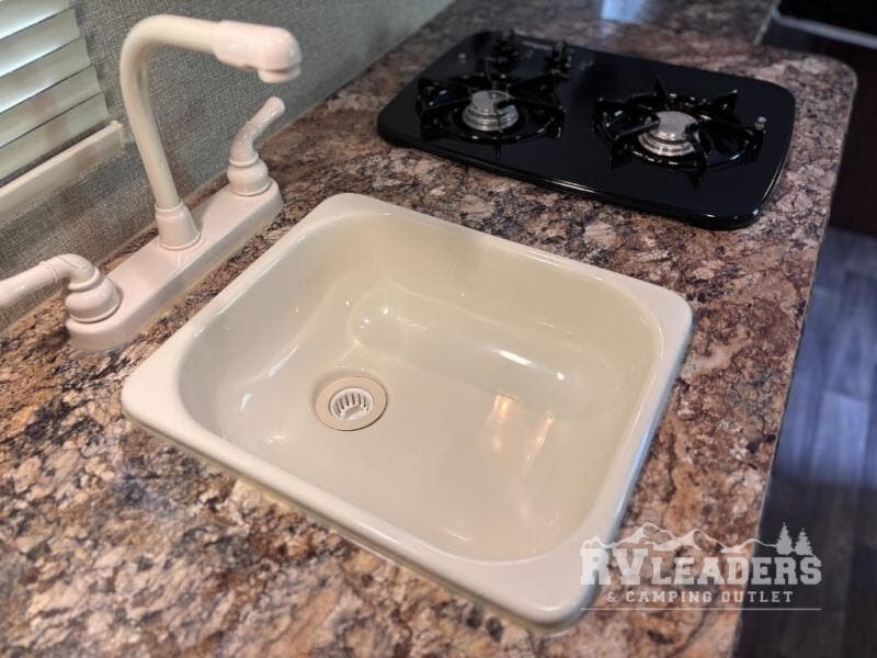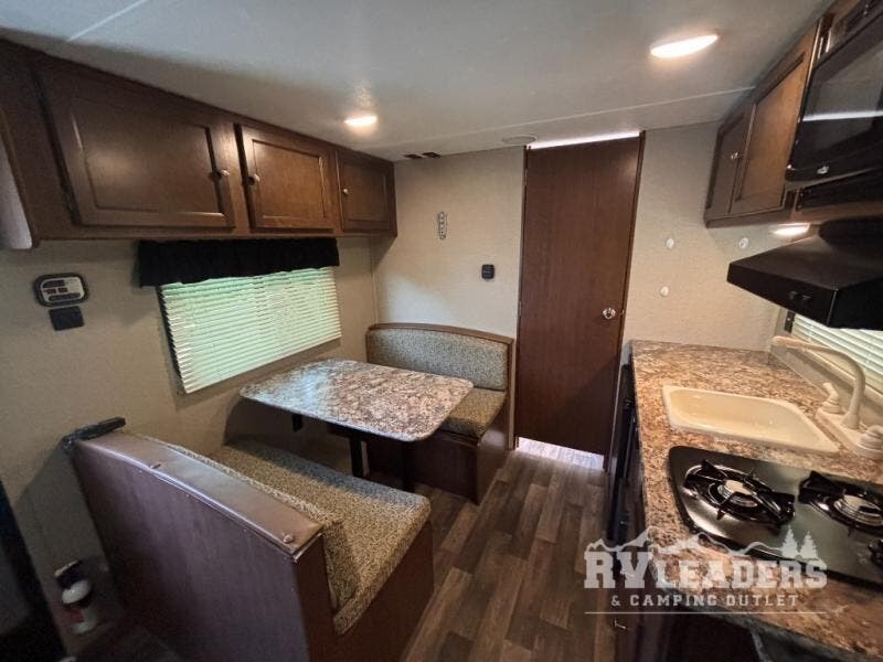 A booth dinette is located to the left of the entry door and features an overhead cabinet above. Across from the dinette you will find counter space, a single sink, and a two burner cook-top for light meals and snacks. There is plenty of storage with upper and lower storage for your things.