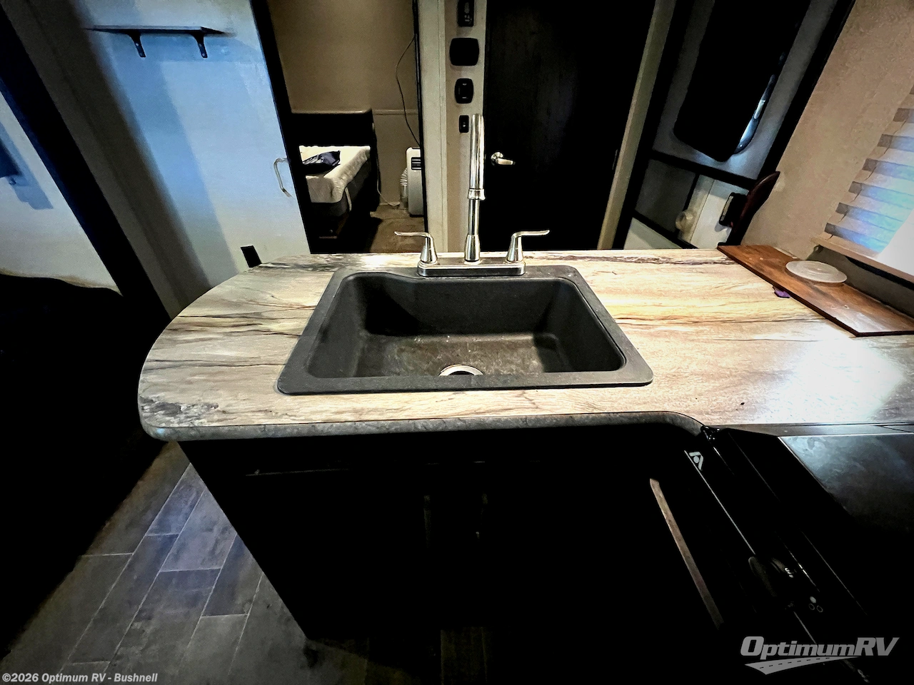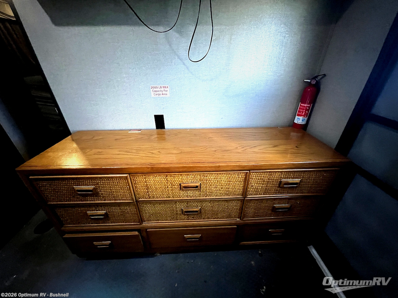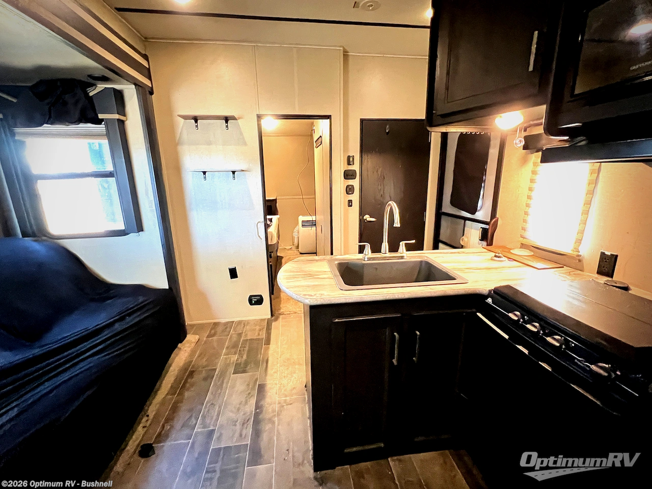 The front bedroom features a residential queen bed slide. Along the front of the room there is a dresser for added storage, a corner wardrobe, and much more!