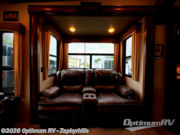 Opposite find a slide out with theater seating, and another slide out with a residential refrigerator, convection microwave oven, and three burner range. There is also counter space and additional storage. A nice pantry is adjacent along the interior wall straight in from the door which includes additional cabinet space both above and below. A convenient island is available in the center of the room and features double sinks for easy cleanup. Don't forget about the hide-a-bed sofa with end tables and overhead cabinets along the rear wall of the fifth wheel.