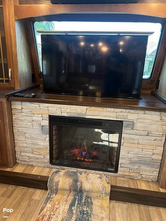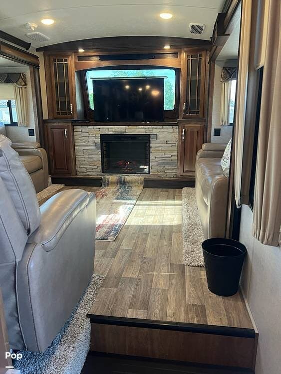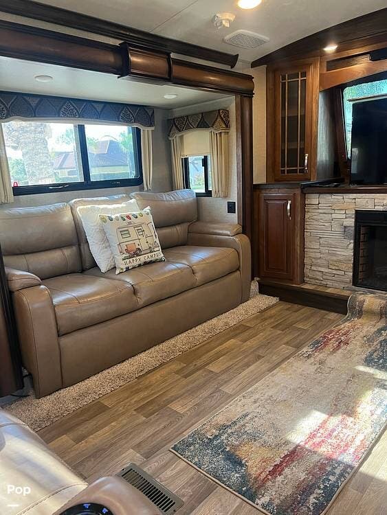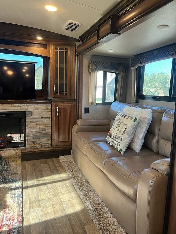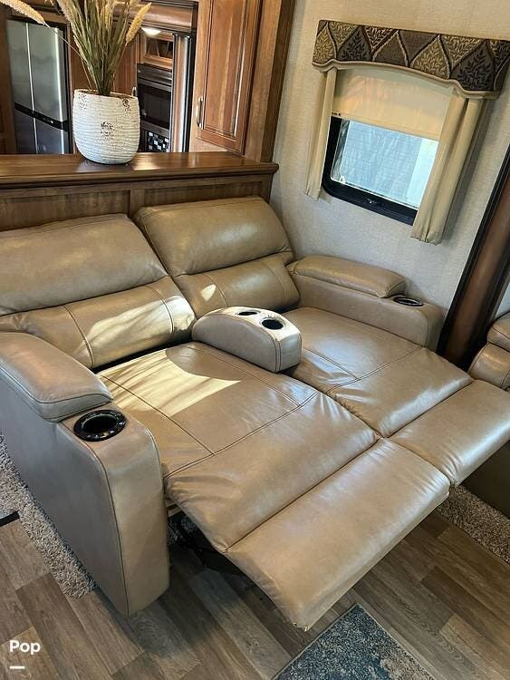 Enjoy the spacious front living area with two tri-fold sleeper sofas, power theater seating, an LED TV, surround sound, and an elegant fireplace -- your perfect retreat after a day of exploring new horizons.