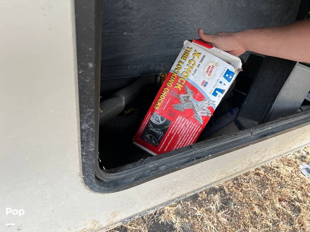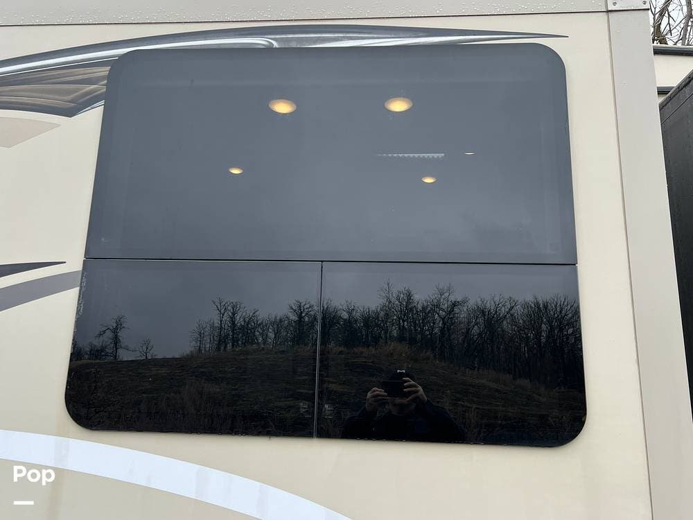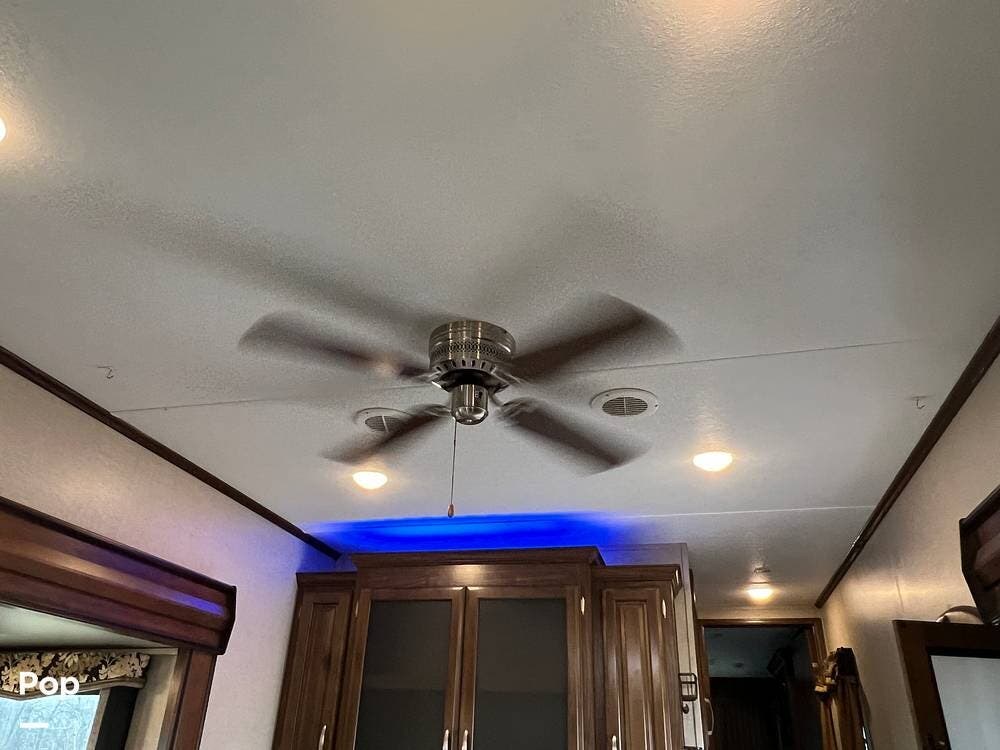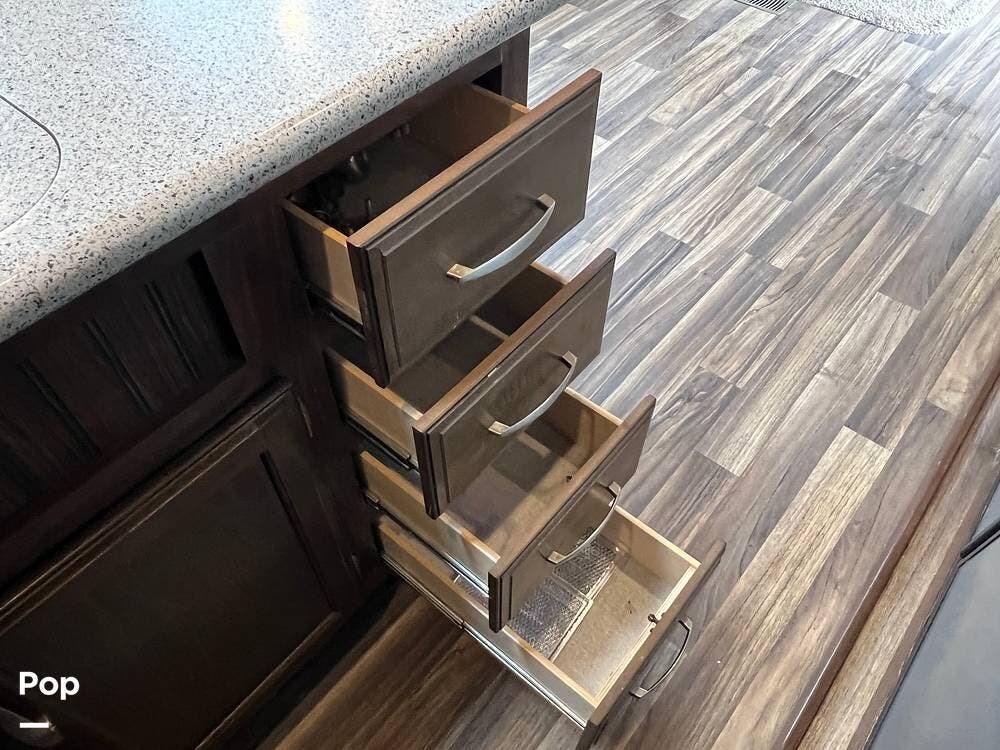 Four spacious slide-outs expand the interior, offering an open-concept layout that feels more like a home than an RV. The exterior is equipped with an electric awning, pass-through storage compartments, and a rear ladder for roof access.