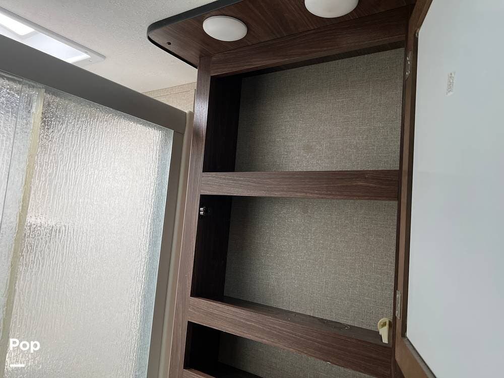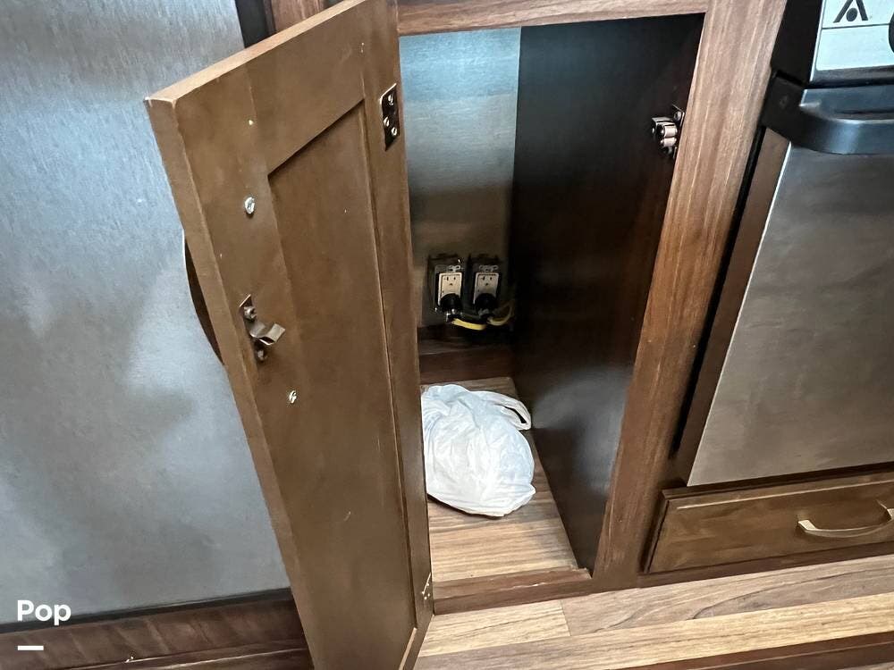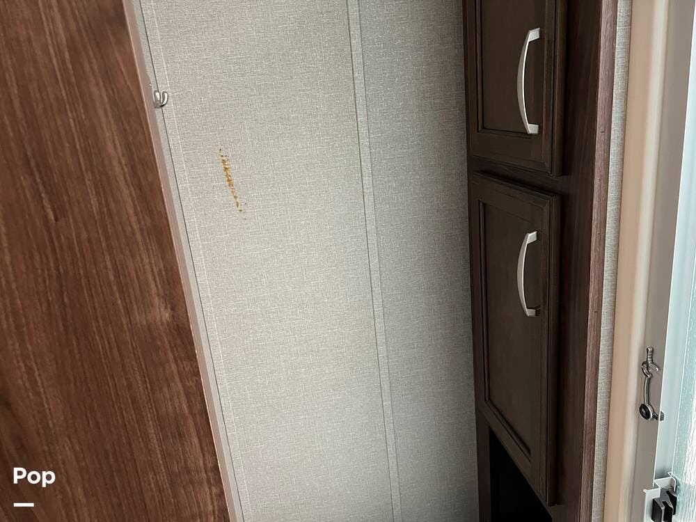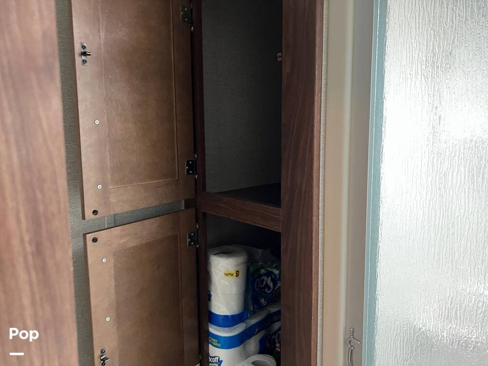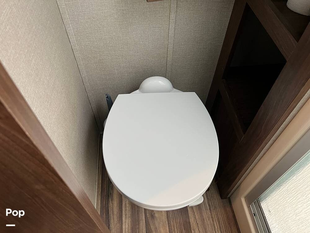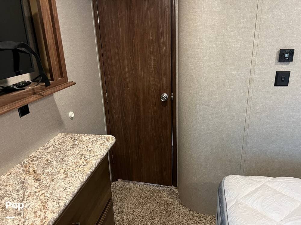 Toward the front of the unit, the master bedroom provides a private retreat after a day of adventure. It features a queen-size bed with a premium mattress, bedside storage, and overhead cabinets. A full-size wardrobe and dresser offer generous clothing storage, and washer/dryer prep is available for added convenience. The soft lighting and neutral color palette create a peaceful environment perfect for a restful night's sleep, whether you're parked in the mountains or by the beach.