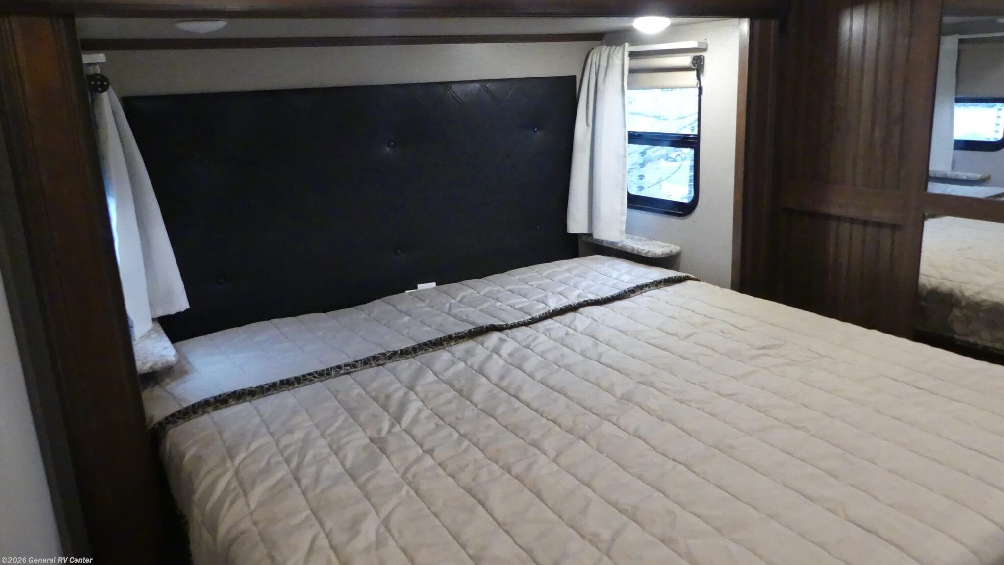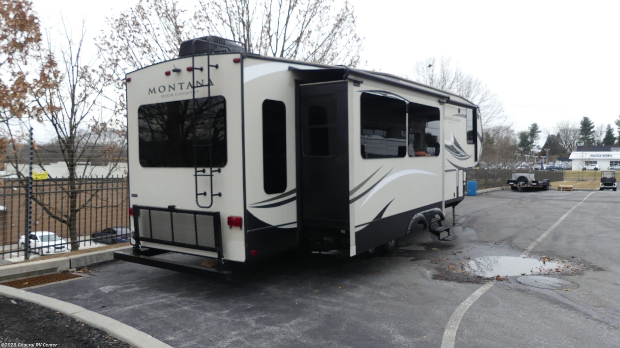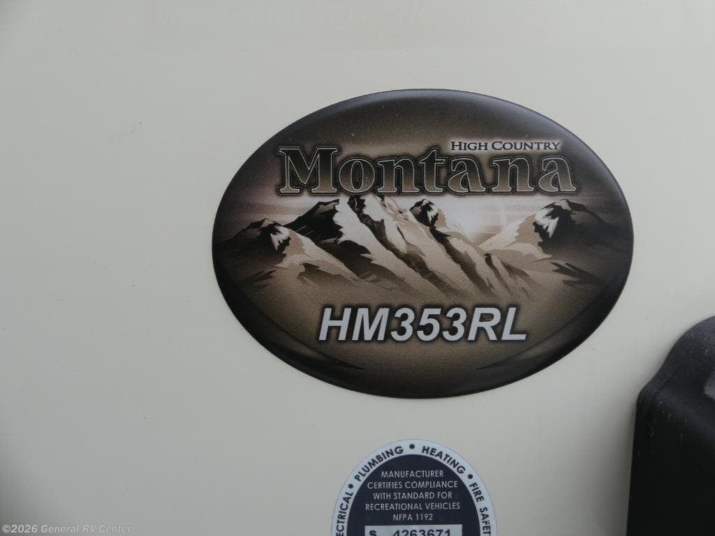 This Keystone Montana High Country fifth wheel model 353RL features triple slides for added interior space, a rear living layout, and a convenient kitchen island, plus more! As you enter notice the coat closet to your right and how open the main living space is with dual opposing slides fully extended to your left. There is a slide out dinette with four chairs and theater seating to the left of the door. Along the rear wall find a hide-a-bed sofa with overhead cabinets that stretch the entire width of the fifth wheel. Adjacent to the hide-a-bed there is an entertainment center slide with HDTV and optional fireplace below. This slide also features a pantry for food storage needs, counter space, a three burner range with overhead residential microwave oven, and a residential refrigerator. A convenient kitchen island offers additional storage and counter space, plus it is where you will find the double sink for cleaning up. A nice hutch is located along the interior wall straight in from the entry door for storage. Head up the steps to a side aisle bath and front bedroom. Inside enjoy the convenience of a linen cabinet, toilet, sink, and 48" x 30" shower with seat. The front master bedroom is behind the door at the head of the hall and provides a welcome retreat with a queen or optional king bed slide including storage beneath the bed. A dresser is found opposite the bed along the curb side wall along with a 32" HDTV, a seating area, and the front wall features a wardrobe with washer and dryer prep, plus so much more!